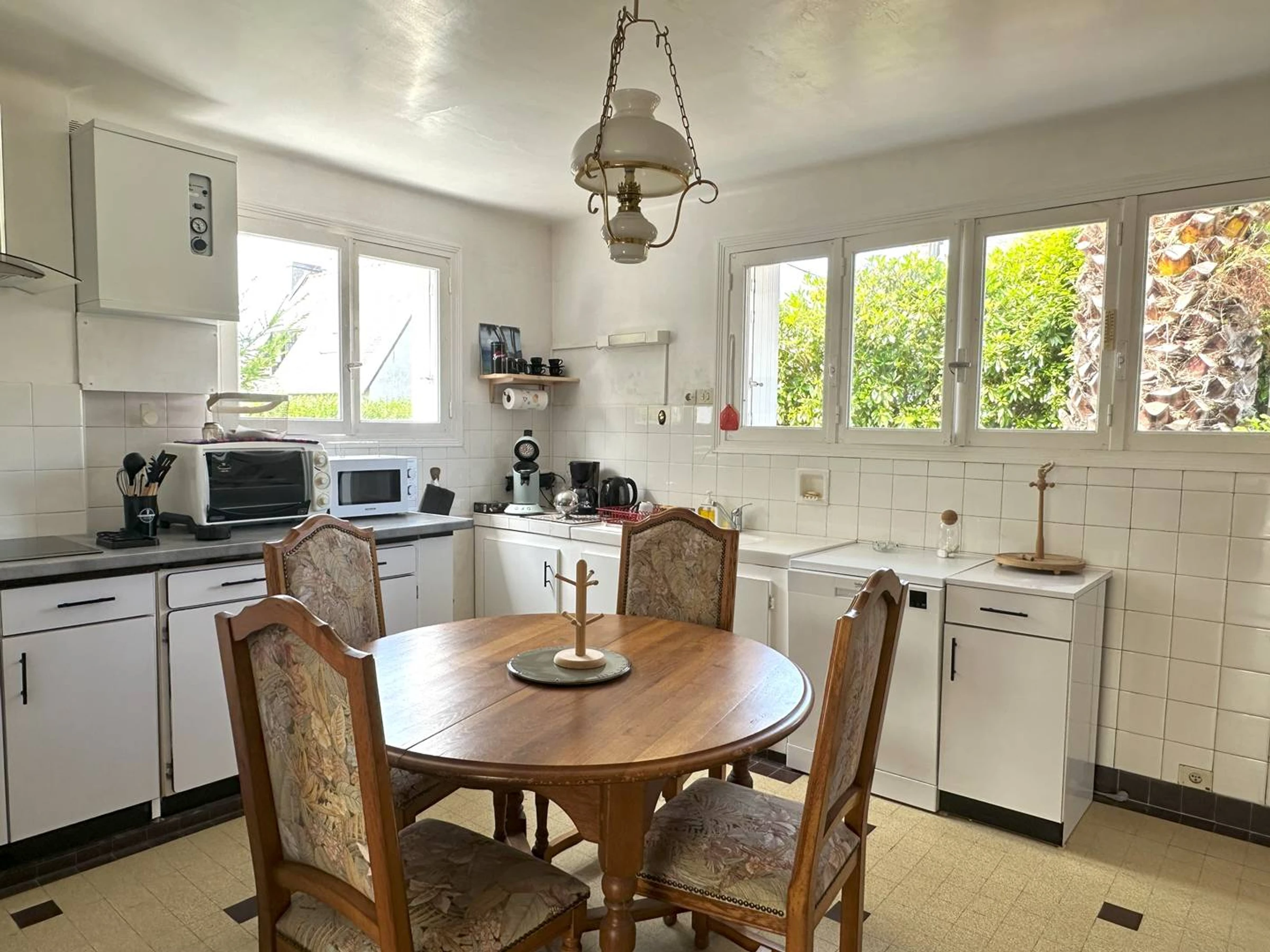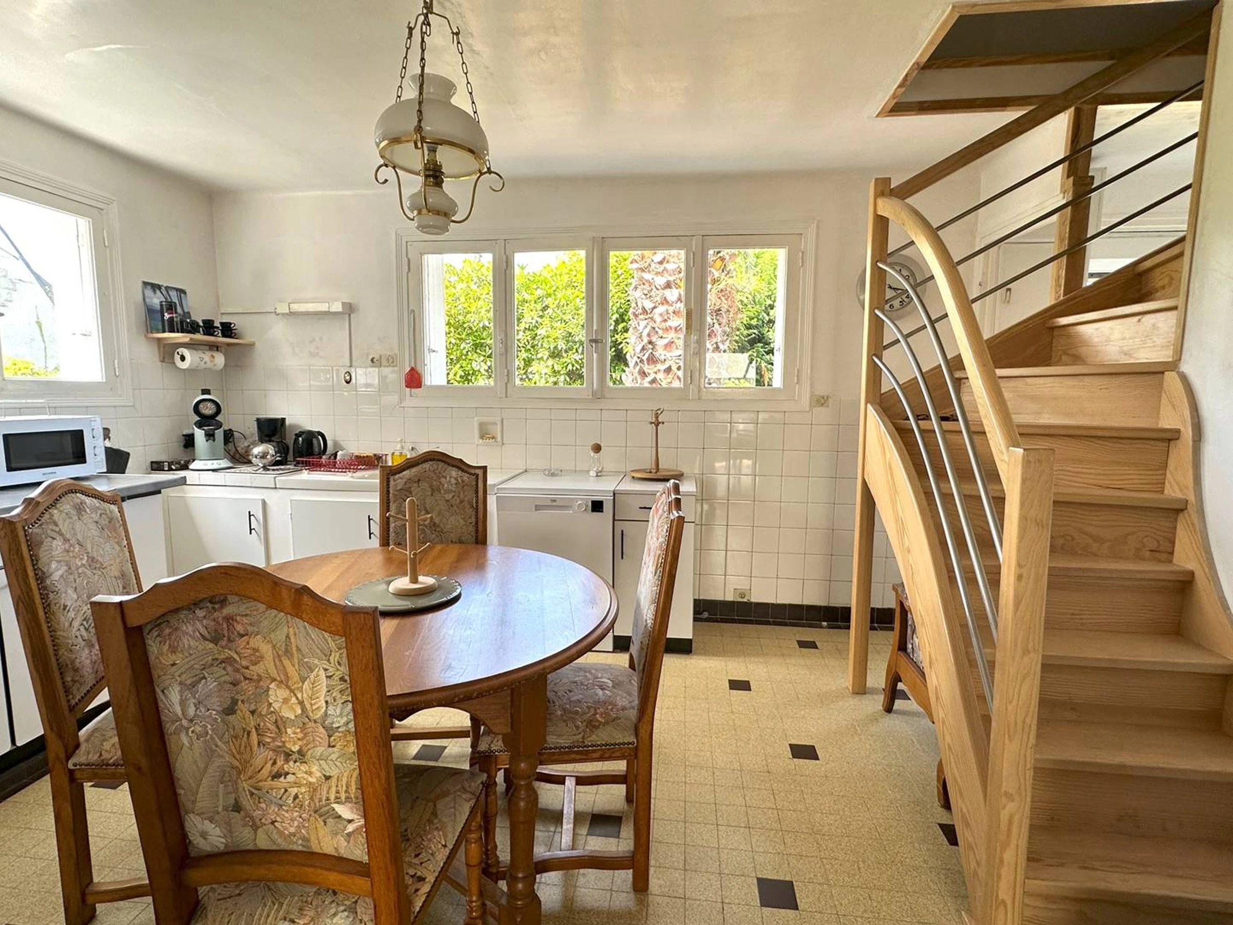 1 cuisine équipée avec plaques 4 feux induction, lave-vaisselle, petit four, micro-ondes, réfrigérateur congélateur, cafetière filtre et Senseo -