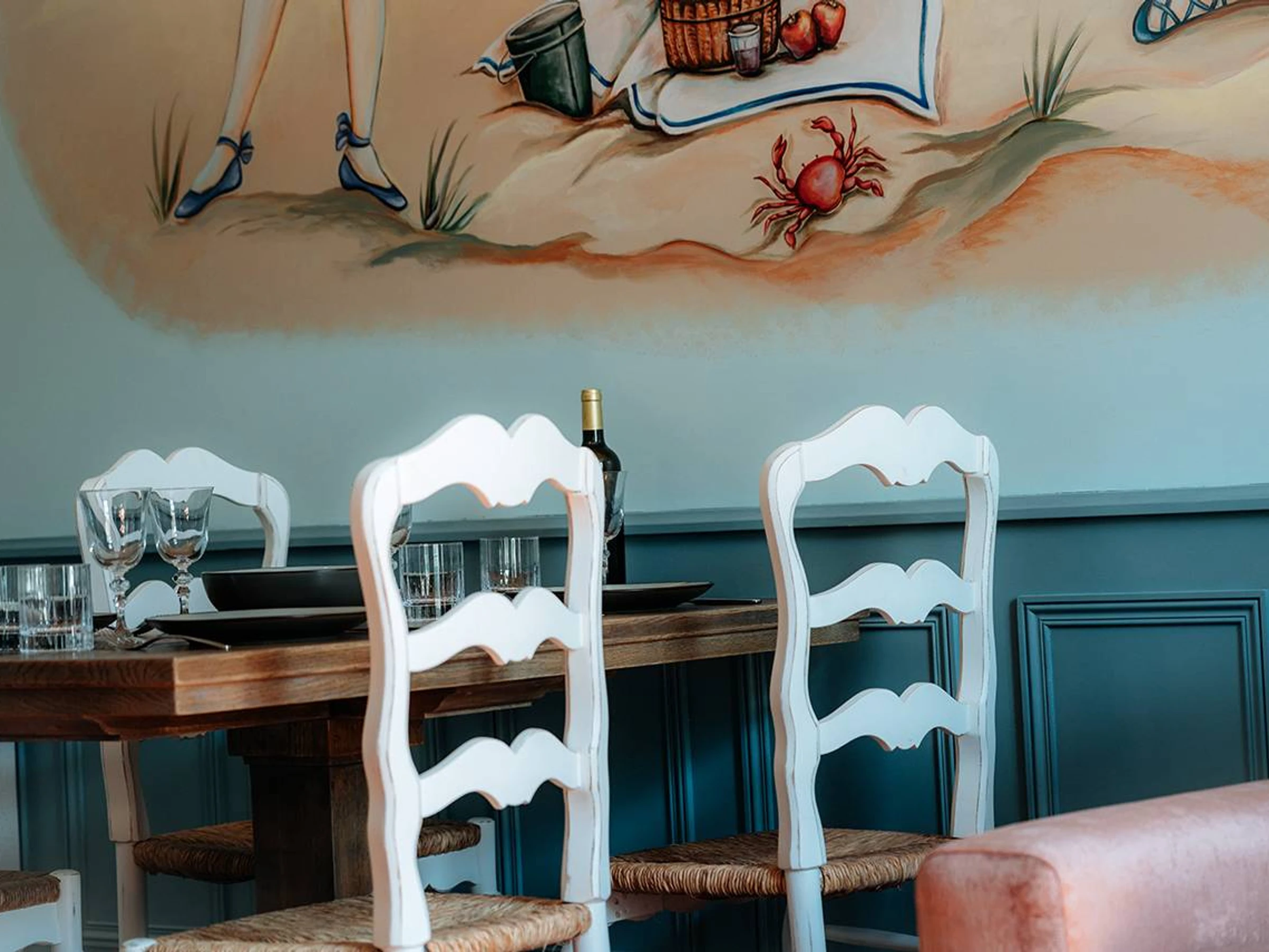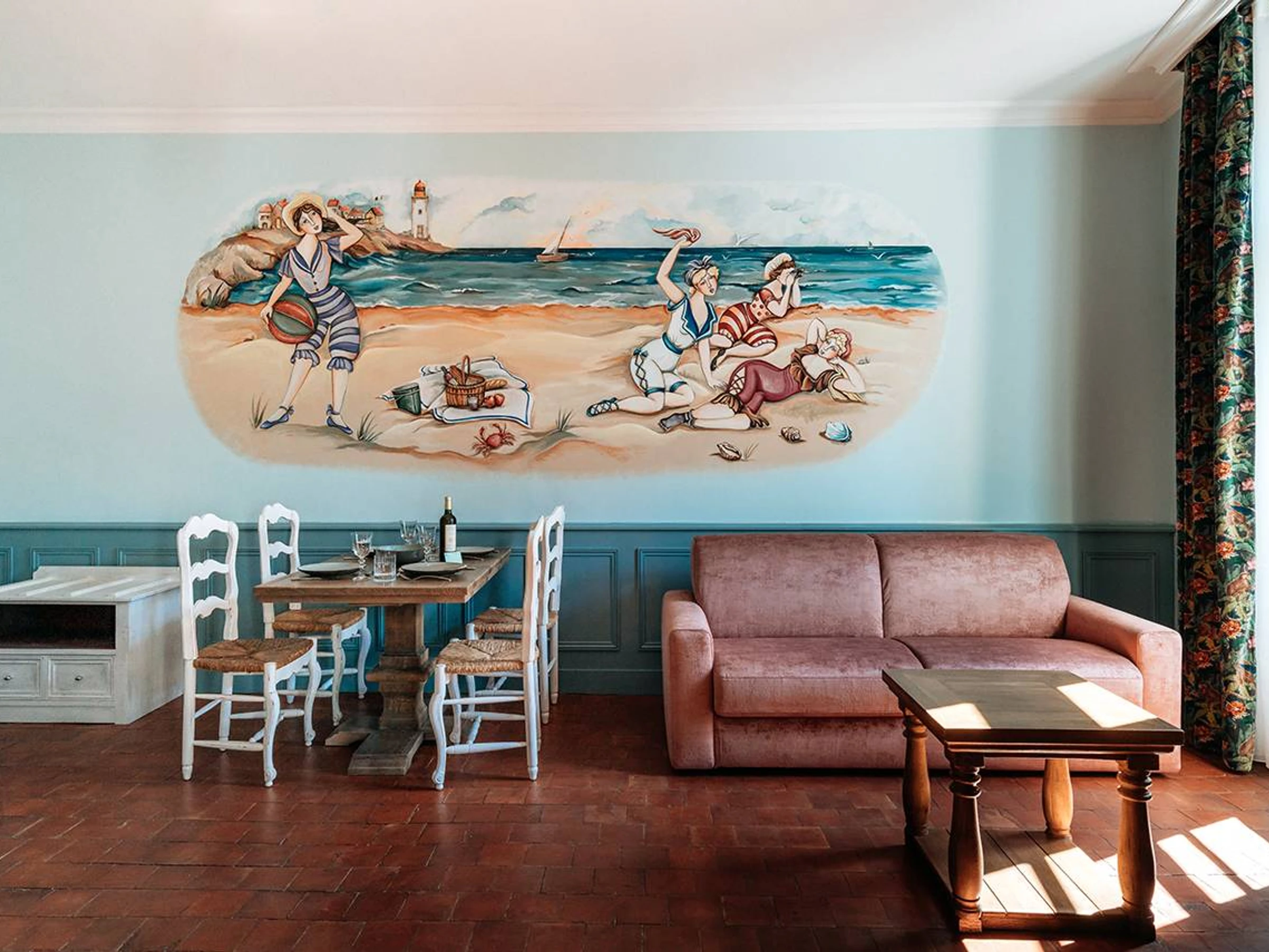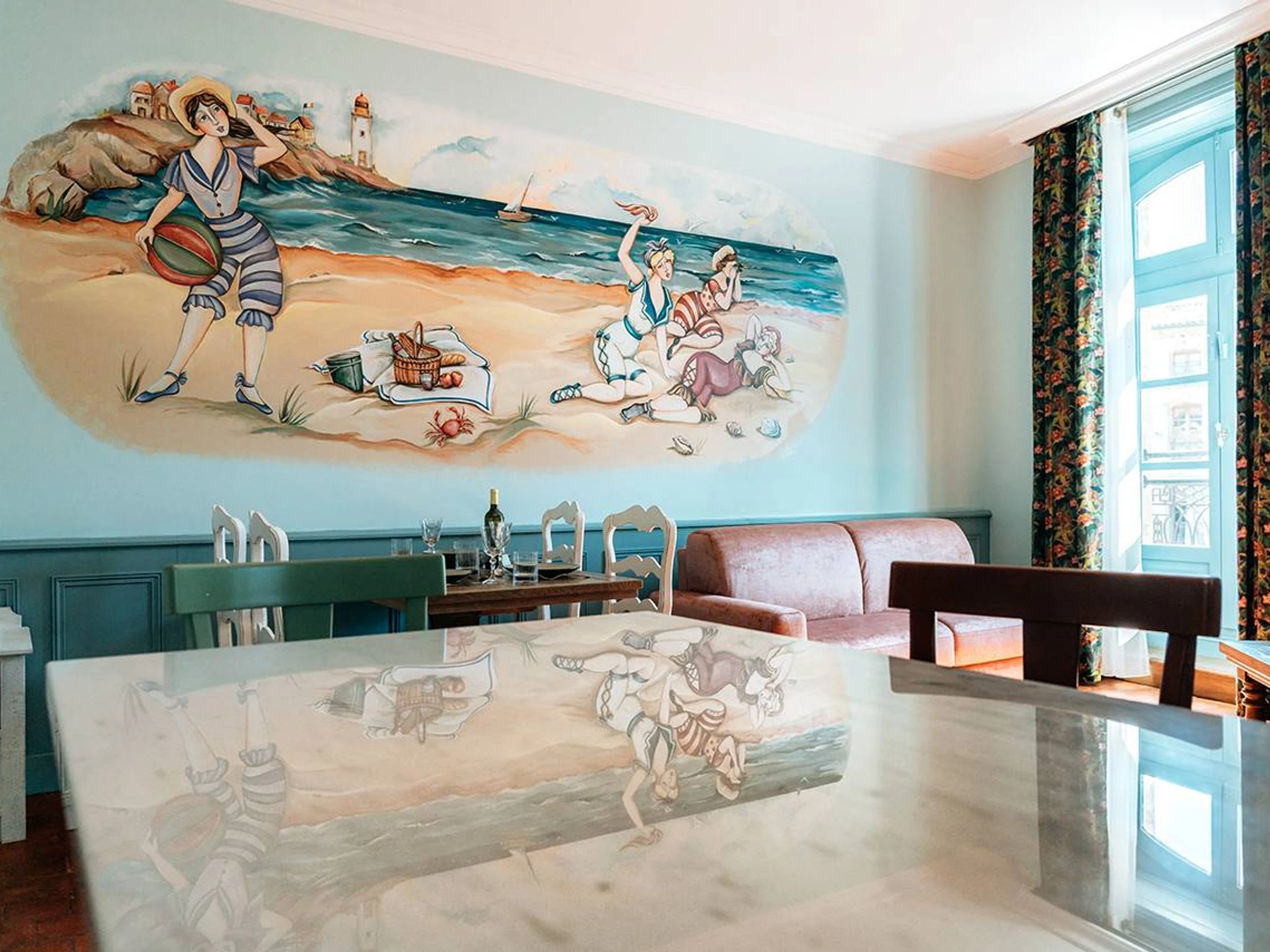 Situé au 2e étage, sur un grand mur bleu apparaît une œuvre. C’est une fresque de Madeleine Ossikian, artiste peintre de Pezenas. Une invitation à se prélasser sur la plage, il suffit de s’asseoir et de se laisser aller. Ici, nous sommes ancrés dans le début du 20e siècle. Un petit voyage dans le temps, que du bonheur pour prendre son temps.