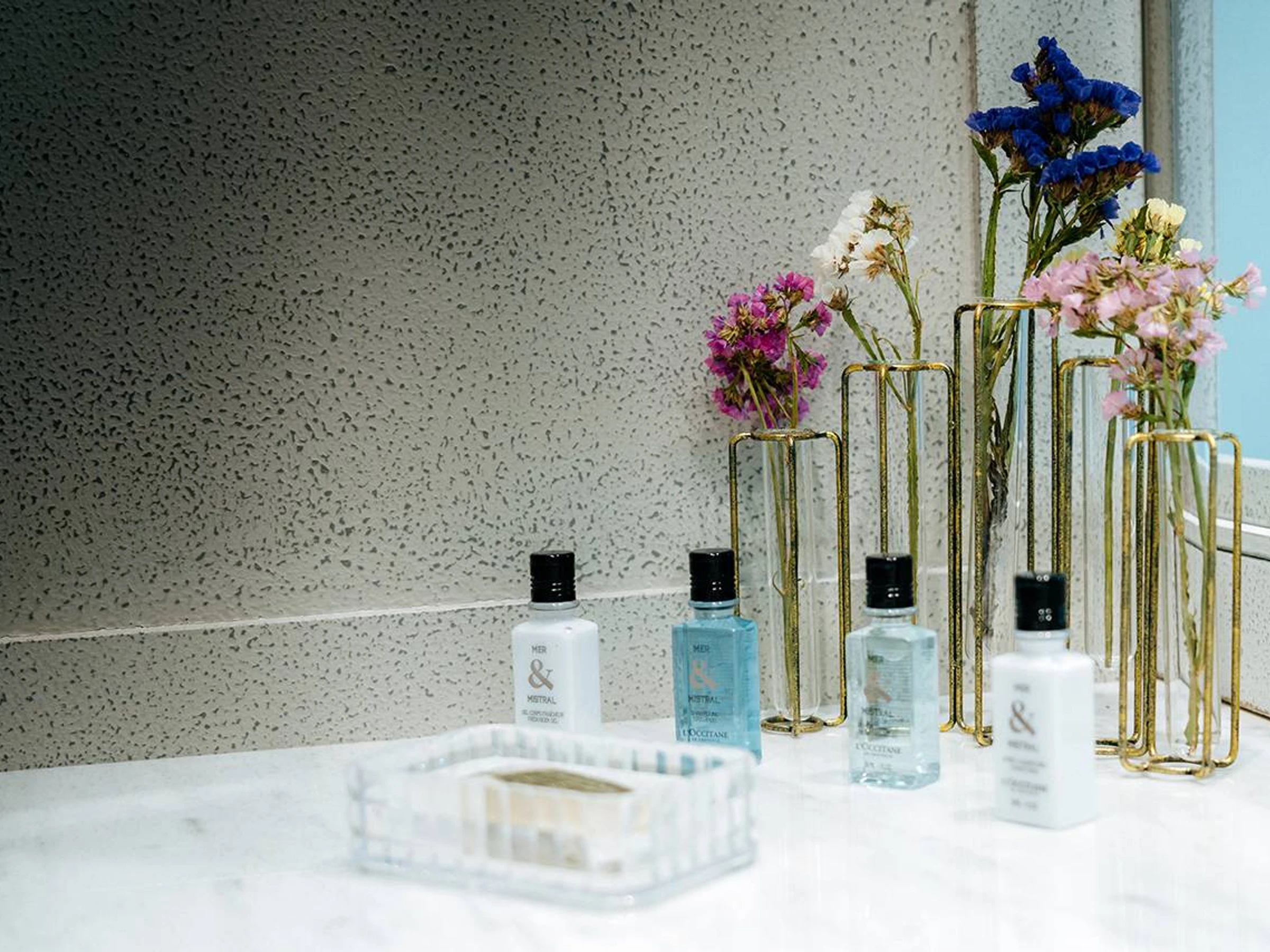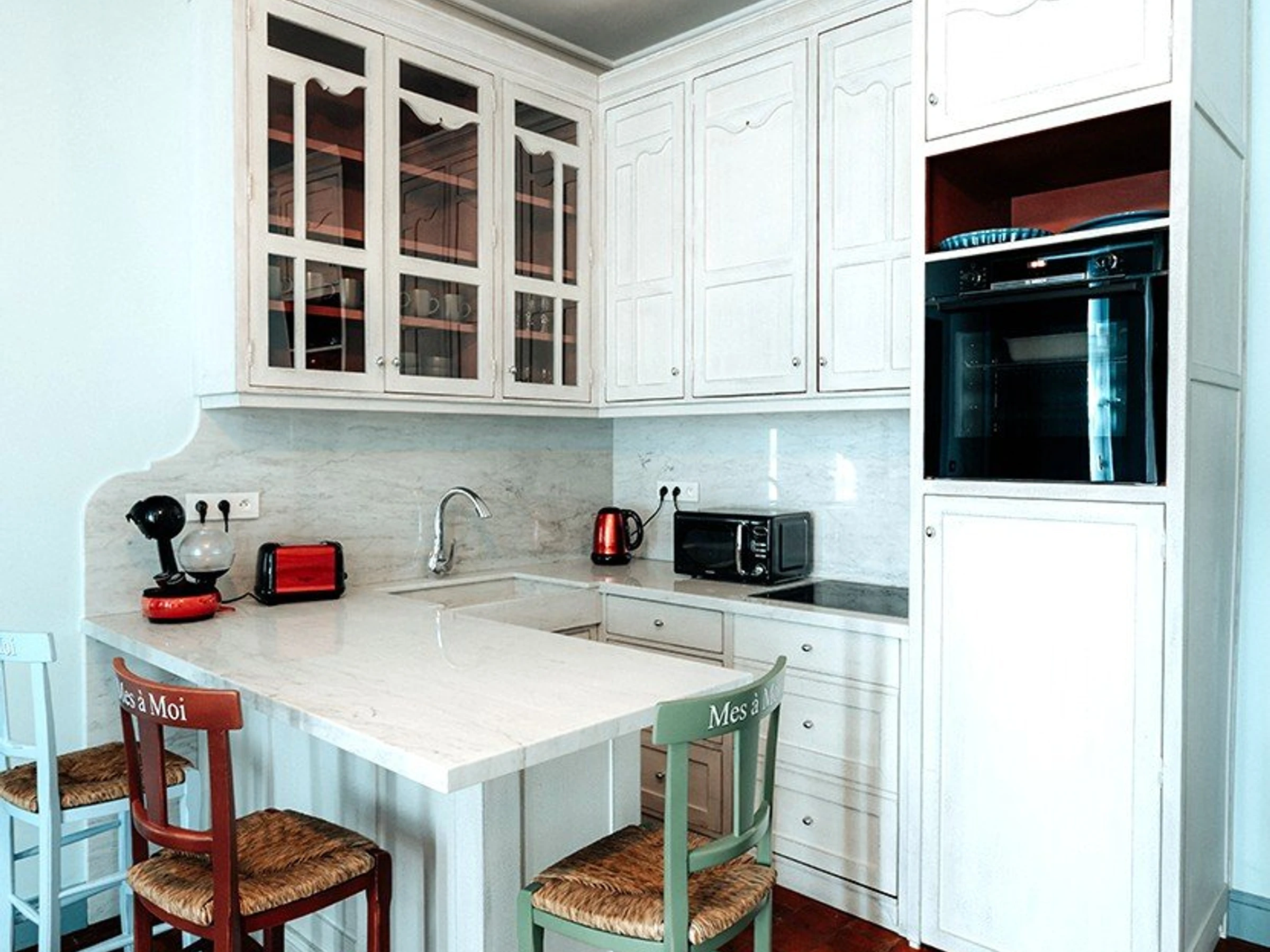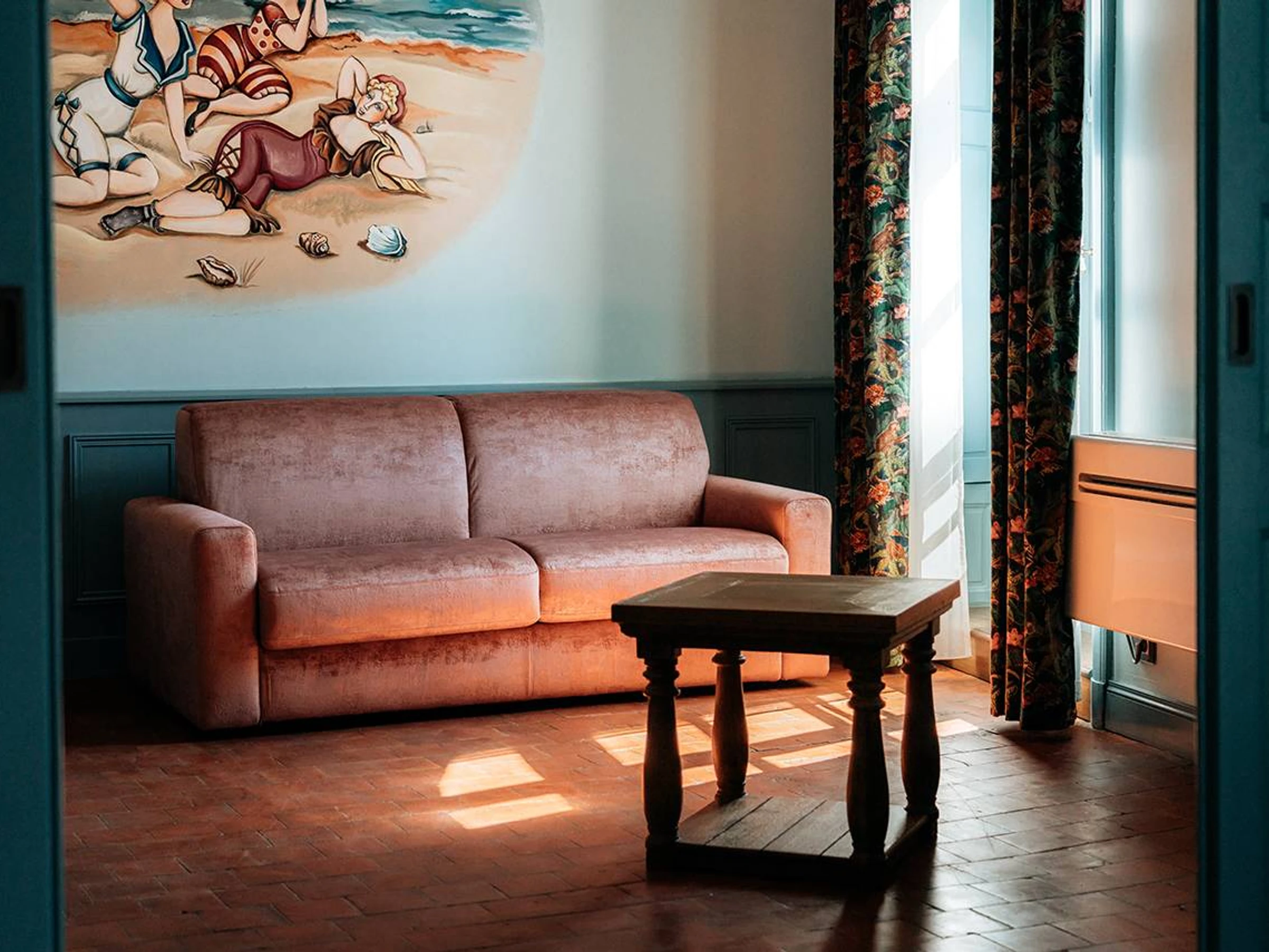 Situé au 2e étage, sur un grand mur bleu apparaît une œuvre. C’est une fresque de Madeleine Ossikian, artiste peintre de Pezenas. Une invitation à se prélasser sur la plage, il suffit de s’asseoir et de se laisser aller. Ici, nous sommes ancrés dans le début du 20e siècle. Un petit voyage dans le temps, que du bonheur pour prendre son temps.