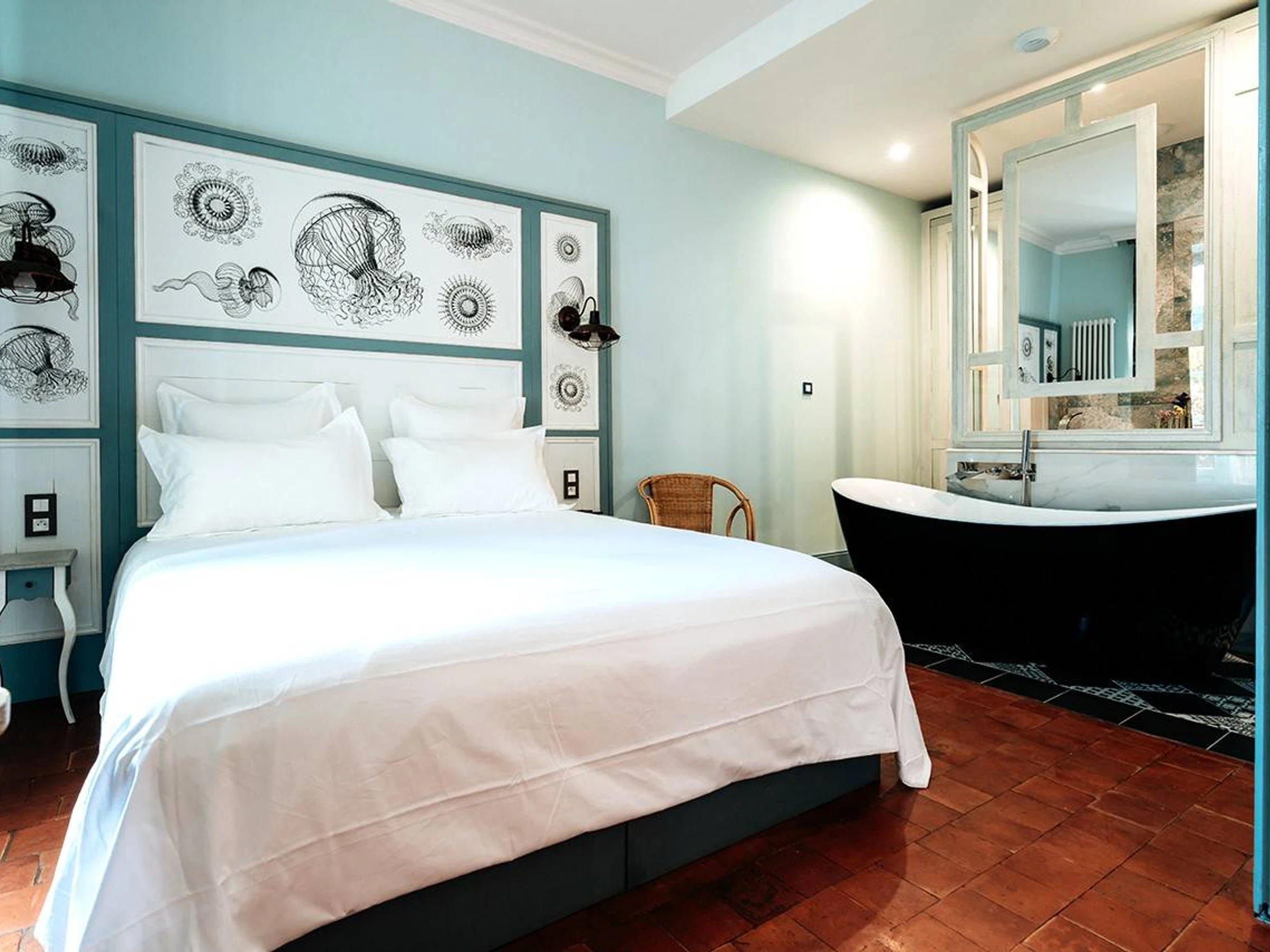 La chambre est dotée d’une salle de bain en suite, d’une baignoire balnéo et d’une douche.