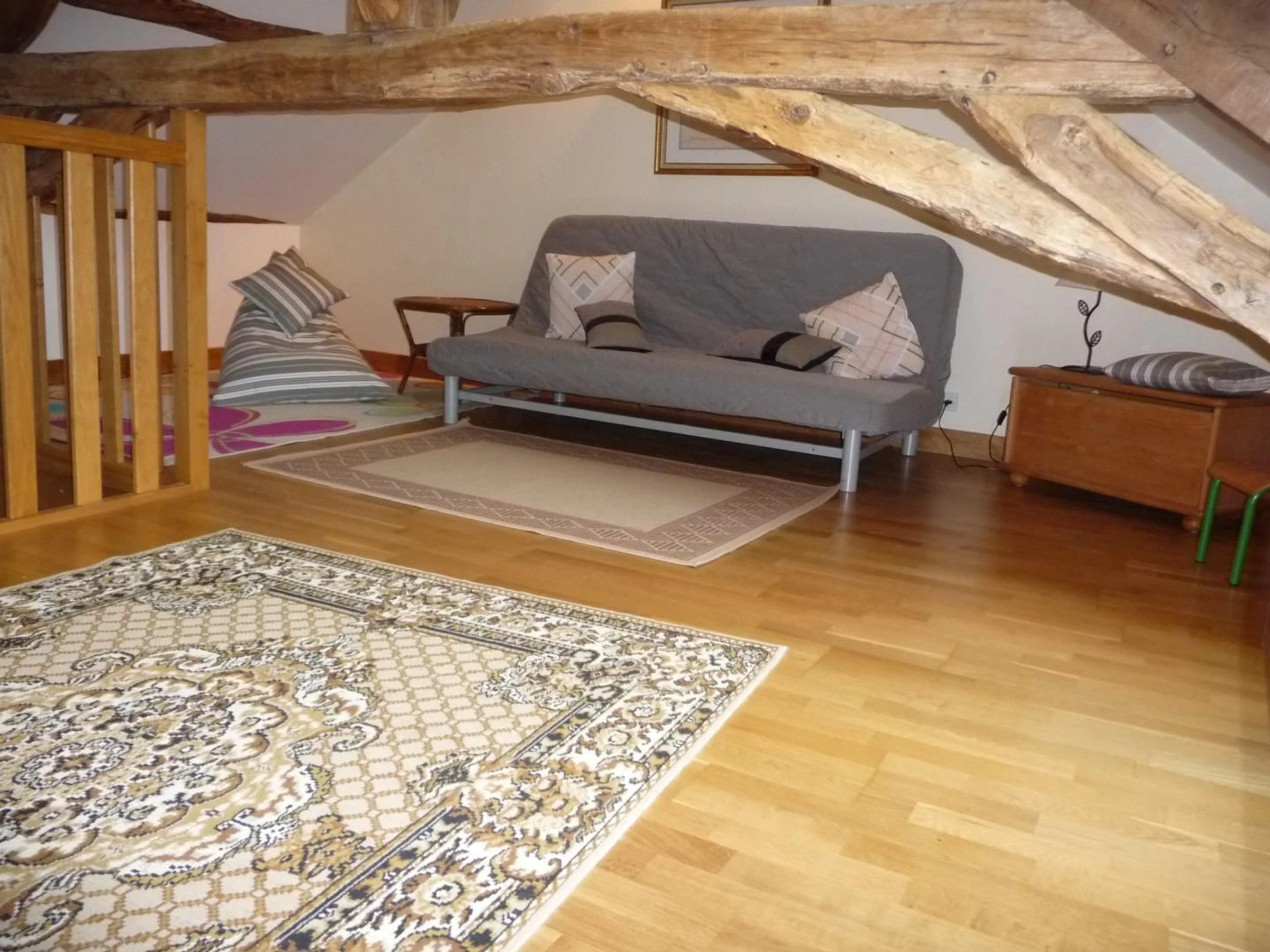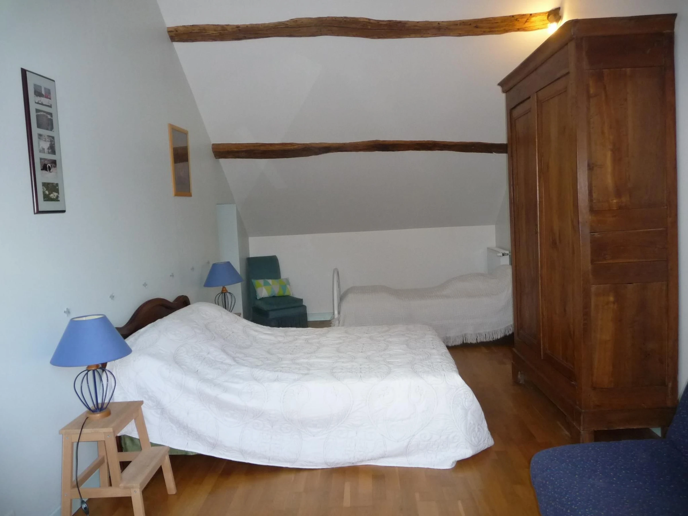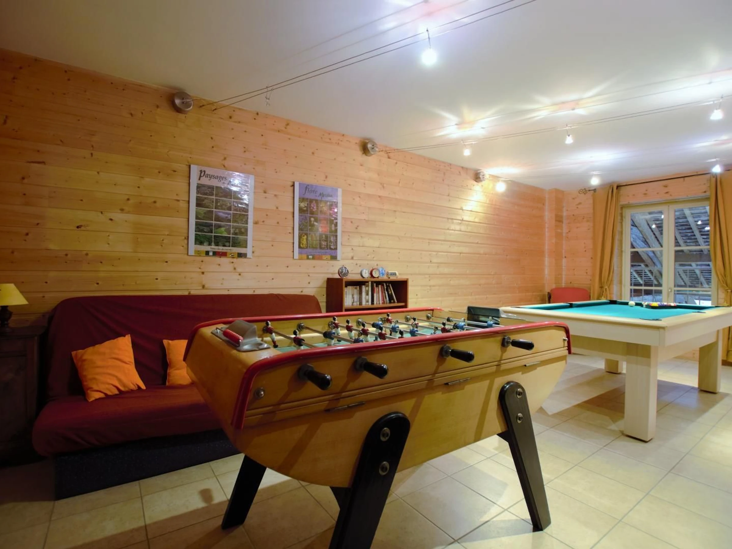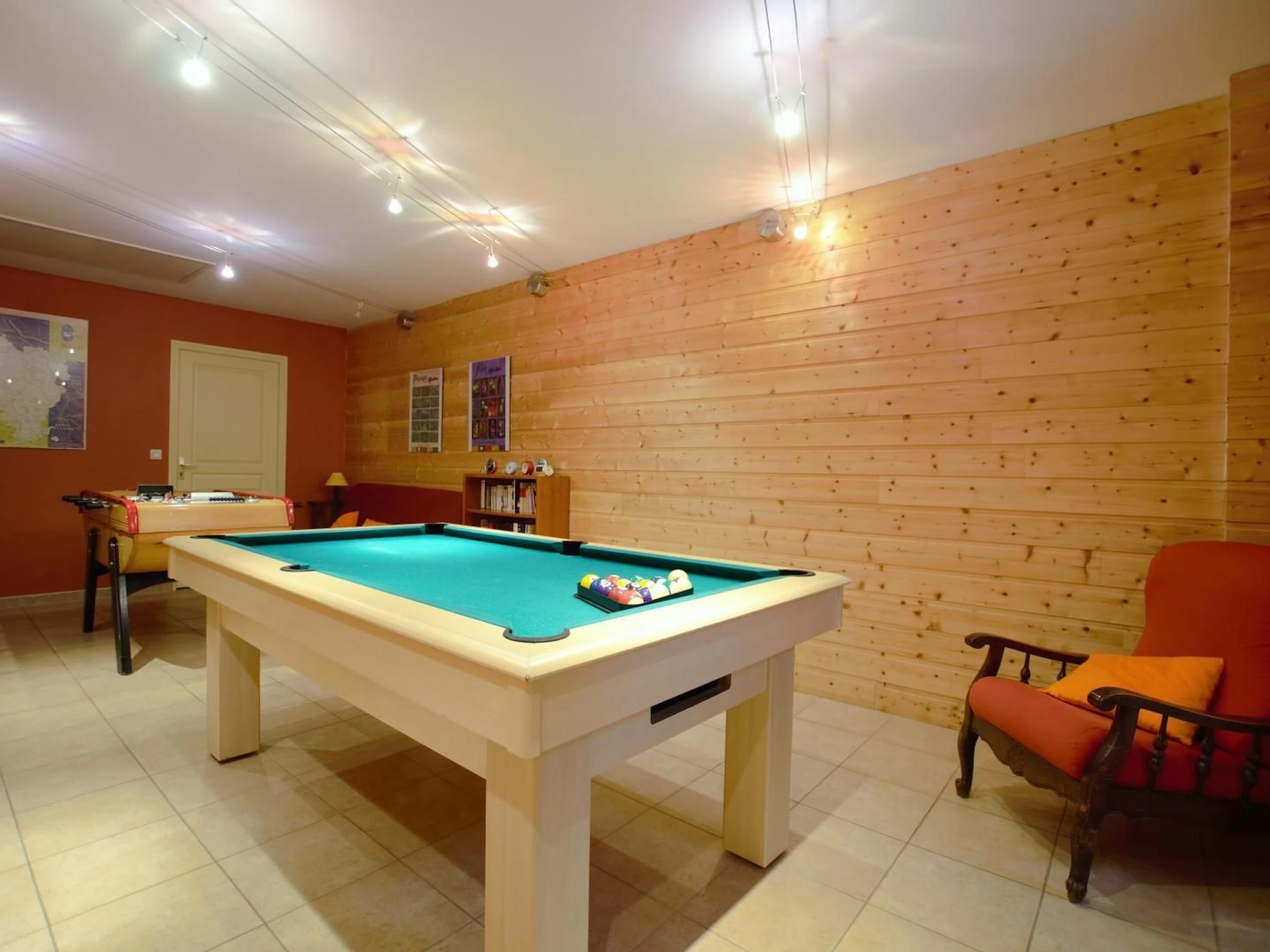 2ème étage (vers mezzanine, chambre bleue) : 1 lit 140x190 + 1 lit 90x190) et mezzanine aménagée en salle détente (billard et baby-foot). Lecteur CD+radio.
