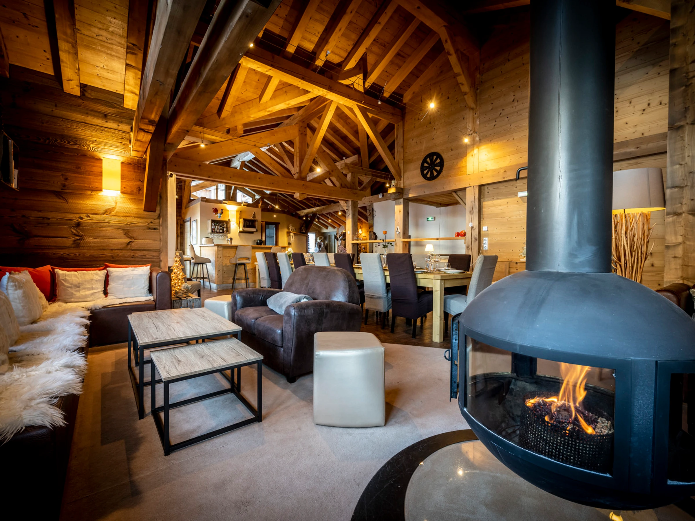 - Espace salon avec 2 coins canapés, cheminée suspendue (granulés de bois), TV écran plat