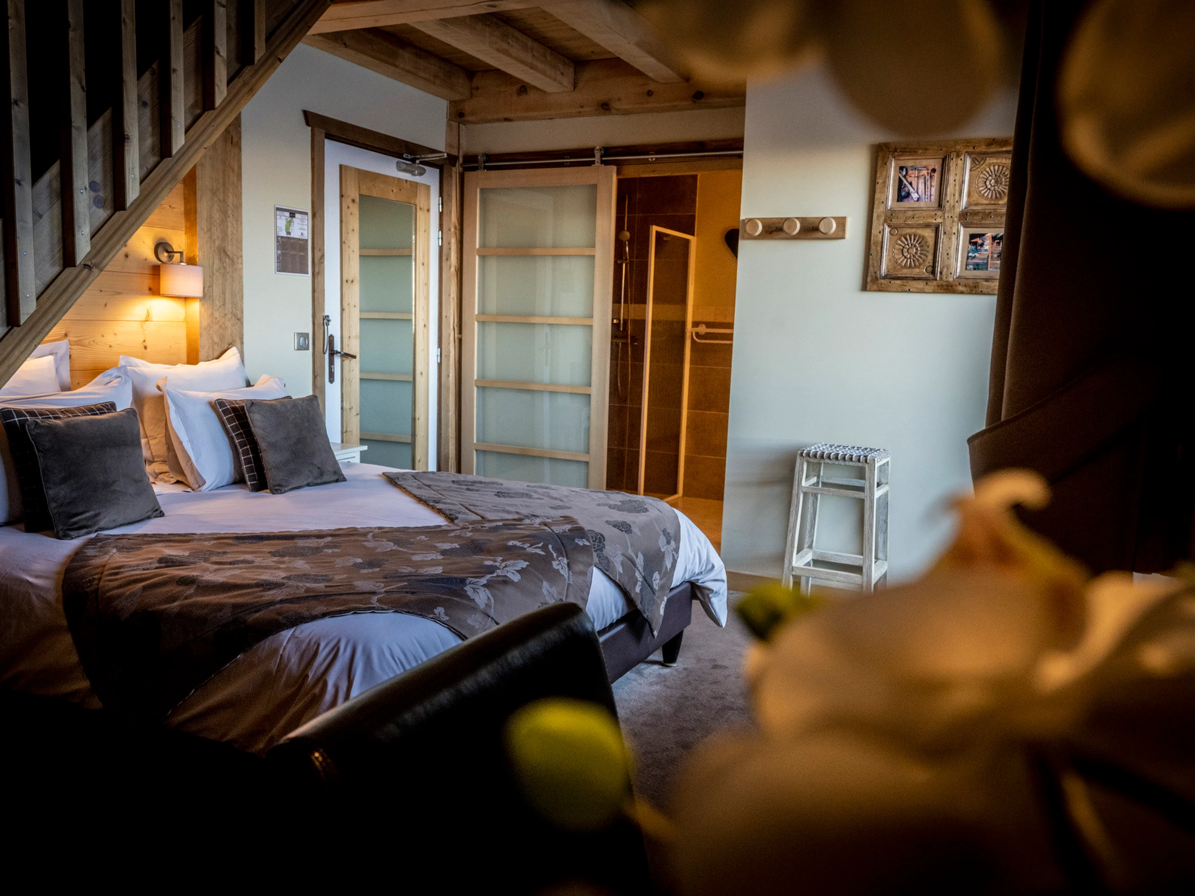 - 1 chambre LUXE avec 1 lit double (180x200) et 1 lit enfant (90x190) en mezzanine + salle de douche et WC privatif + balcon avec mobilier d’extérieur (vue Mont Blanc) et accès jacuzzi