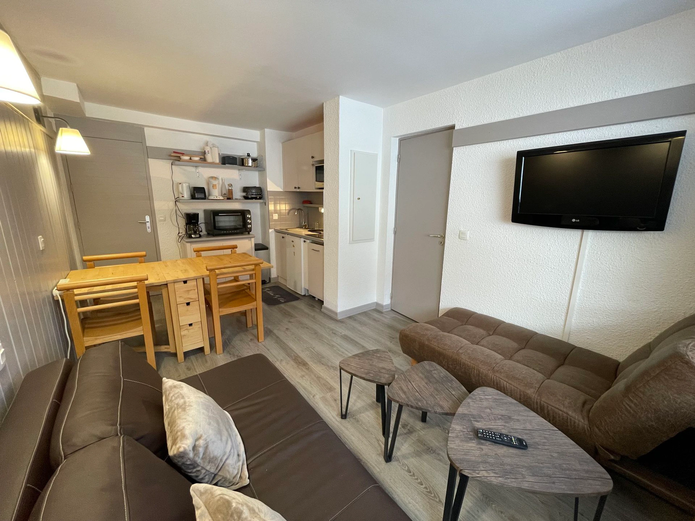 Le séjour est composé d’un canapé lit 2 personnes, d'une banquette, 3 table basse gigognes et [hidden] écran plat.