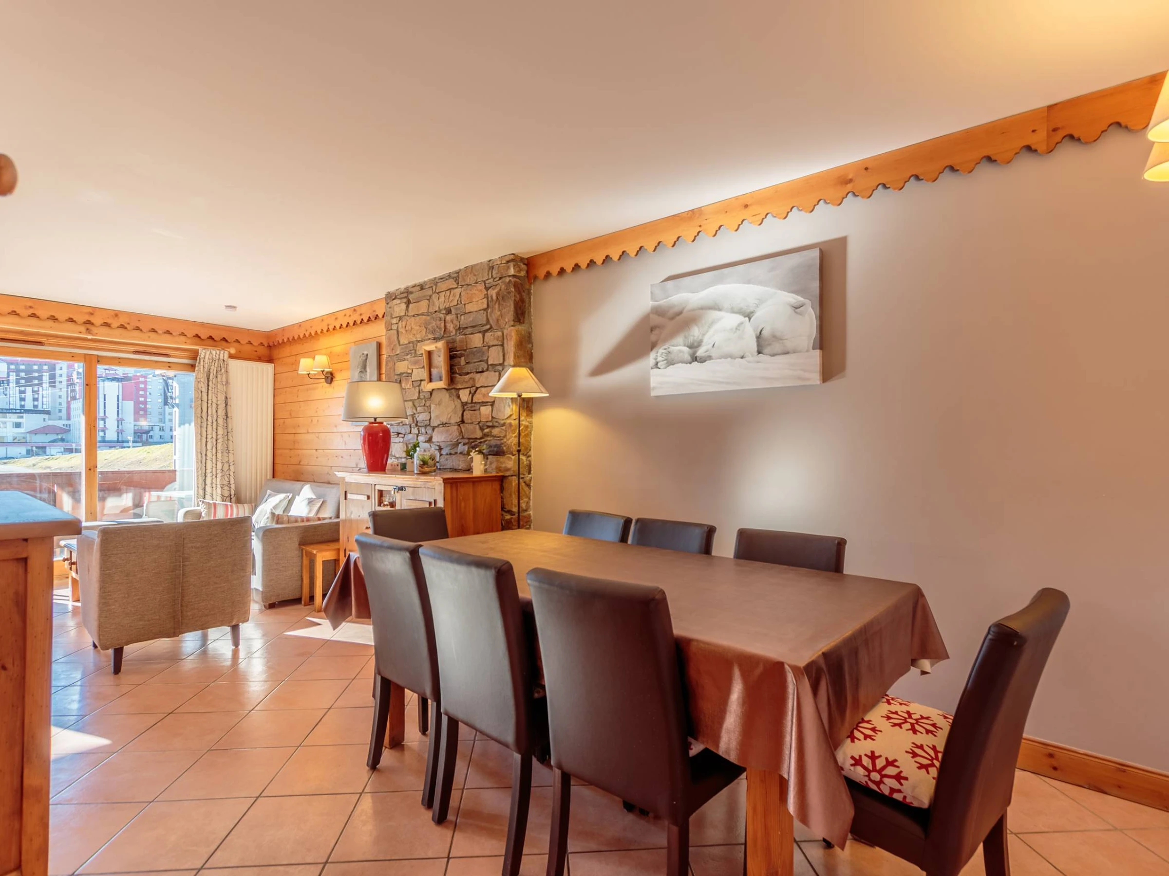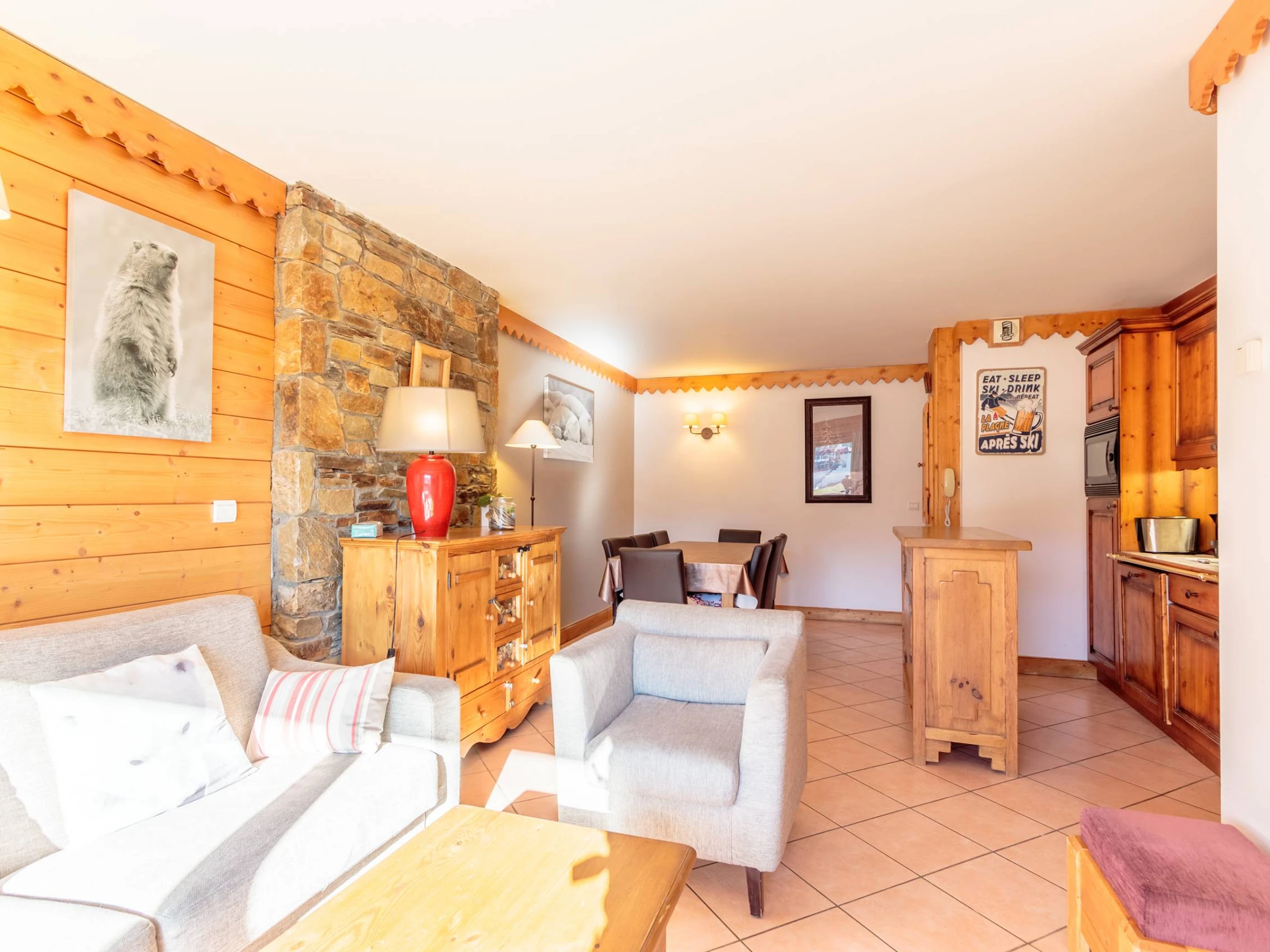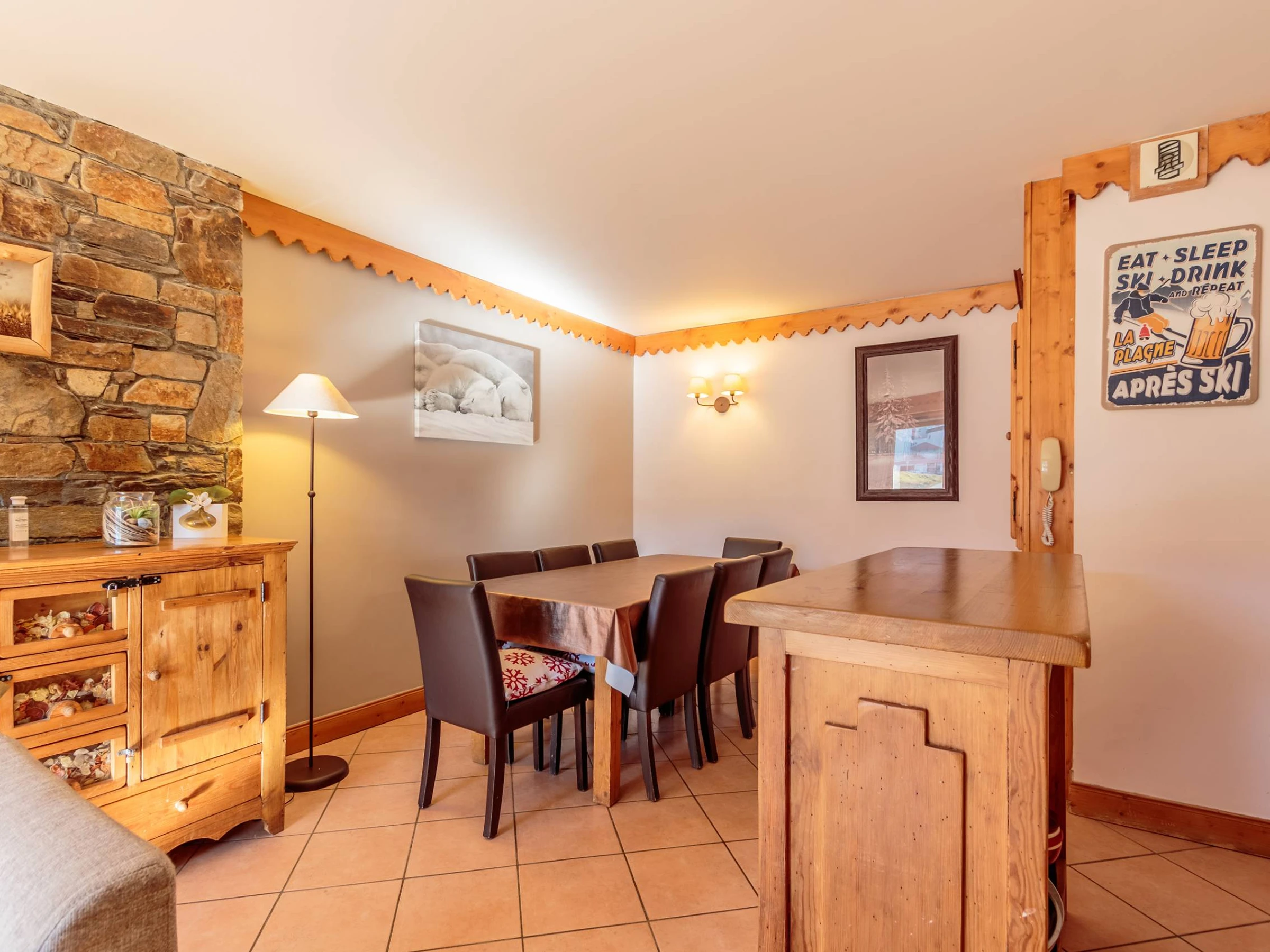 - Le séjour, spacieux et lumineux, dispose d'une espace repas et d'un coin salon avec un canapé convertible. Il est équipé d'un téléviseur, lecteur Blueray et dispose d'un boitier WIFI.