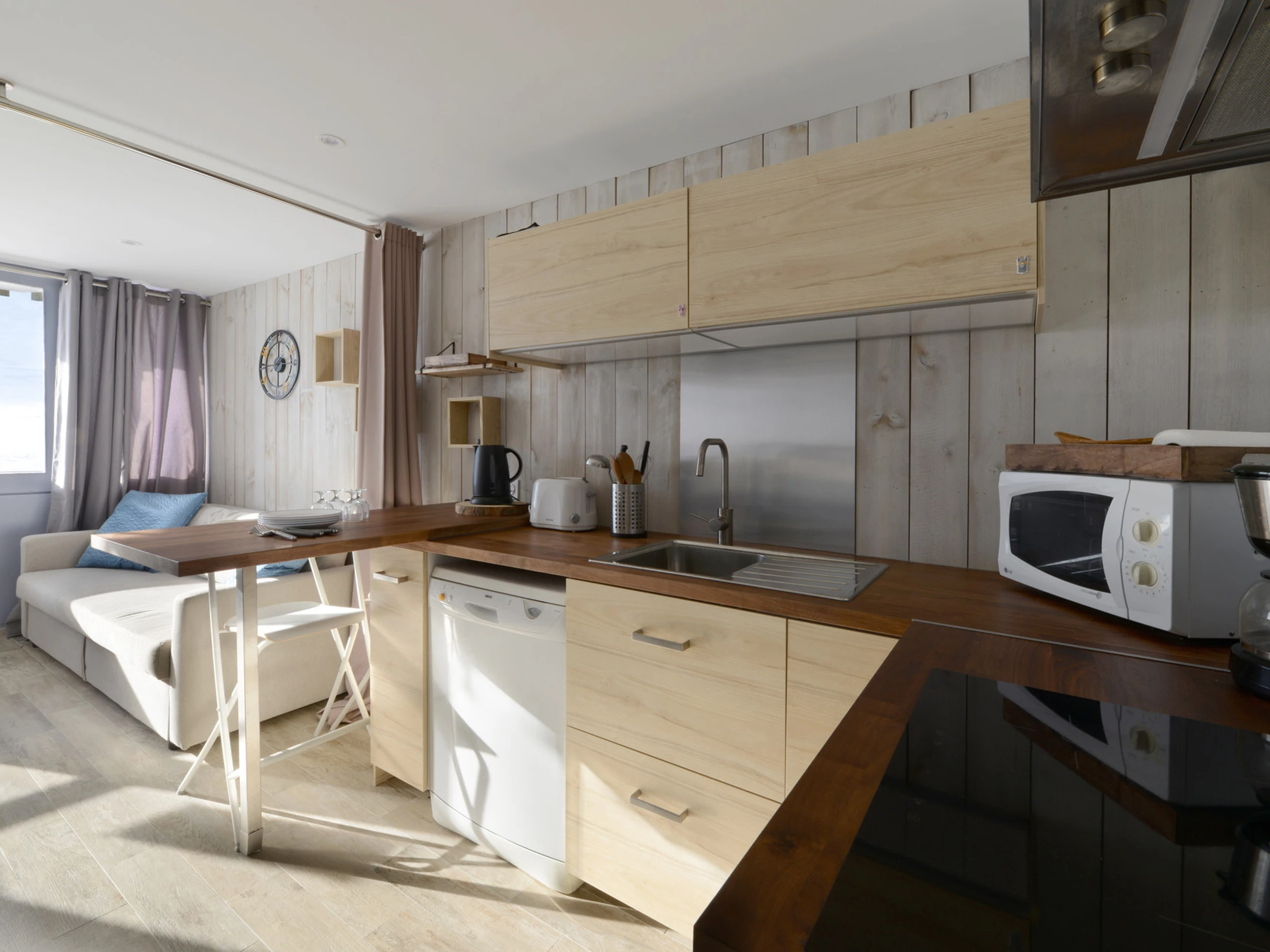 Ce studio rénové en 2019 se trouve au niveau "H" du Paquebot des Neiges et est accessible par l'ascenseur "Zénith". Il se compose d'une cuisine ouverte sur le séjour, d'une salle de bains et d'un WC indépendant. Son balcon exposé Sud offre une jolie vue sur les pistes.