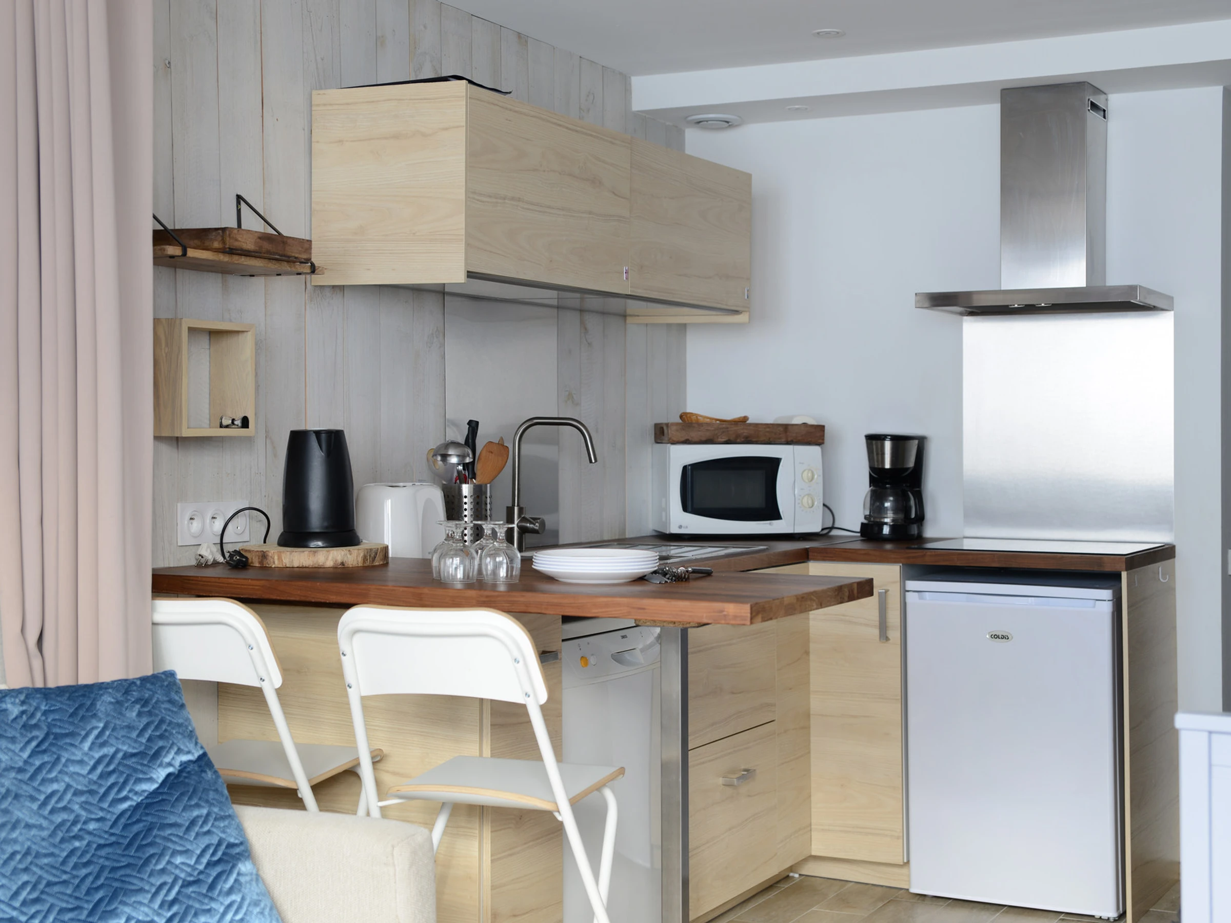 La cuisine, ouverte sur le séjour, est équipée d'un micro-ondes, d'un four, de 4 plaques à induction, d'un réfrigérateur top, d'un lave-vaisselle.Pour votre confort, des appareils à raclette et fondue sont à votre disposiition.