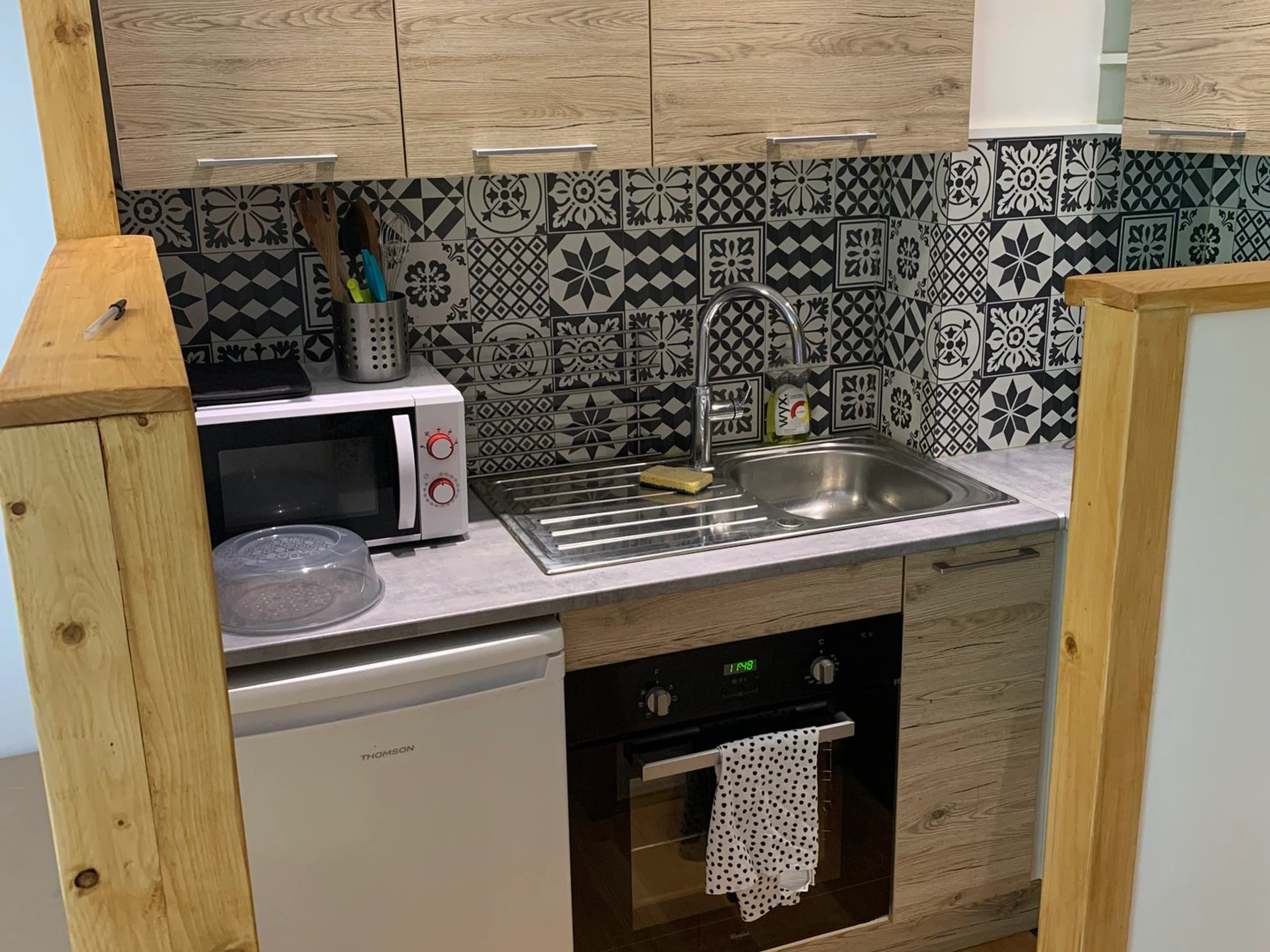 Cuisine ouverte sur le séjour avec un four traditionnel, un micro-ondes, 1 plaque vitrocéramique 2 feux, un réfrigérateur, un lave vaisselle.