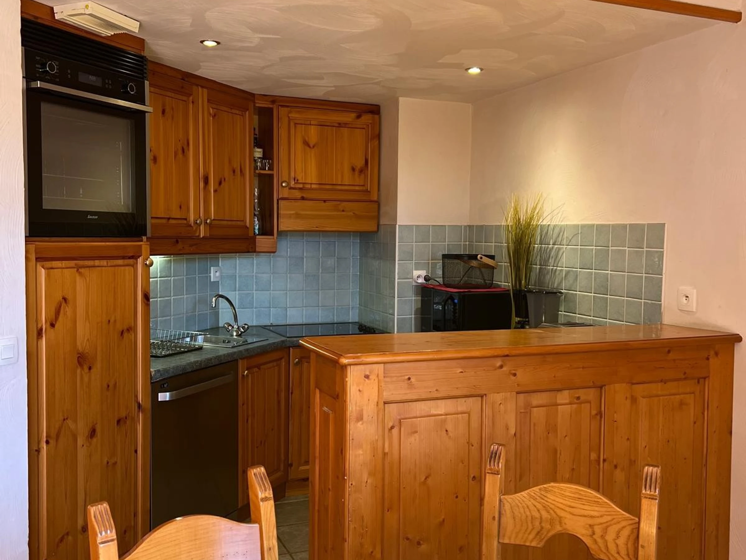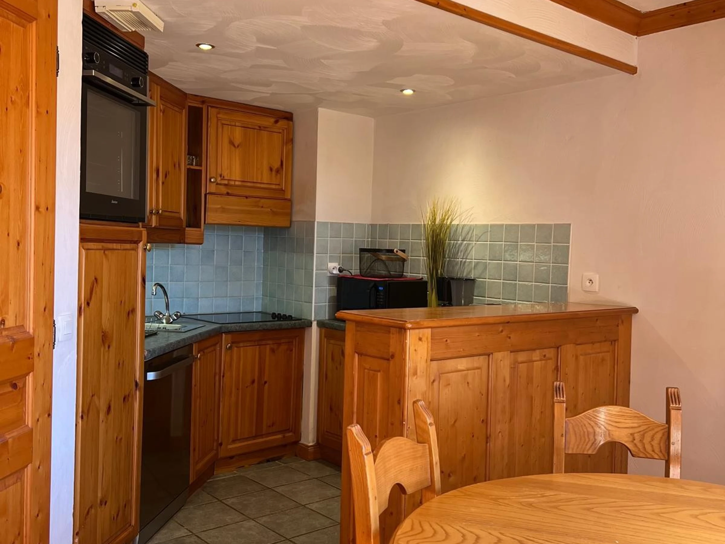 La cuisine ouverte sur le séjour par un comptoir est équipée de plaques vitrocéramiques, d'un réfrigérateur, d'un four combiné micro-ondes et d'un lave-vaisselle.