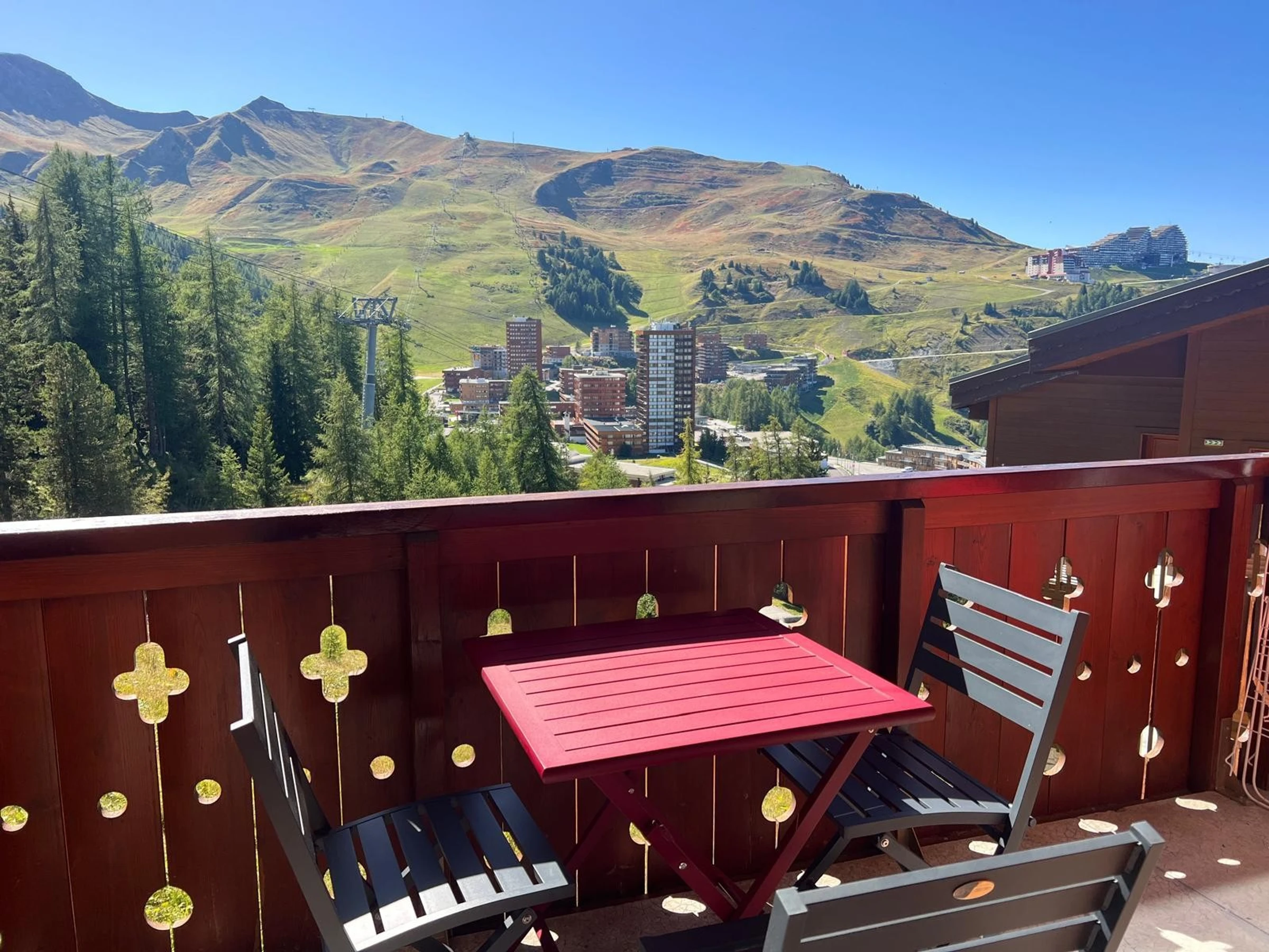 Appartement tout confort situé à Plagne Villages, avec balcon vue sur les pistes. La résidence est située à 100m des pistes avec un retour ski aux pieds, et à 300m des commerces de Plagne Villages et de l'ESF.