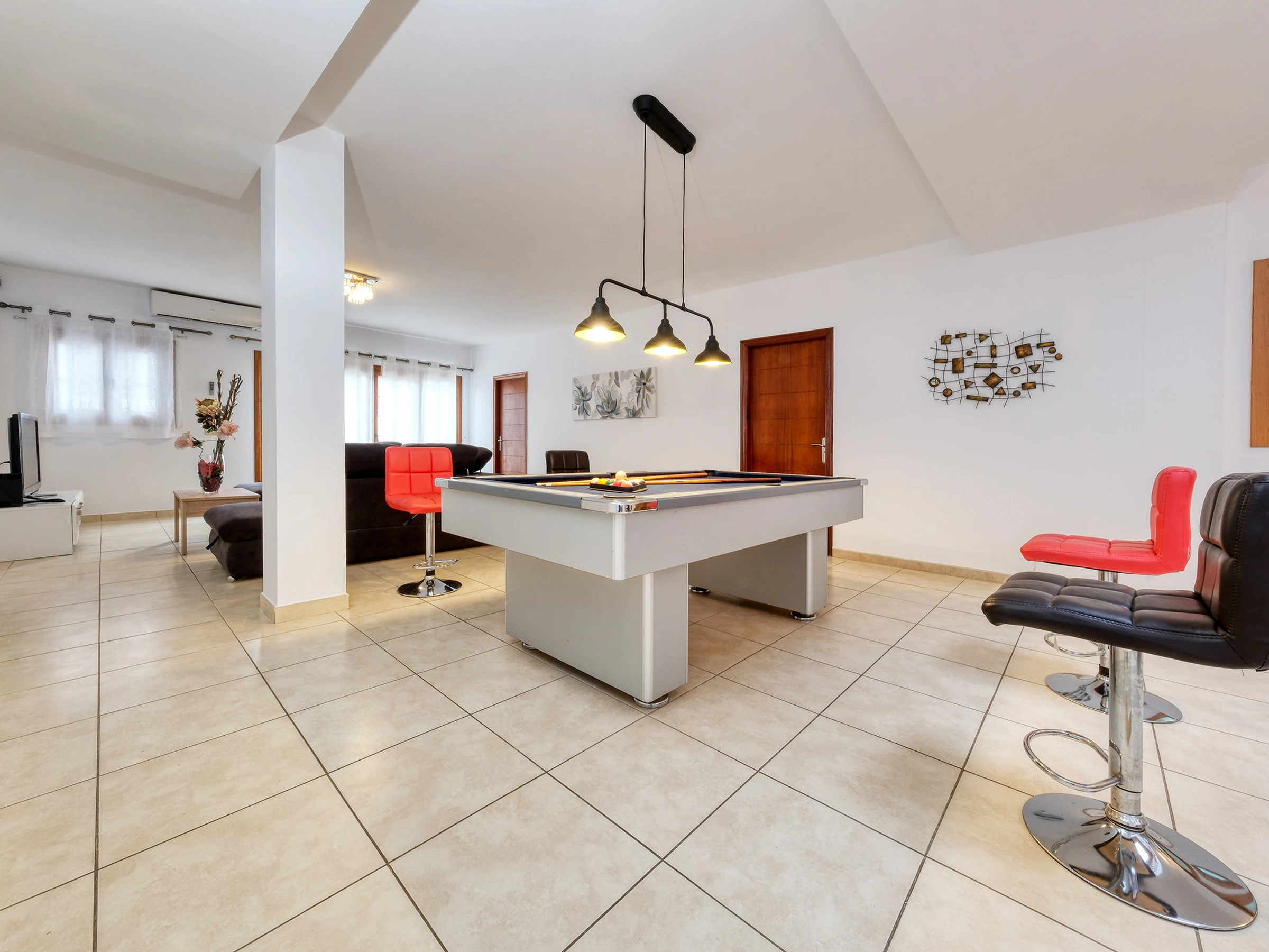 Au rez-de-chaussée, il y a une grande salle de jeux avec billard, Air-Hockey, Pac-Man et autres jeux numériques, ainsi qu'un Smart TV avec chaînes internationales ; et 3 chambres supplémentaires :