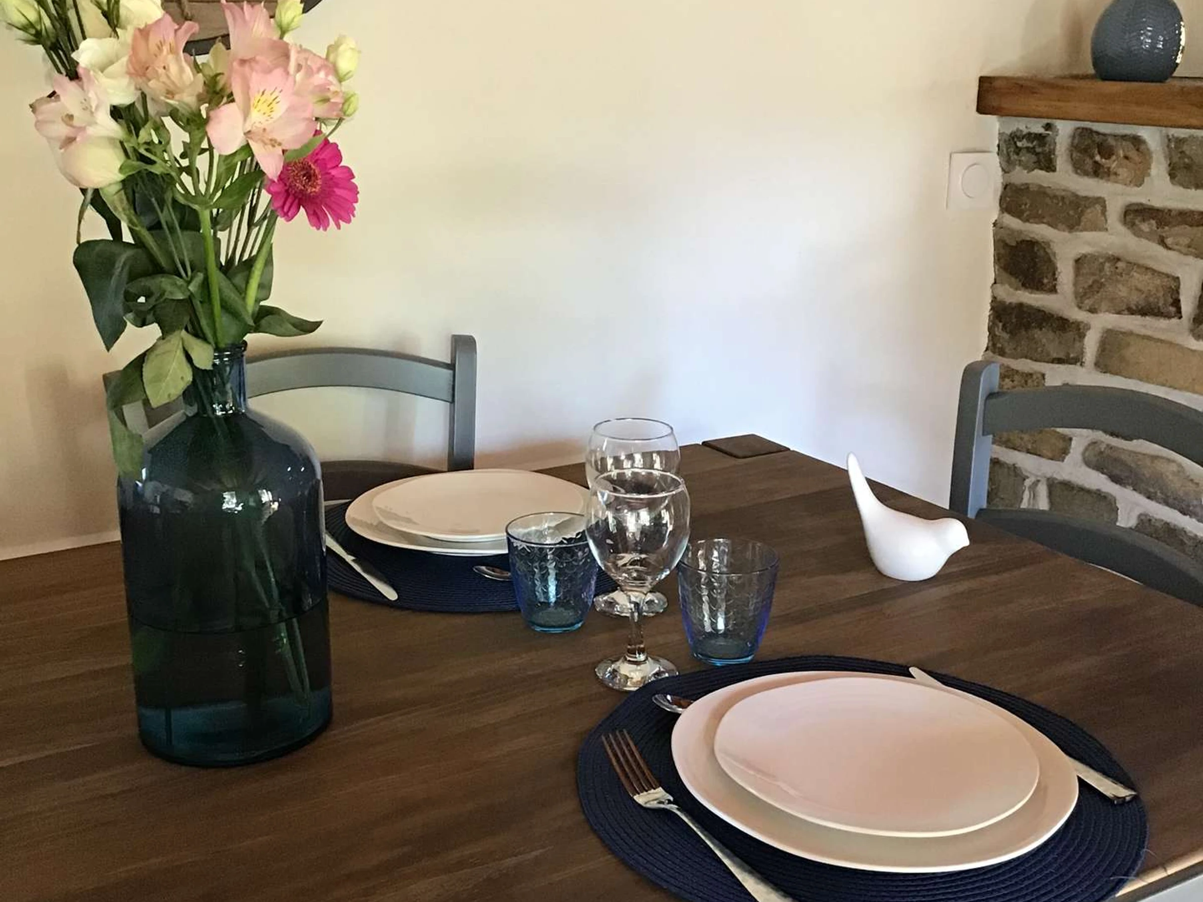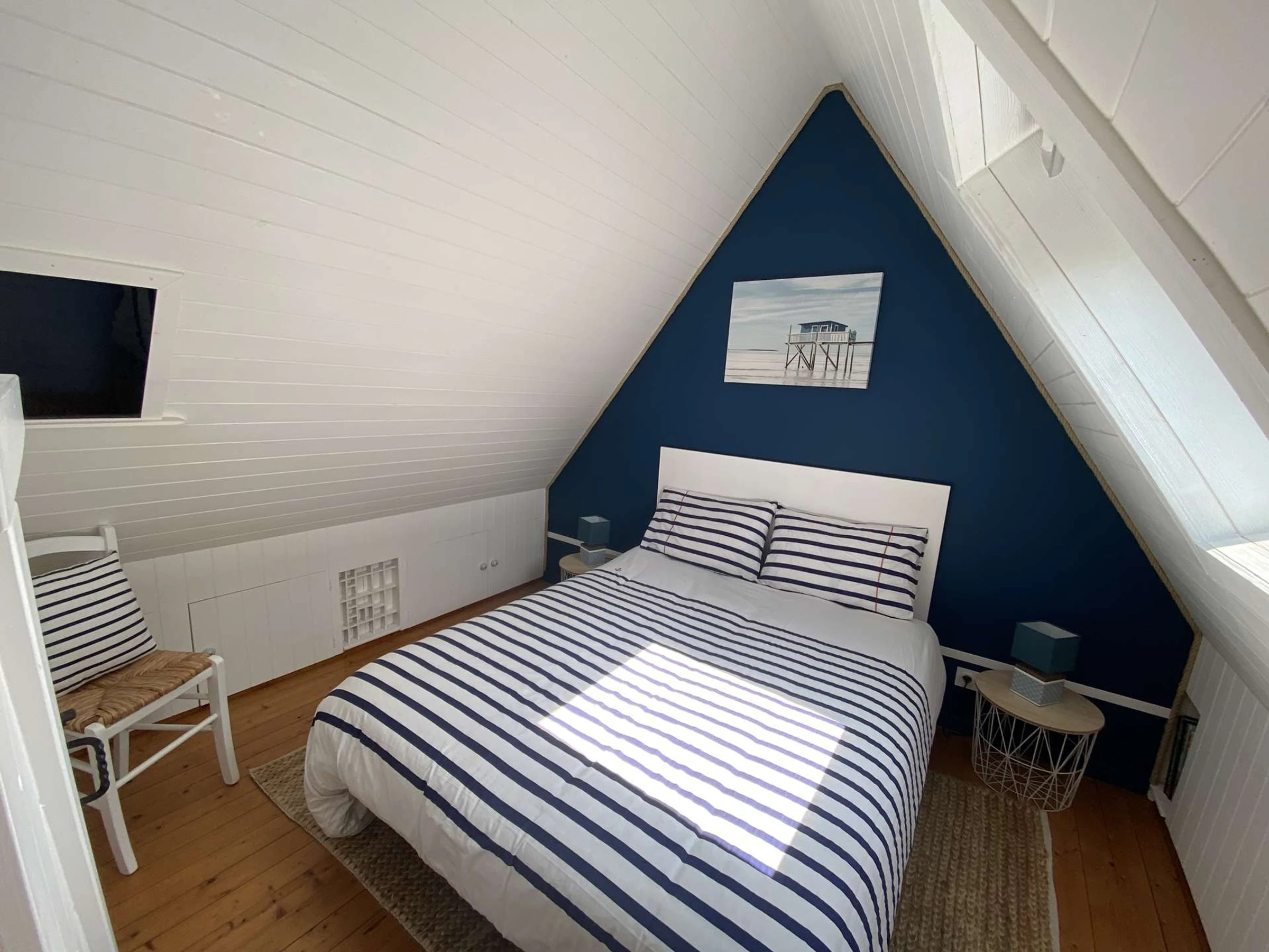 Au rez-de-chaussée une pièce de vie avec cheminée, espace repas et cuisine ouverte, un salon télévision, une chambre avec lit double (140 x 190 cm), une salle d’eau avec WC, une véranda. À l’étage, deux chambres attenantes avec lit double (140x190 cm) et lit simple (90x190 cm).