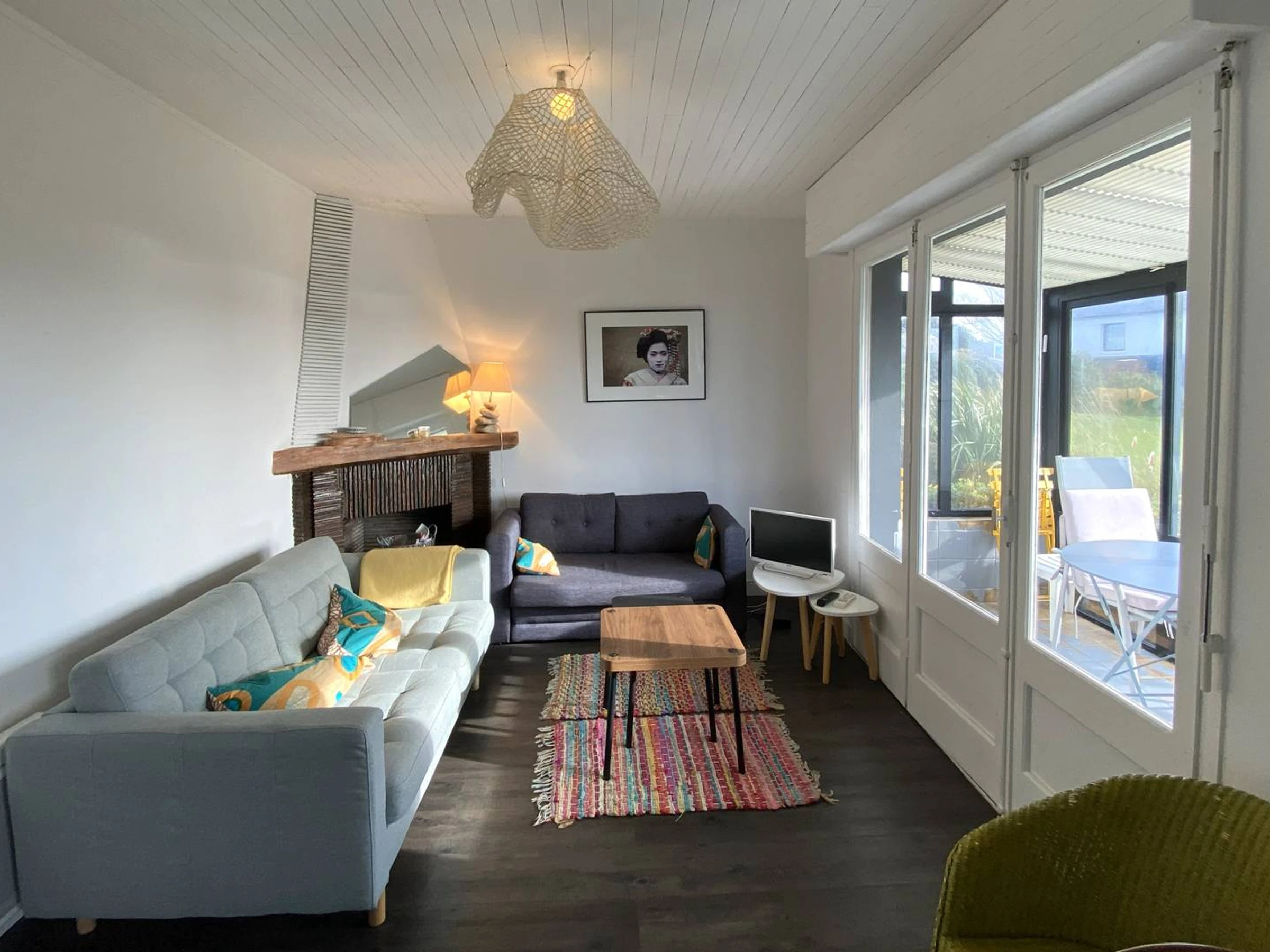 1 séjour VUE SUR MER avec canapé, cheminée décorative, TV, donnant sur la véranda -