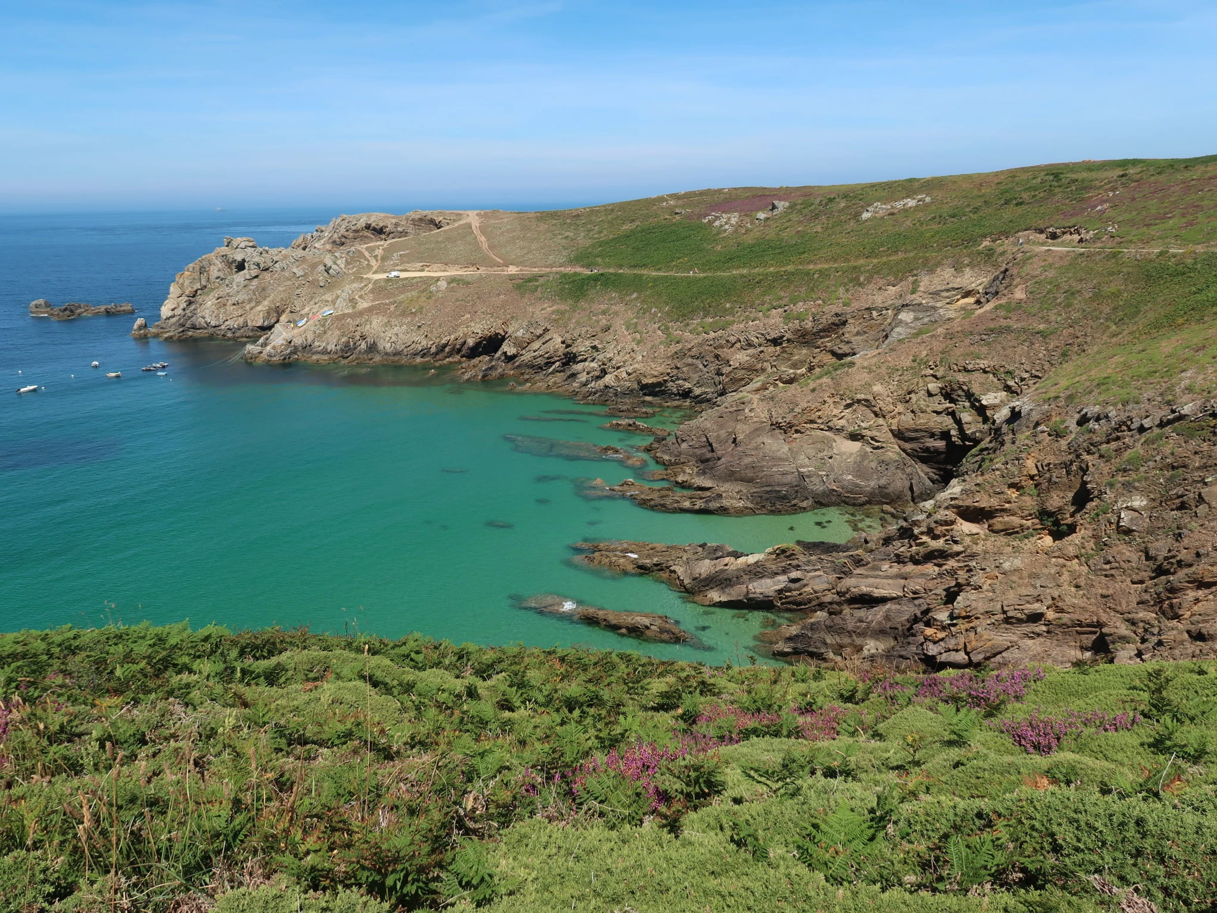 "Kerludu", maison 5 pièces 130 m2 sur 3 niveaux. Aménagement agréable et rustique: grand séjour/salle à manger avec véranda avec TV (écran plat). Cuisine ouverte (four, lave-vaisselle, 4 plaques à induction, grille-pain, bouilloire électrique, micro-ondes, cafetière électrique) avec table pour les repas. Douche, WC séparé, double vasque. À l'étage supérieur: 1 chambre, mansardée hauteur plafond 173 - 175 cm avec 1 lit (90 cm), 1 grand-lit (140 cm). 1 petite chambre, mansardée hauteur plafond 173 - 175 cm avec 1 divan-lit double (1 x 140 cm, longueur 190 cm). Salon mansardé. 2ème étage: (escalier raide) 1 chambre, mansardée hauteur plafond 130 - 178 cm avec 1 grand-lit (140 cm). Chauffage électrique. Meubles de terrasse, barbecue, chaises longues (4). Belle vue panoramique sur la mer et Pointe du Raz. A disposition: lave-linge, sèche-linge. Veuillez noter: maison non-fumeur. Détecteur de fumée. Accès (par l'extérieur uniquement) à un local indépendant avec Douche de dépannage. WC séparés. Le salon du 2ème étage offre une vue panoramique sur la Pointe du Raz par une galerie. Petit port "Le Vorlenn" à 250m connu pour les fins ligneurs du Raz de Sein.