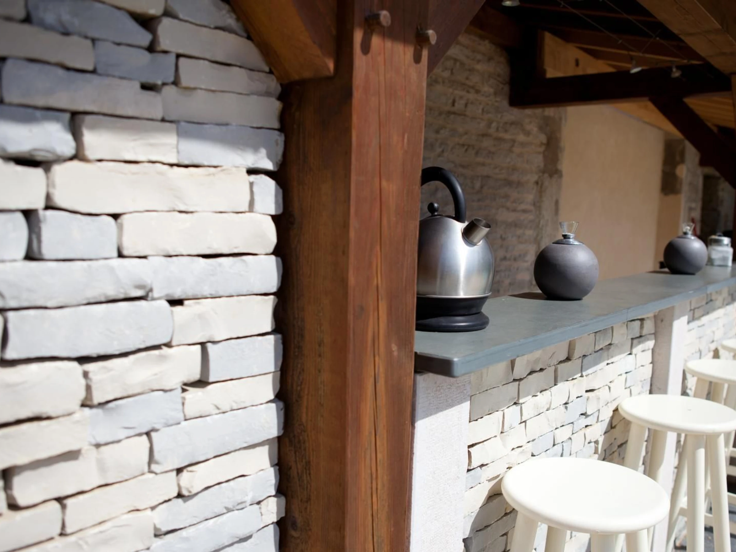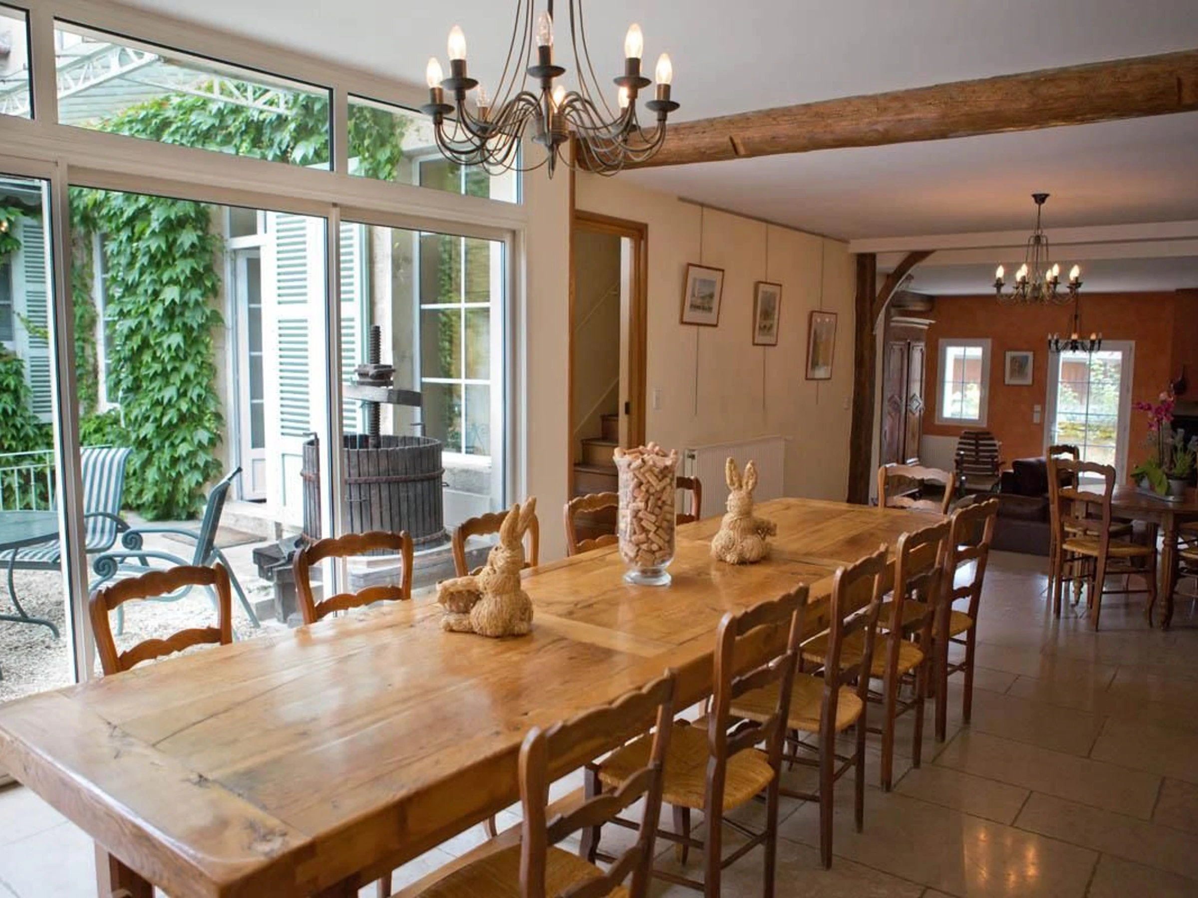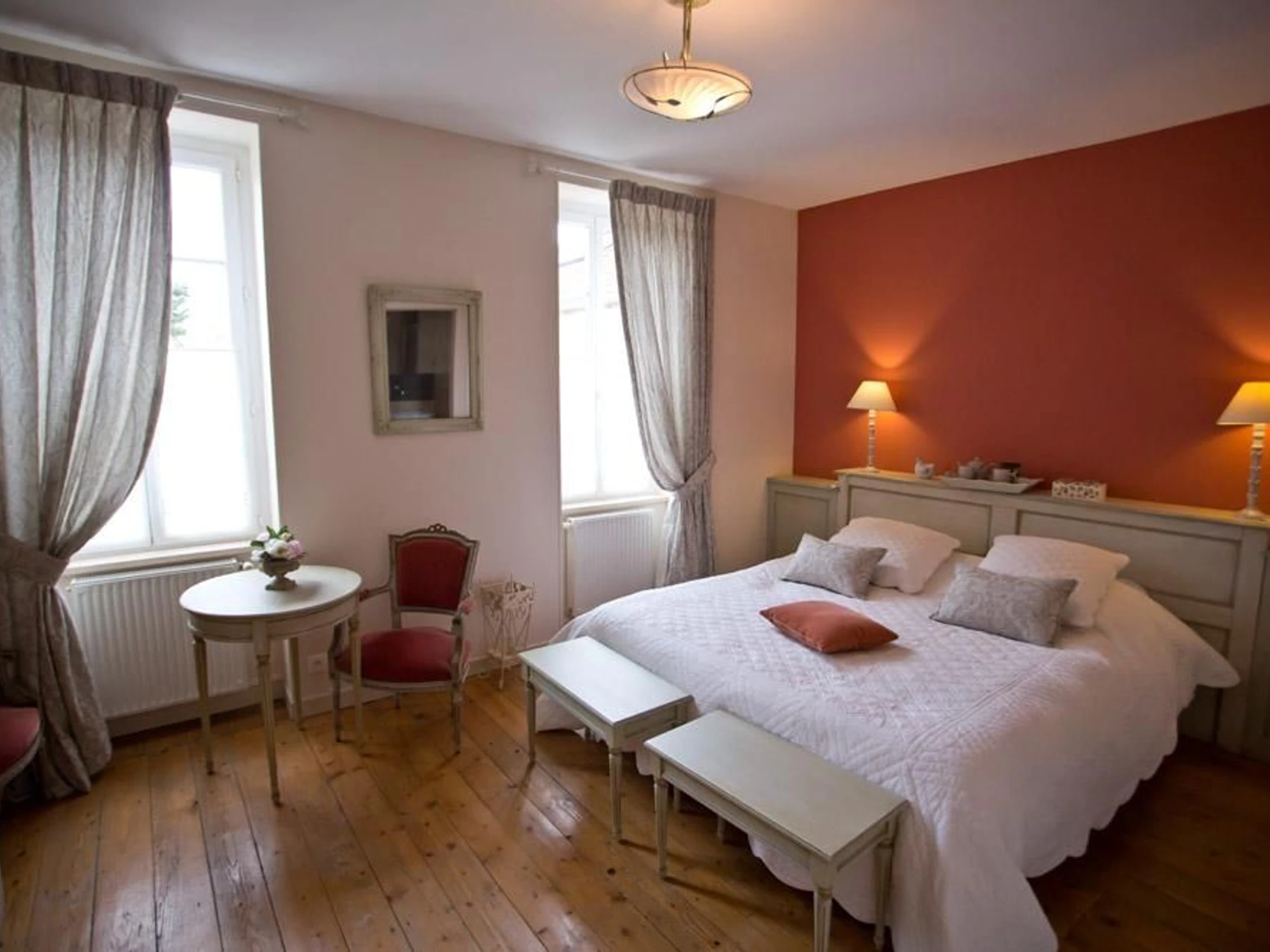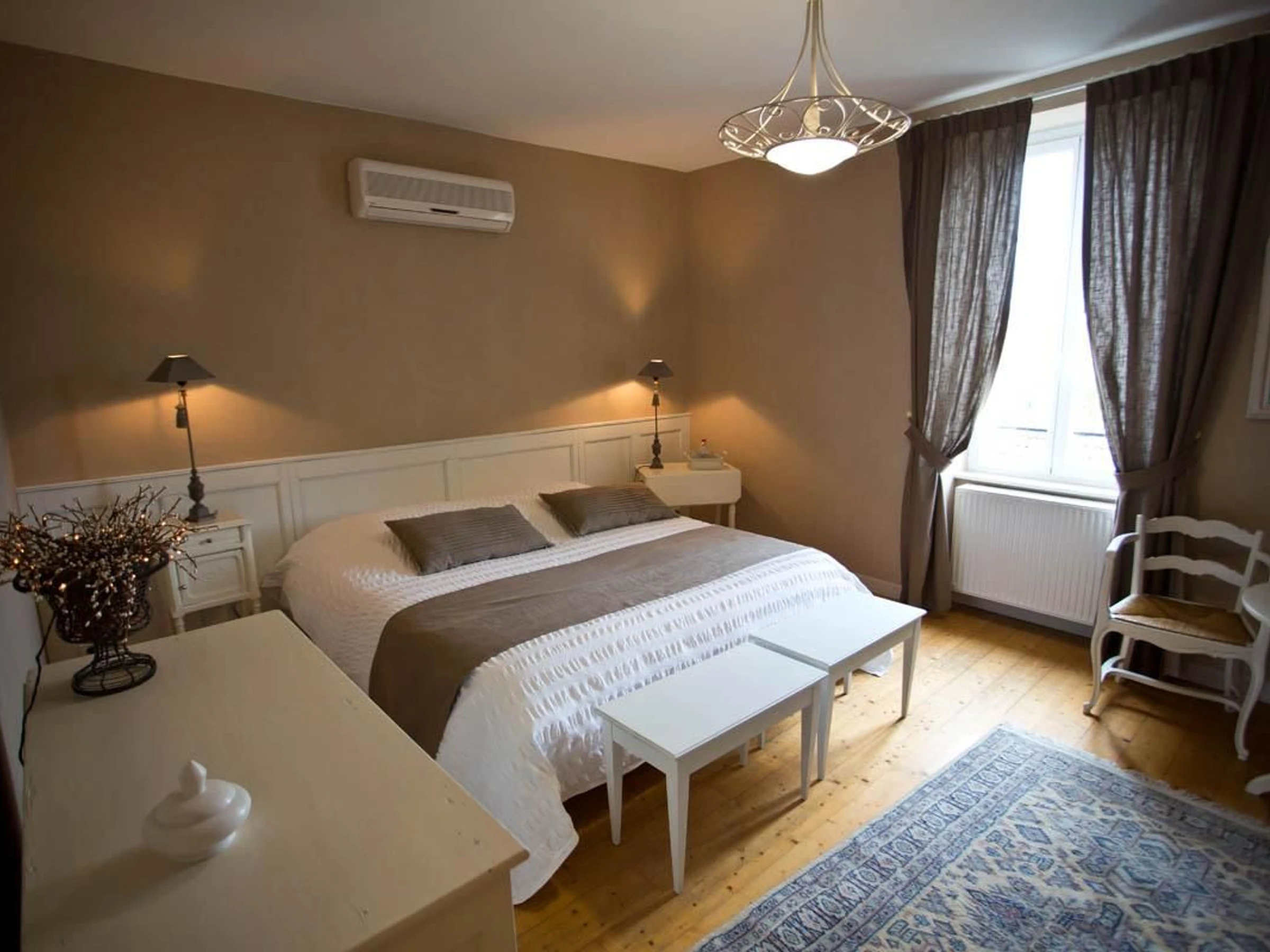 Tonalités blanche et taupe pour cette chambre de 20m² pouvant accueillir 2 personnes. Elle est dotée de deux lits 90cm (ou 180x200 cm) Grande salle de bains en pierres et WC séparé. Vue sur la petite cour intérieure et les vignes de Monsieur le Maire !