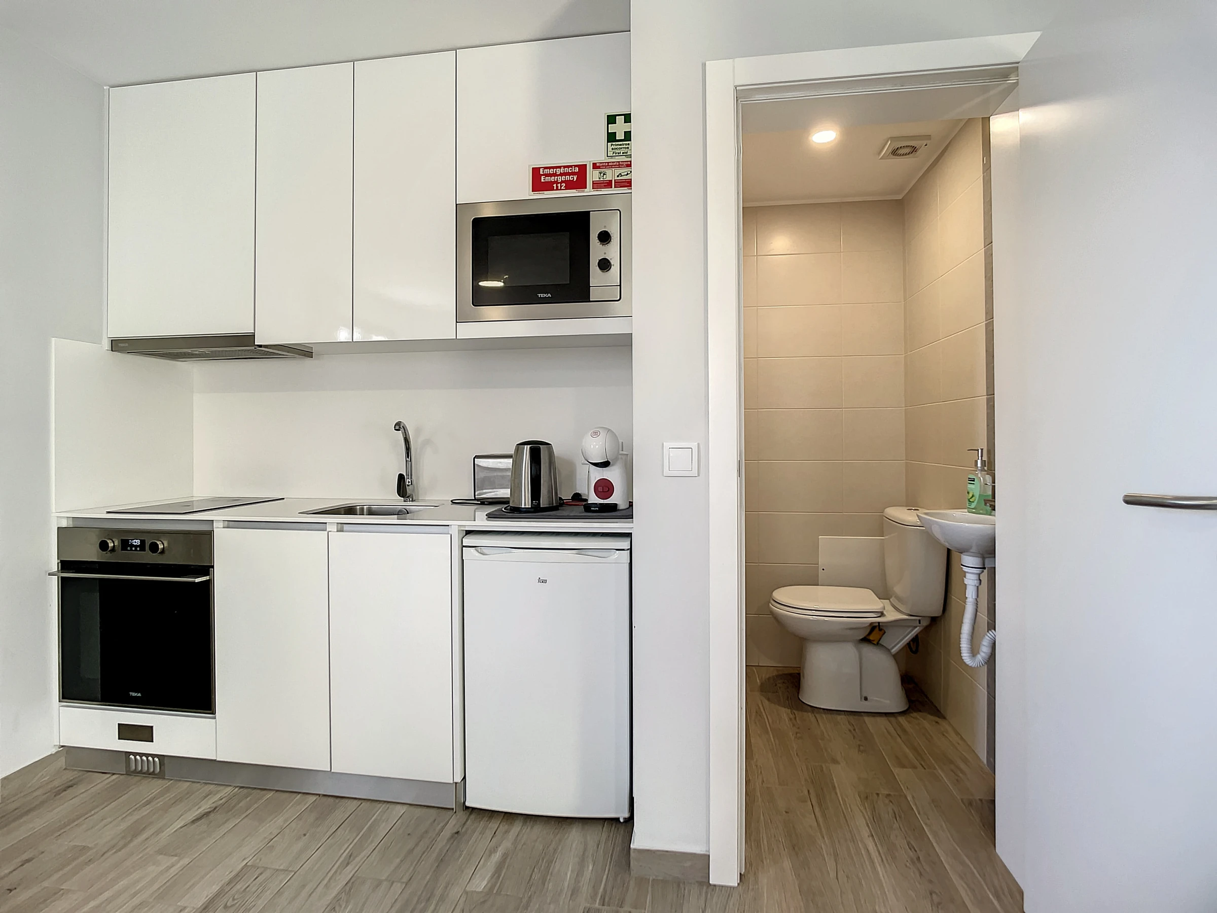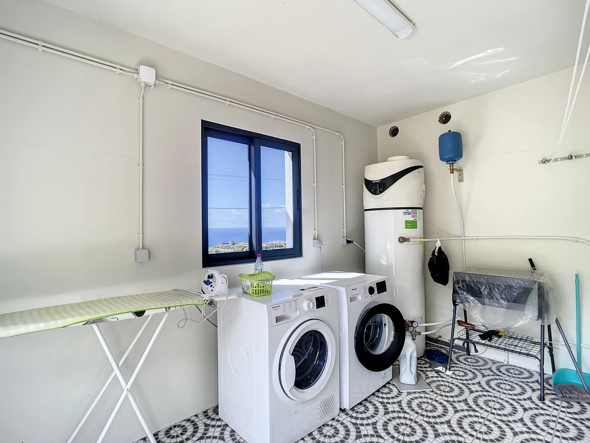 Notre cuisine, équipée d'une gamme d'appareils électroménagers comprenant un réfrigérateur, un four et des plaques de cuisson, ainsi que des ustensiles essentiels, répond à vos besoins culinaires. Pour plus de commodité, une machine à laver et un sèche-cheveux sont fournis, et vous partagerez un espace extérieur et des installations de blanchisserie avec l'appartement voisin.