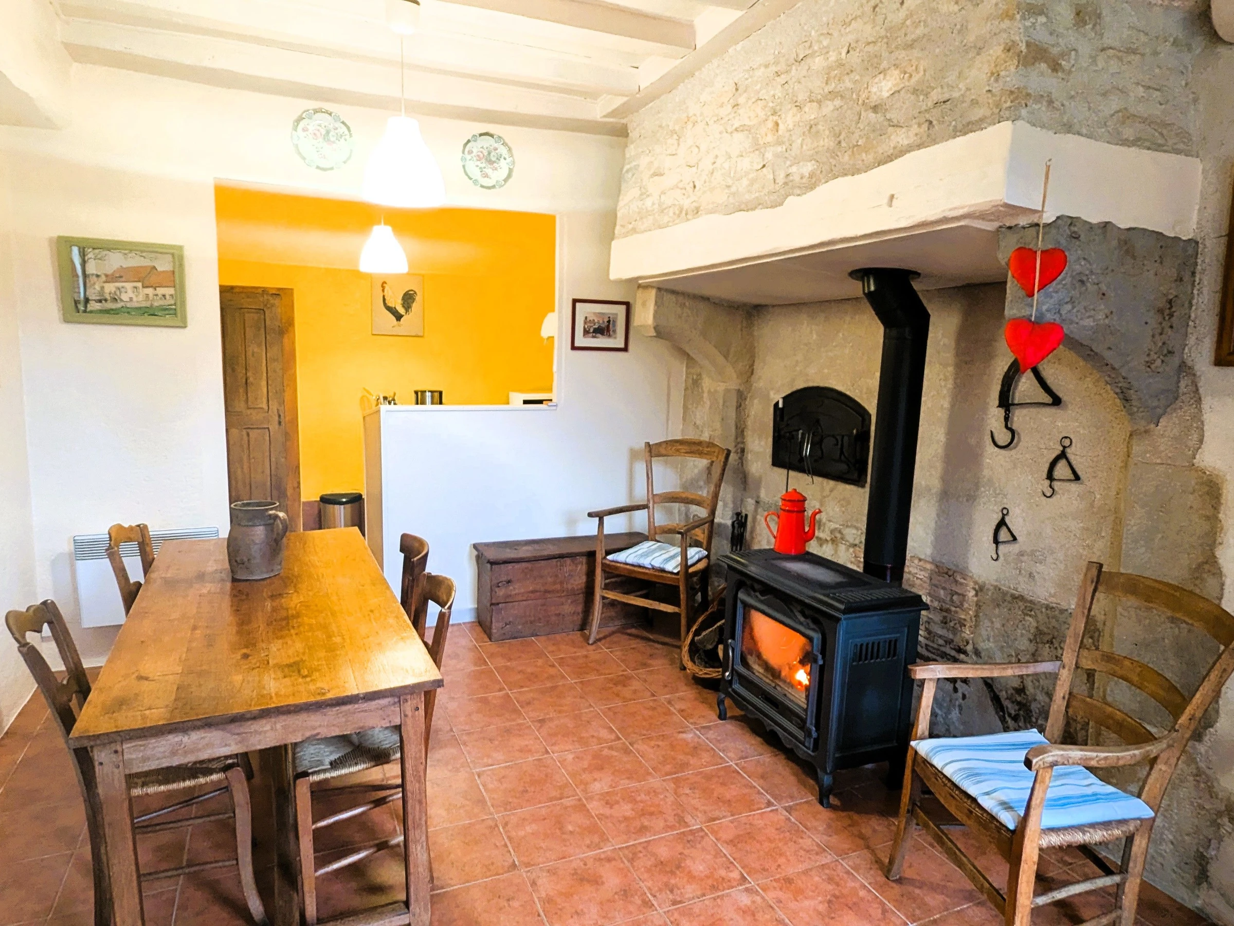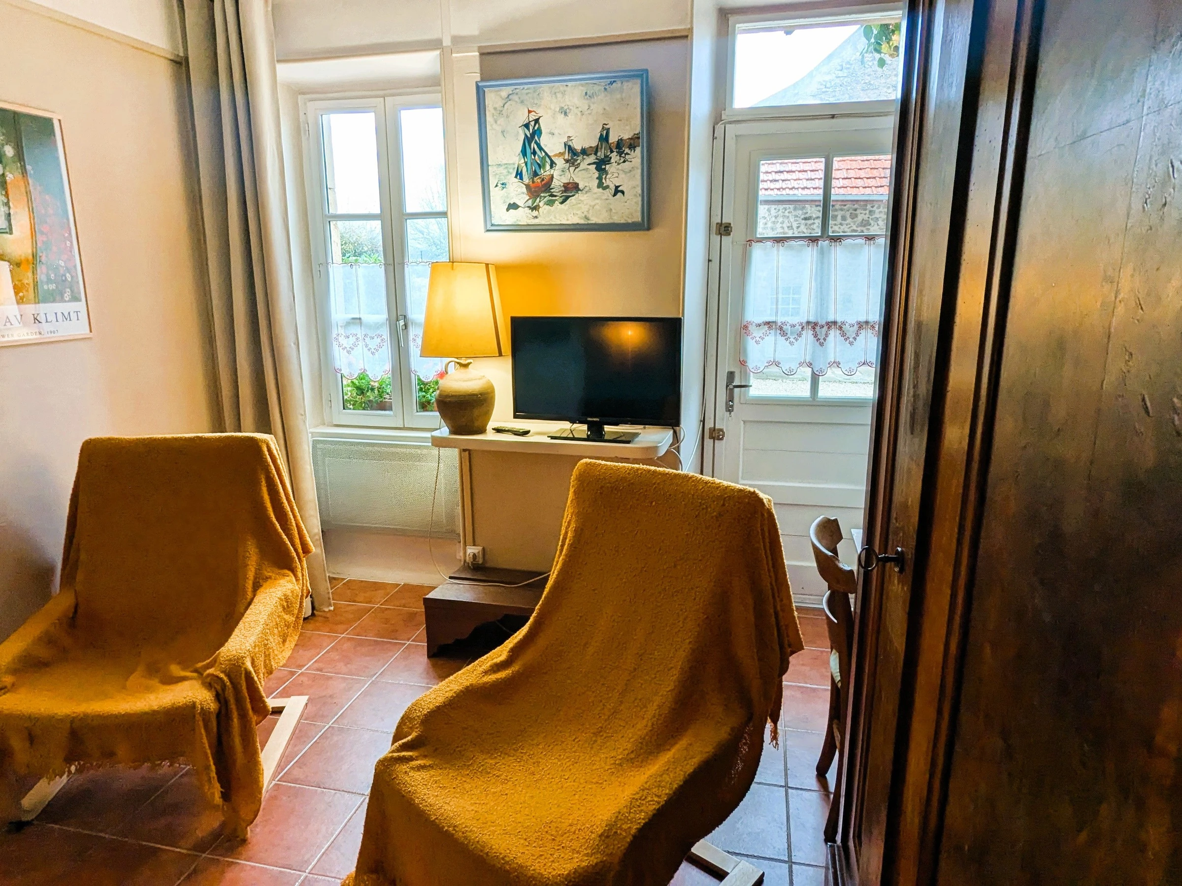 Cuisine/séjour avec poële à bois (bois gratuit), 1 chambre (1 lit 2 personnes et 1 lit appoint enfant sur demande), salle d'eau avec WC. Cour fermée et fleurie commune avec propriétaire.