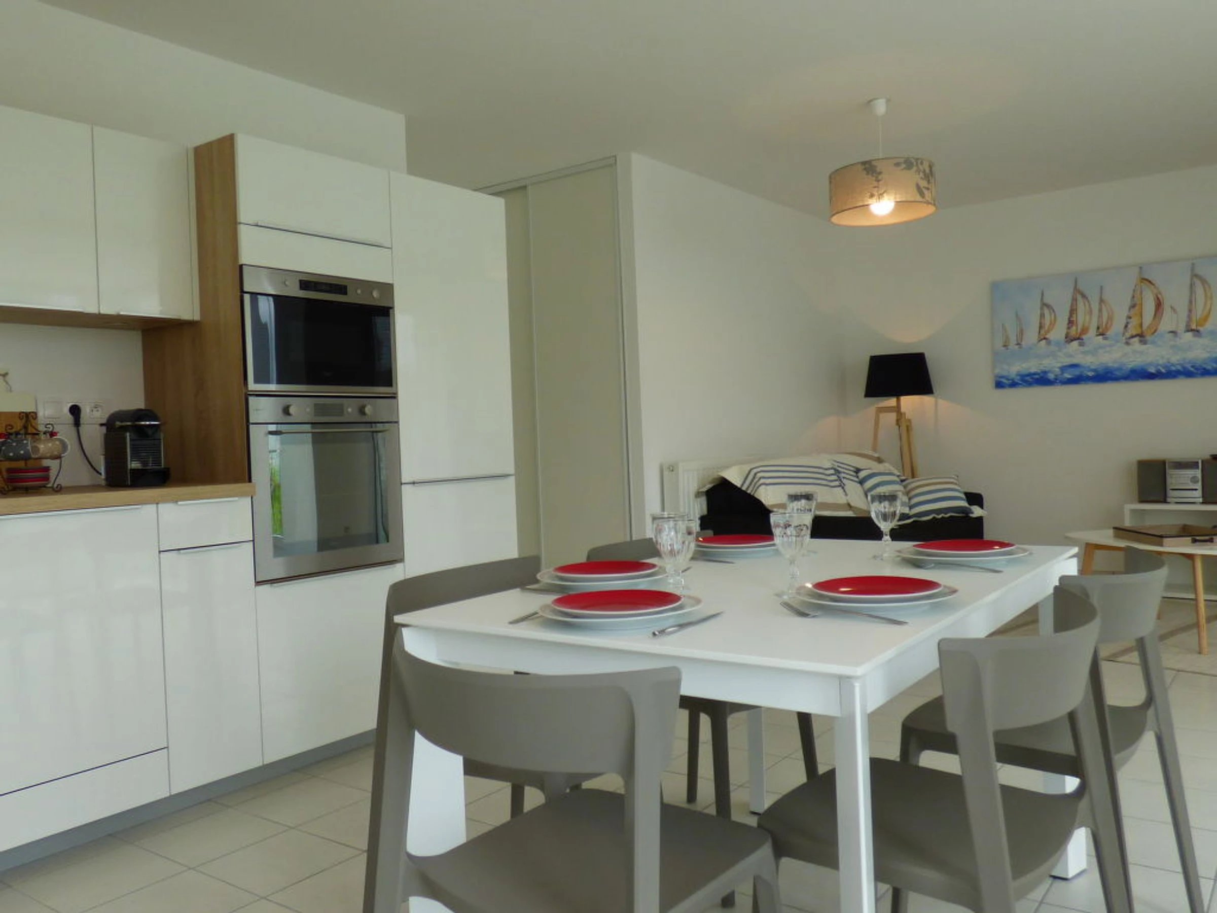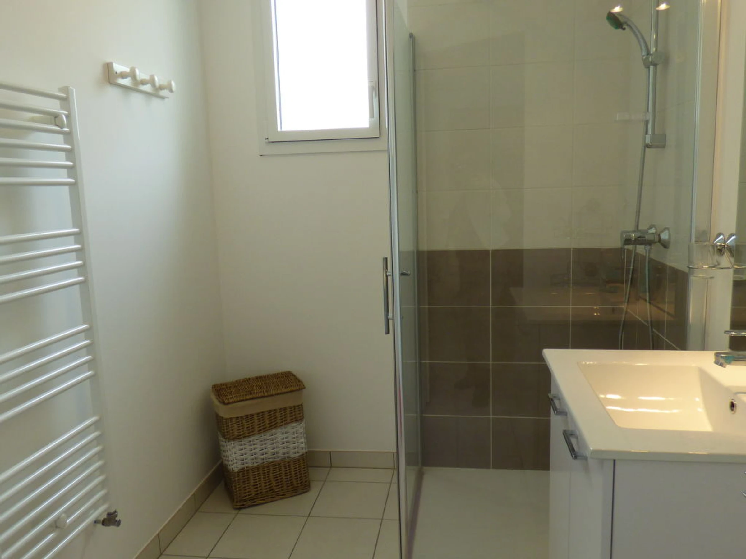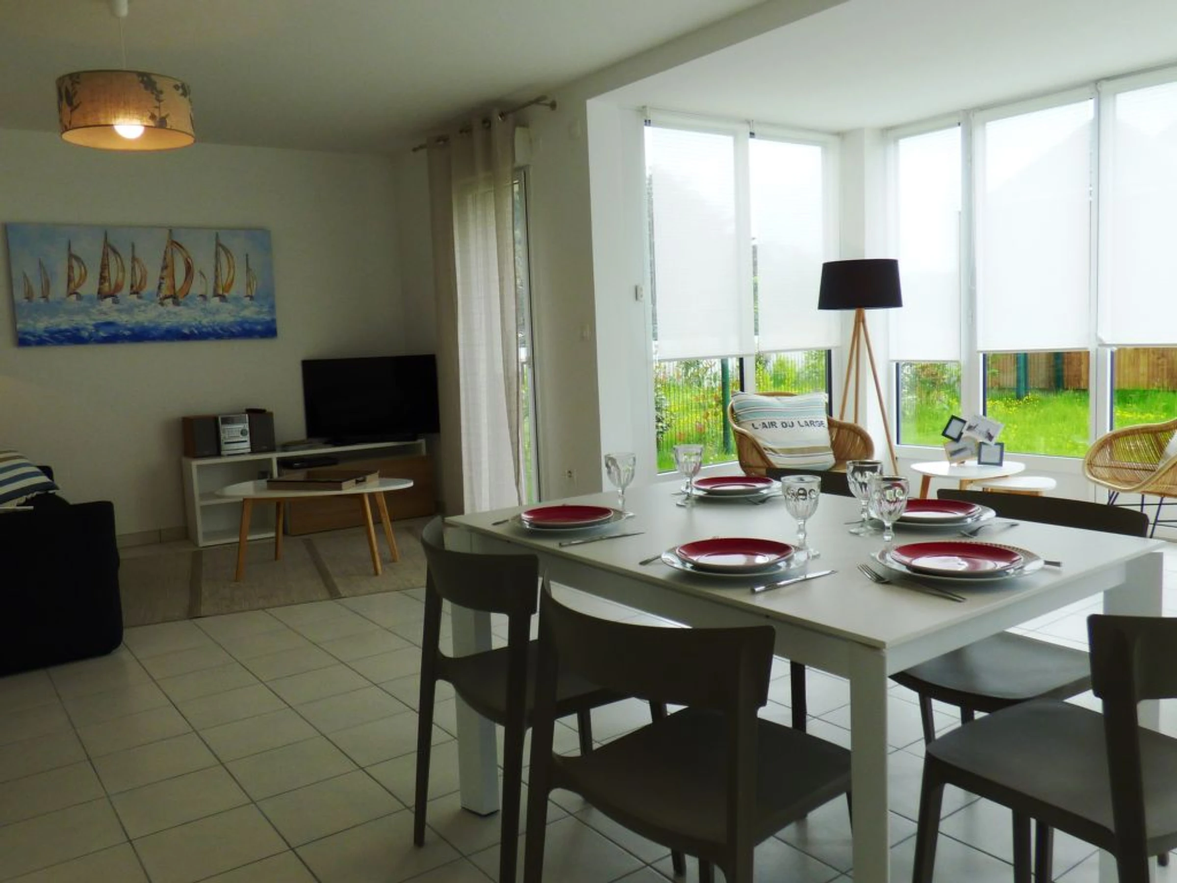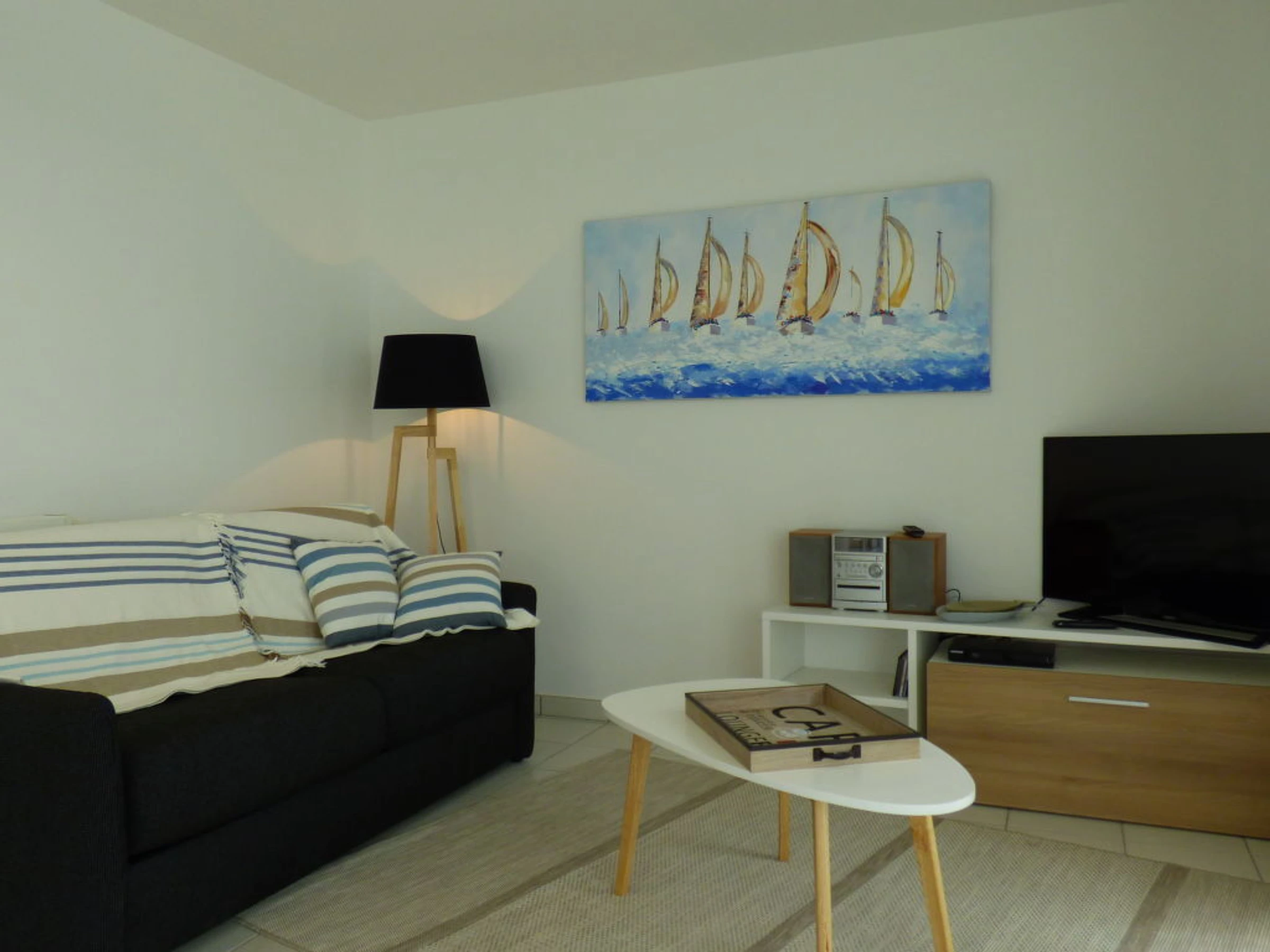 Apt 3 pièces 69 m2, au rez-de-chaussée. Aménagement très confortable et de bon goût: grand séjour/salle à manger avec écran plat. Sortie sur la terrasse. 1 chambre avec 1 grand-lit (1 x 140 cm). 1 chambre avec 1 lit (90 cm), 1 x 2 lits superposés (90 cm). Cuisine ouverte (four, lave-vaisselle, 3 plaques à induction, four micro-ondes, congélateur, cafetière électrique). Douche, WC séparé. Terrasse, jardinet. Meubles de terrasse. Vue partielle sur la mer. A disposition: lave-linge. Internet (Connexion WIFI). Place de parking No 31 (couvert). Disponible sur le site avec supplément: Linge de lit (premier jeu) 15.0EUR par personne, Serviettes (premier jeu) 5.0EUR par personne Services supplémentaires obligatoires sur le site: Taxe de séjour 0.6EUR par personne et par jour