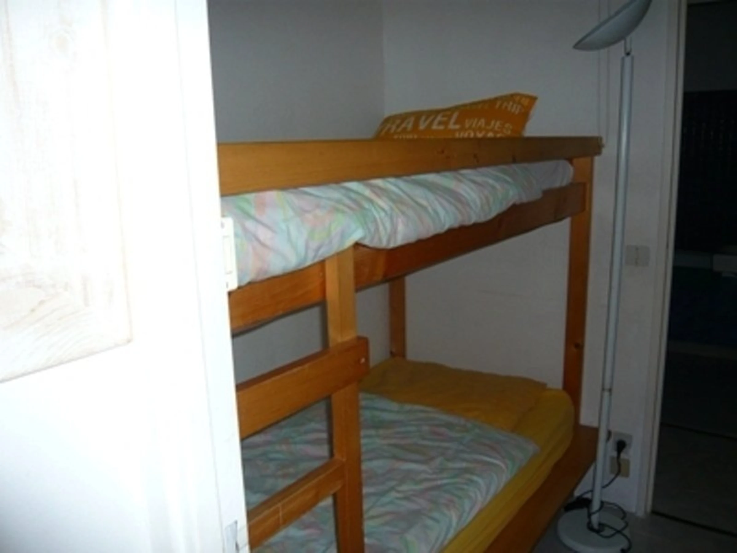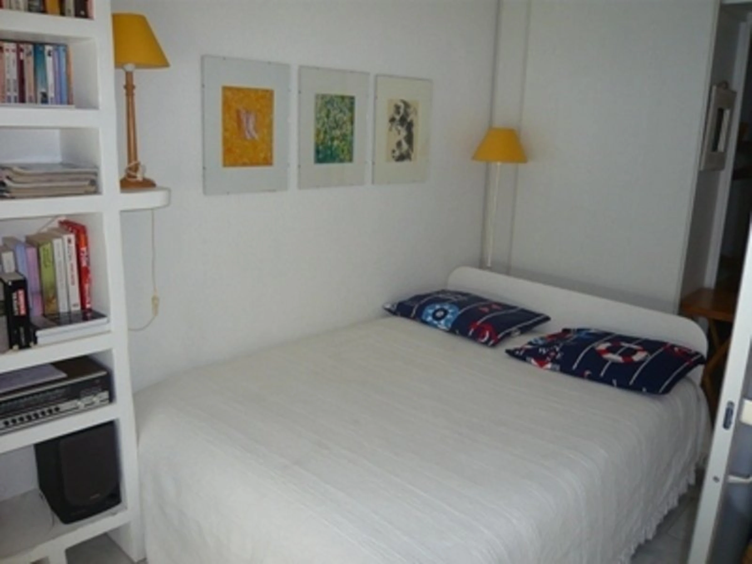 Cabine avec 2 lits superposés pour enfants. Chambre avec cloison coulissante, lit double (140 cm) et accès à la terrasse. Salle d'eau rénovée avec douche et lave-linge. WC séparés.