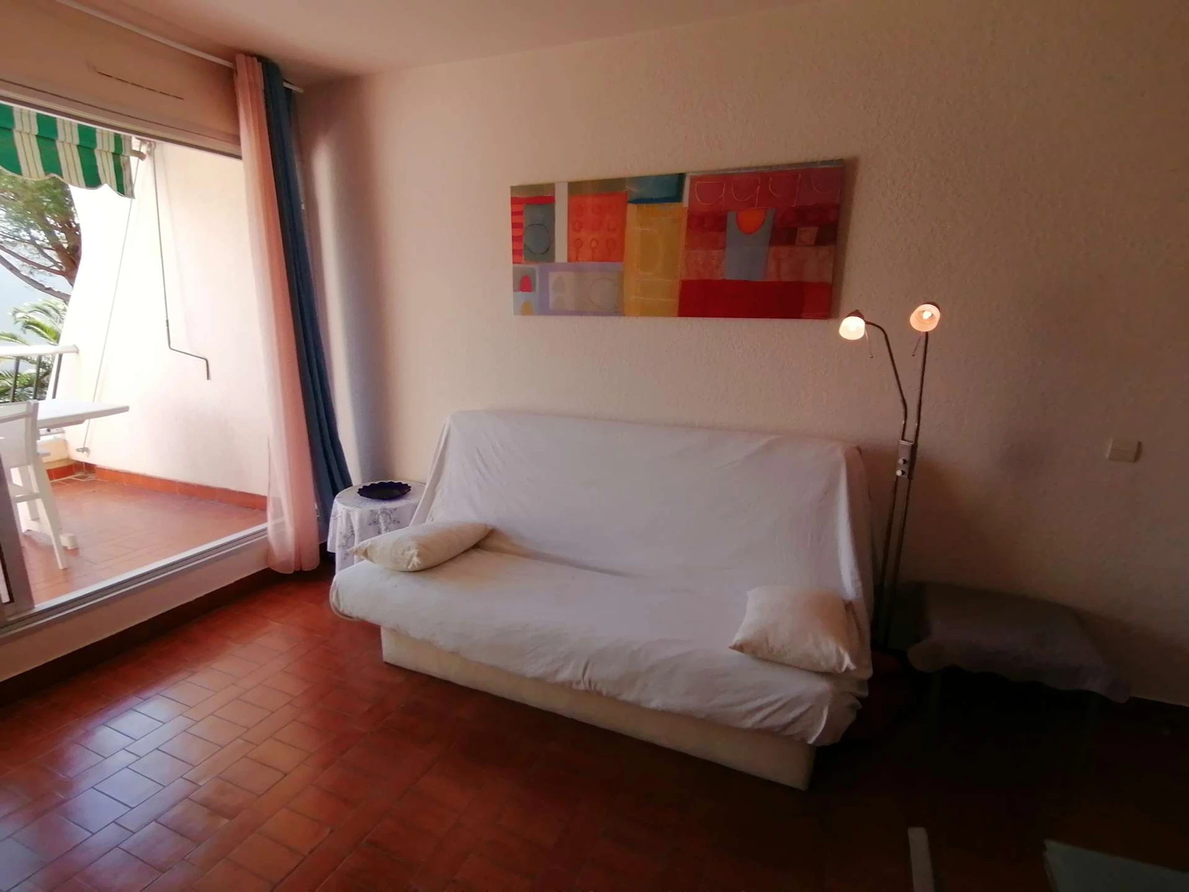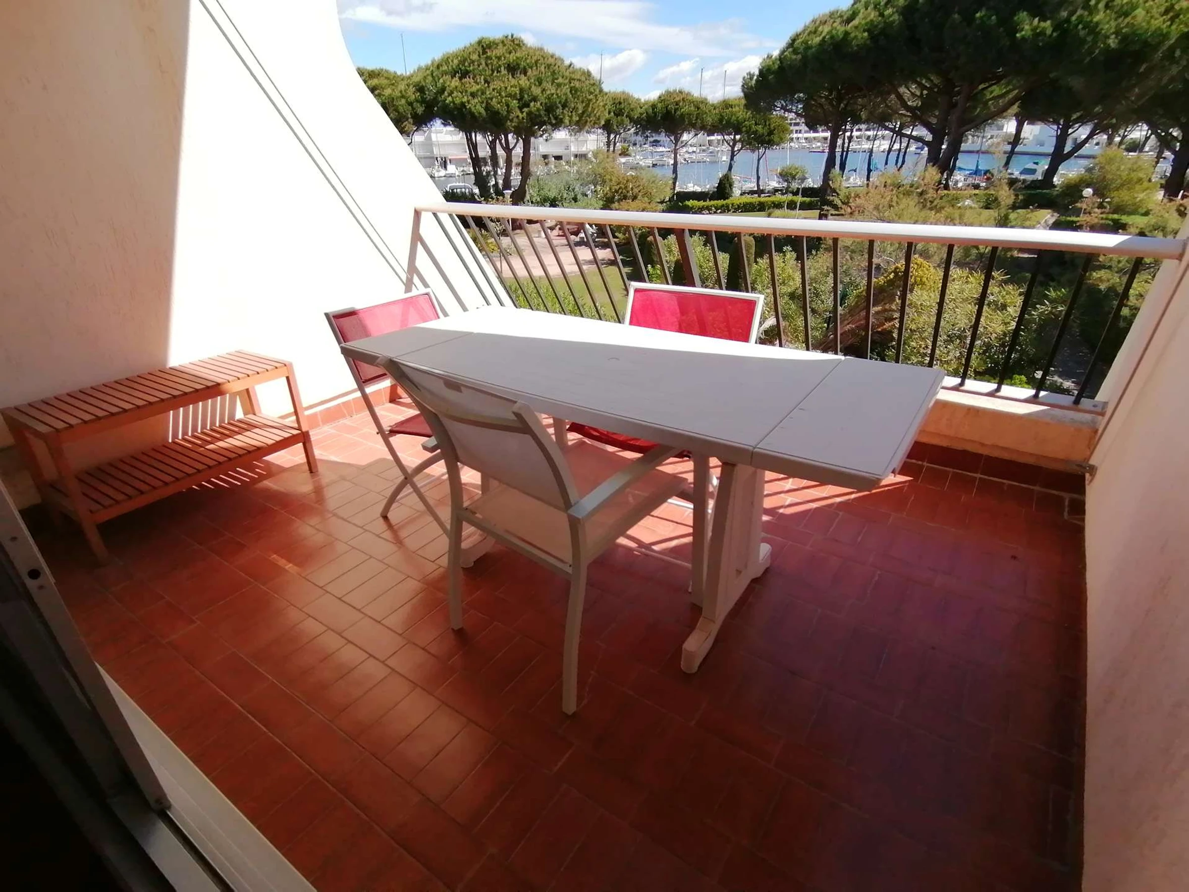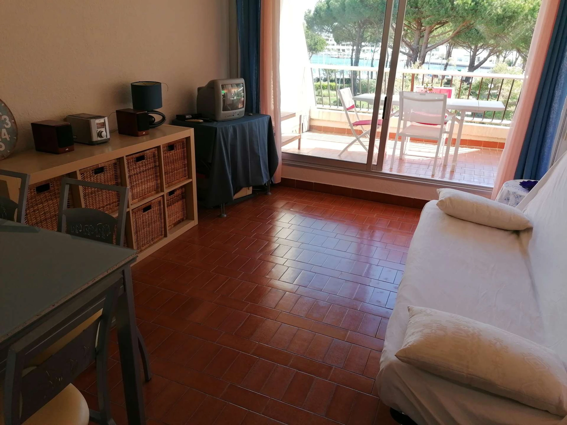 Studio cabine avec terrasse et vue sur le port de plaisance.