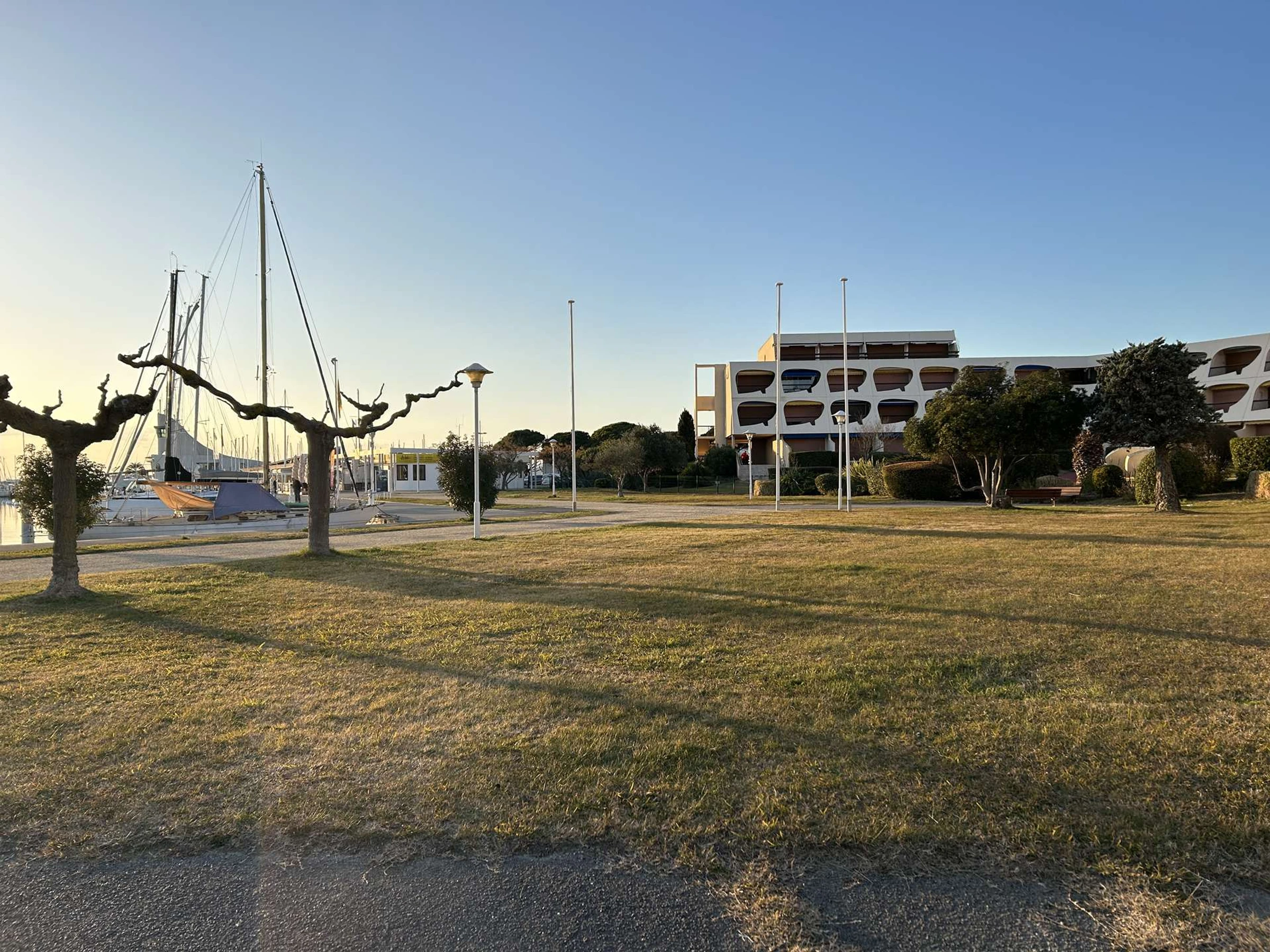 Ce deux pièces cabine se situe dans le quartier nord de Port Camargue, dans la résidence l'Escale Port. Il se situe au 1er étage. Il se compose d'une entrée, d'un séjour avec un bz en 140 cm, une télévision, un coin cuisine équipé avec réfrigérateur congélateur, un lave vaisselle, un lave linge, une chambre avec un couchage double en 140 cm, un coin cabine avec un lit superposé (140 cm en bas et 90 cm en haut), une salle d'eau et un wc indépendant. Une loggia ouverte permet d’agrandir l'espace de vie du séjour.