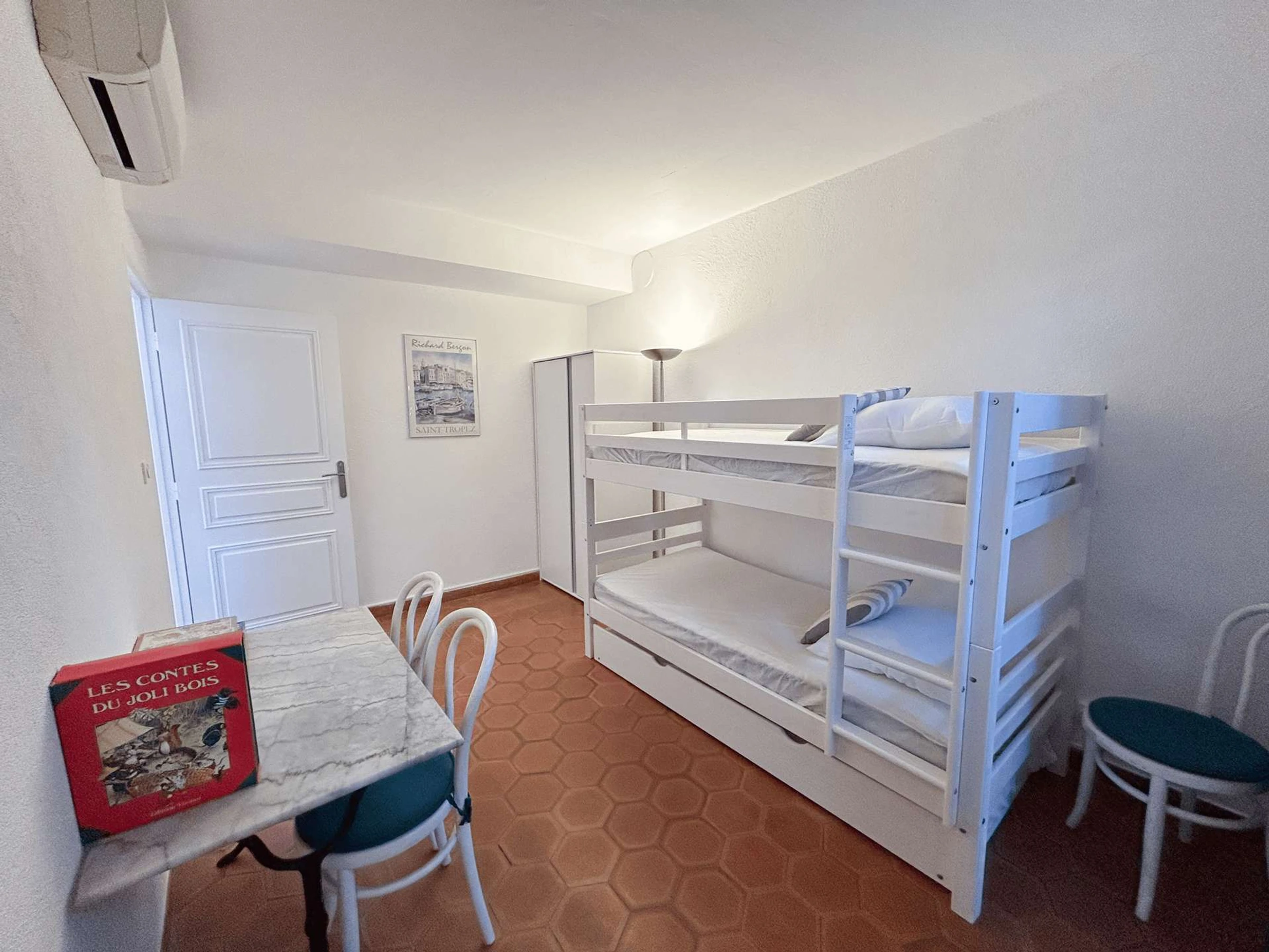 Chambre 3 : lits superposés avec lit tiroir d’appoint et climatisation, idéale pour enfants ou adolescents.