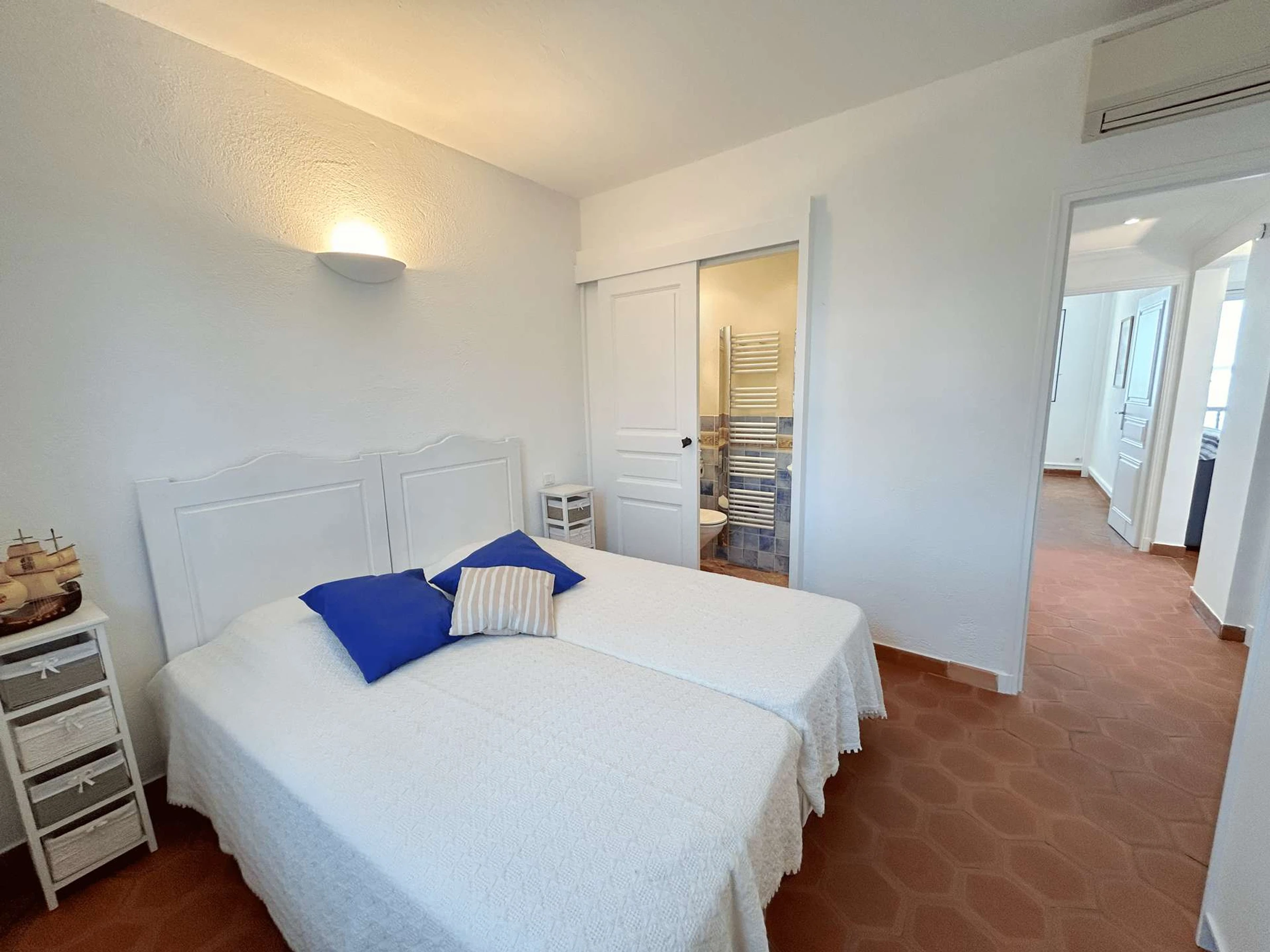 Chambre 2 : deux lits simples rapprochés, salle d’eau privative avec WC et climatisation, parfaite pour un couple ou deux enfants.