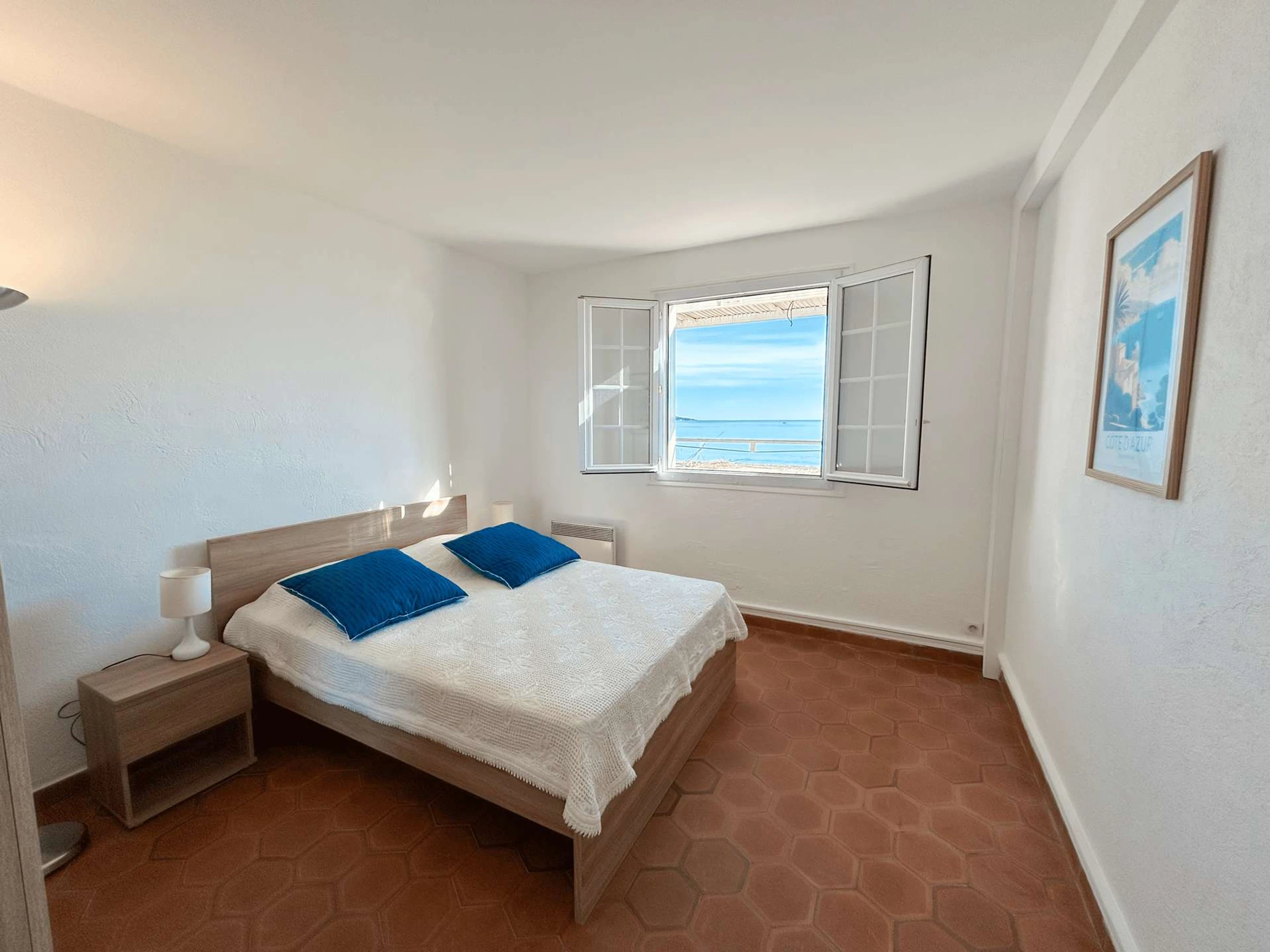 Chambre 1 : lit double 140 cm, vue mer et climatisation.