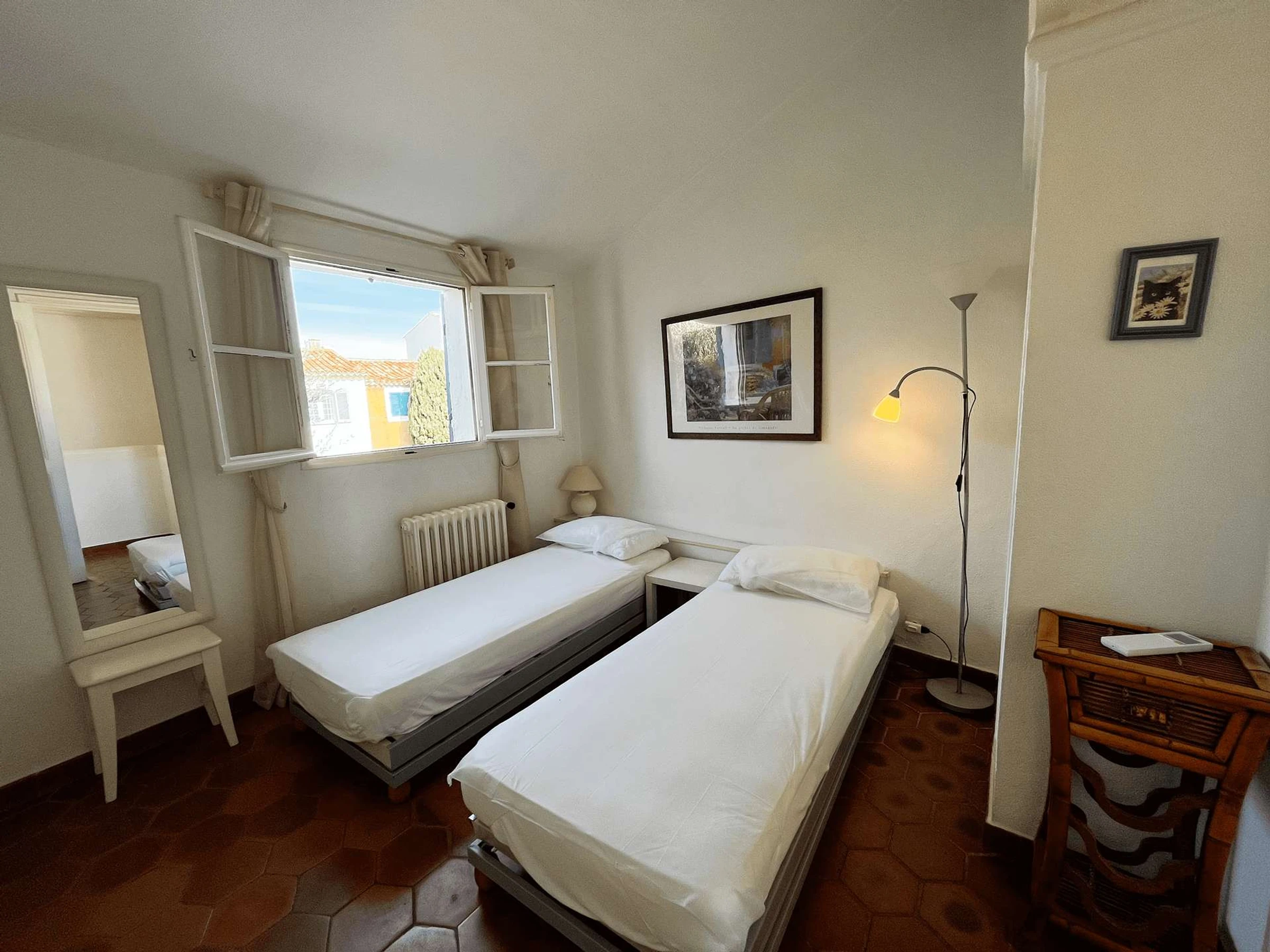 -Chambre 2 côté rue : deux lits simples, salle de bain privative avec WC.