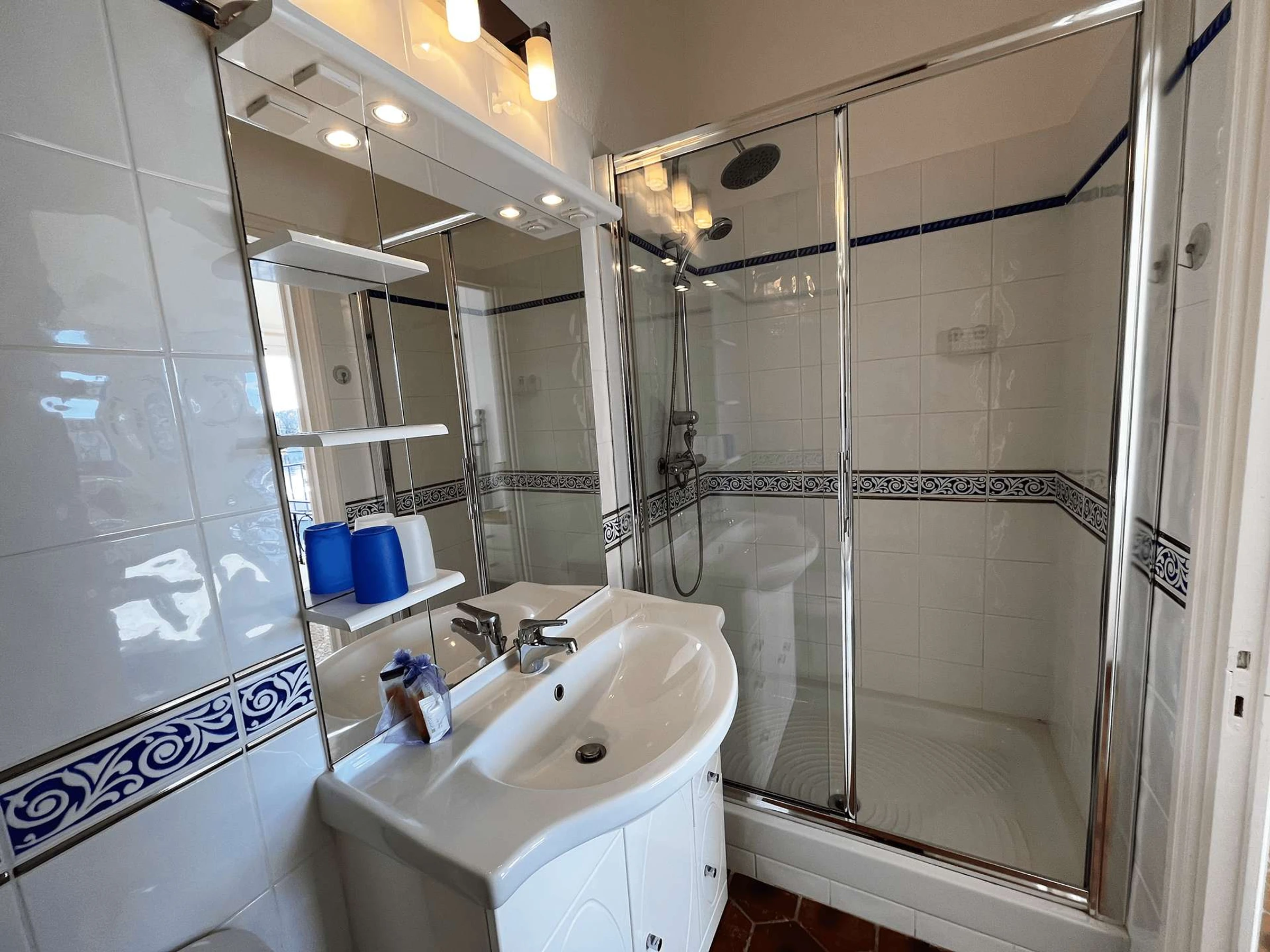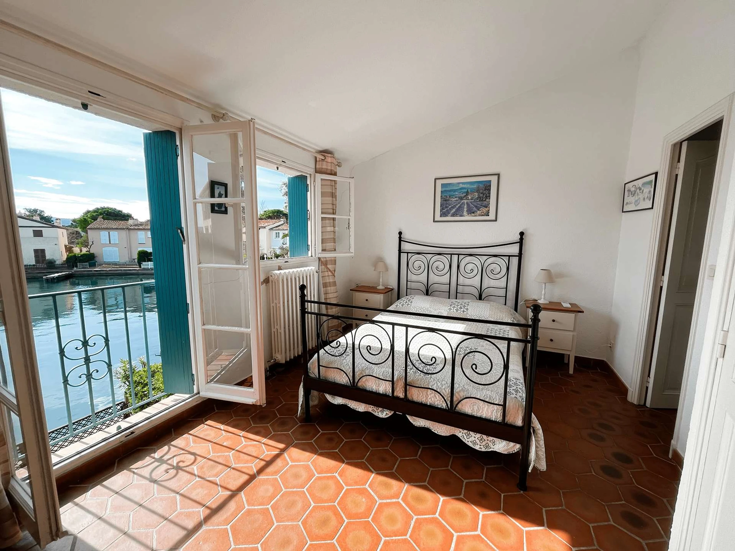 -Chambre 1 côté canal : lit double 140 cm, salle de douche privative, petite vue sur la mer.