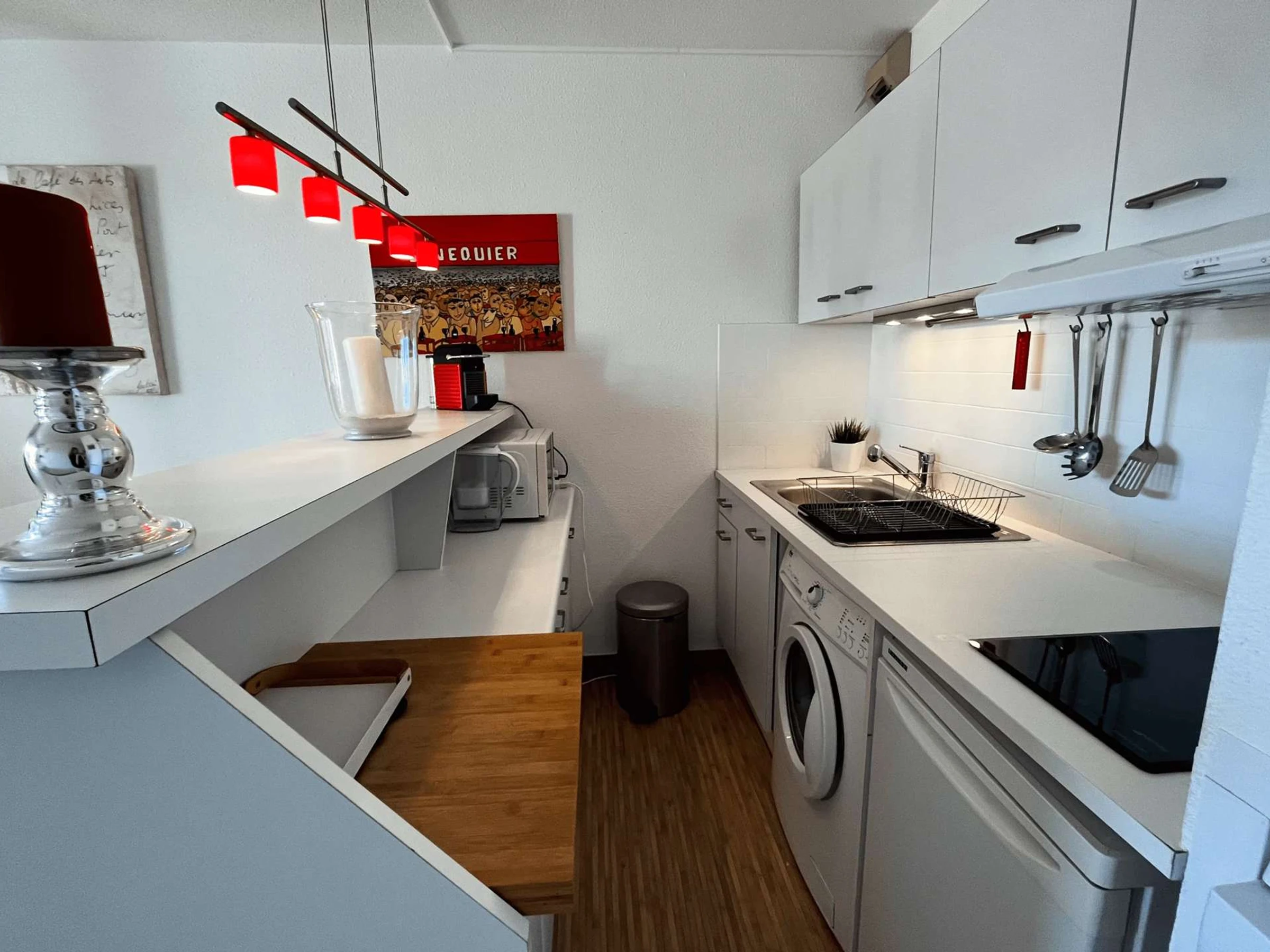Le séjour, climatisé pour garantir votre confort même en été, dispose d’un canapé-lit et donne sur une petite cuisine entièrement équipée, idéale pour préparer vos repas comme à la maison.