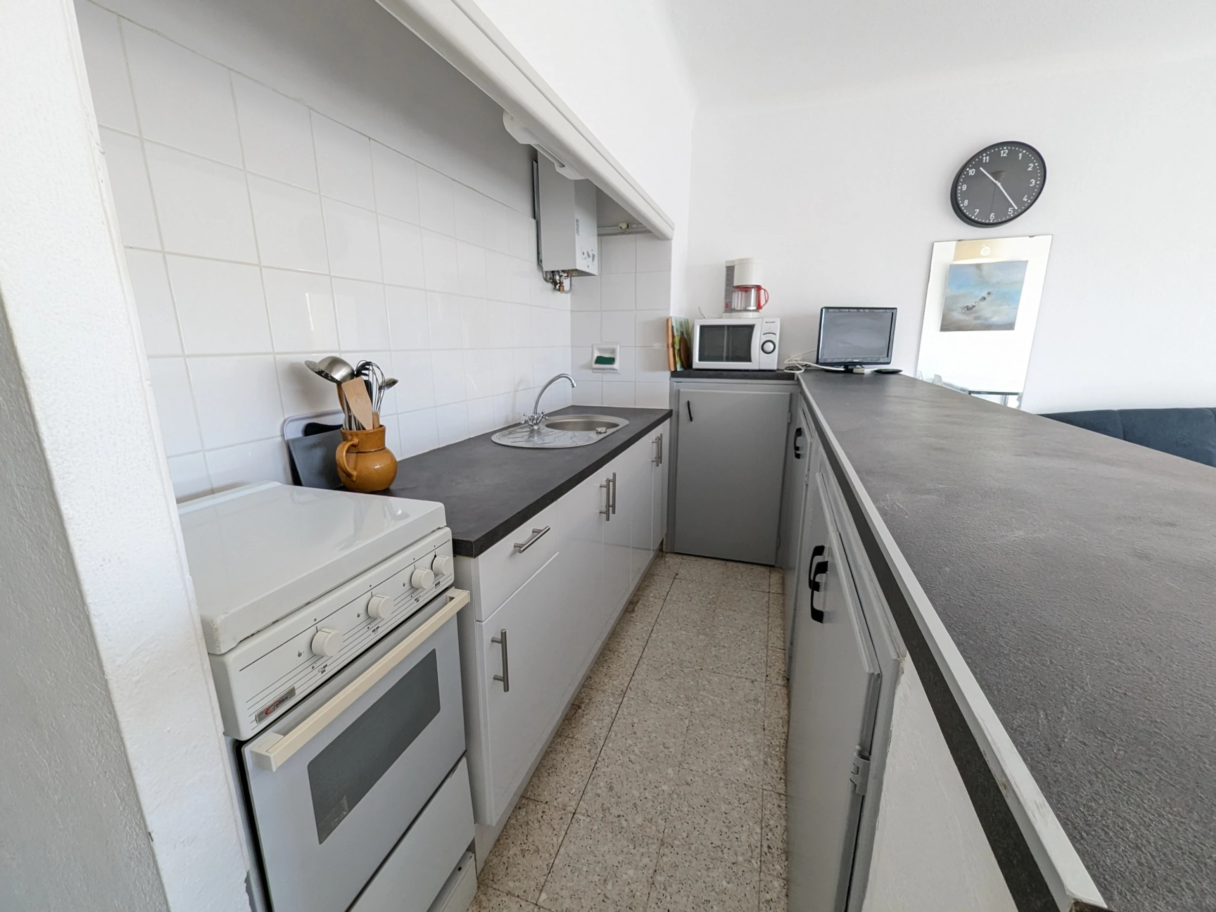 Il offre 1 séjour sur Balcon et sa vue plage; 1 couchage en Clic clac. Coin cuisine équipé & passe plats. Tabourets