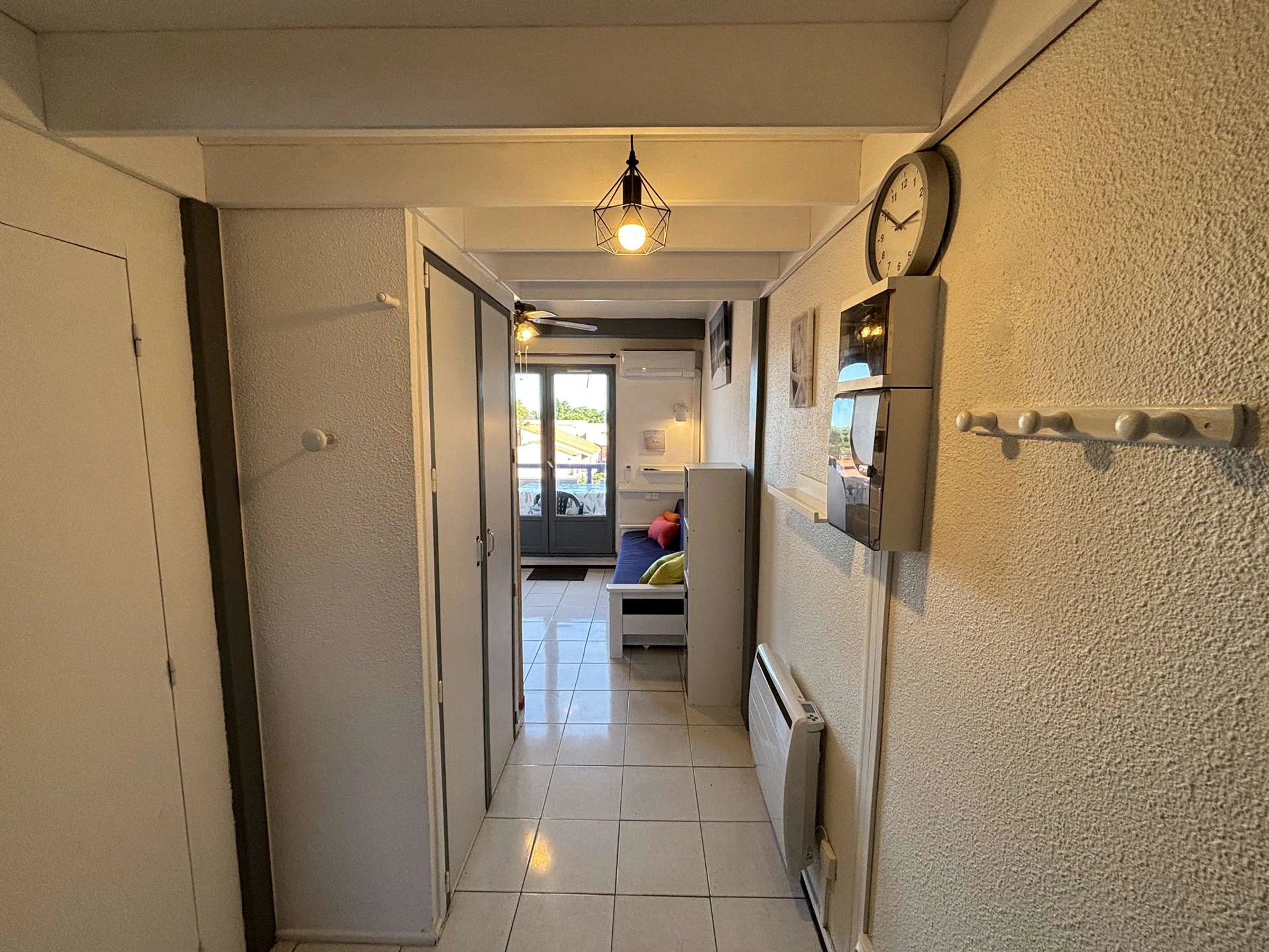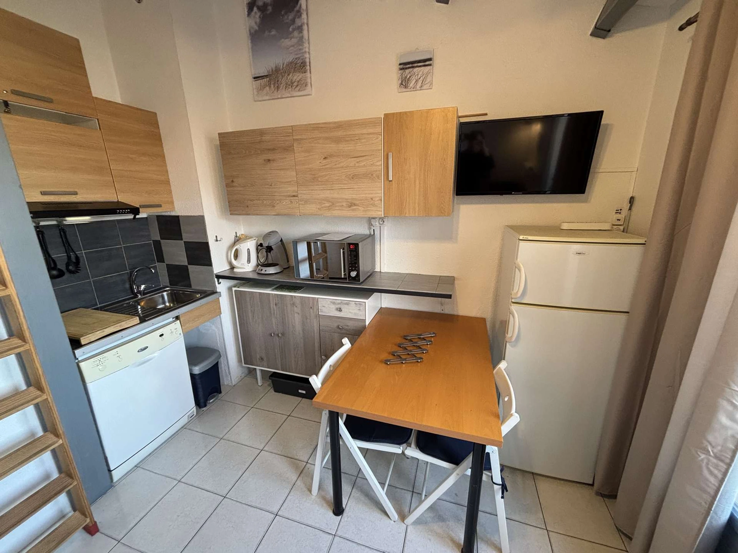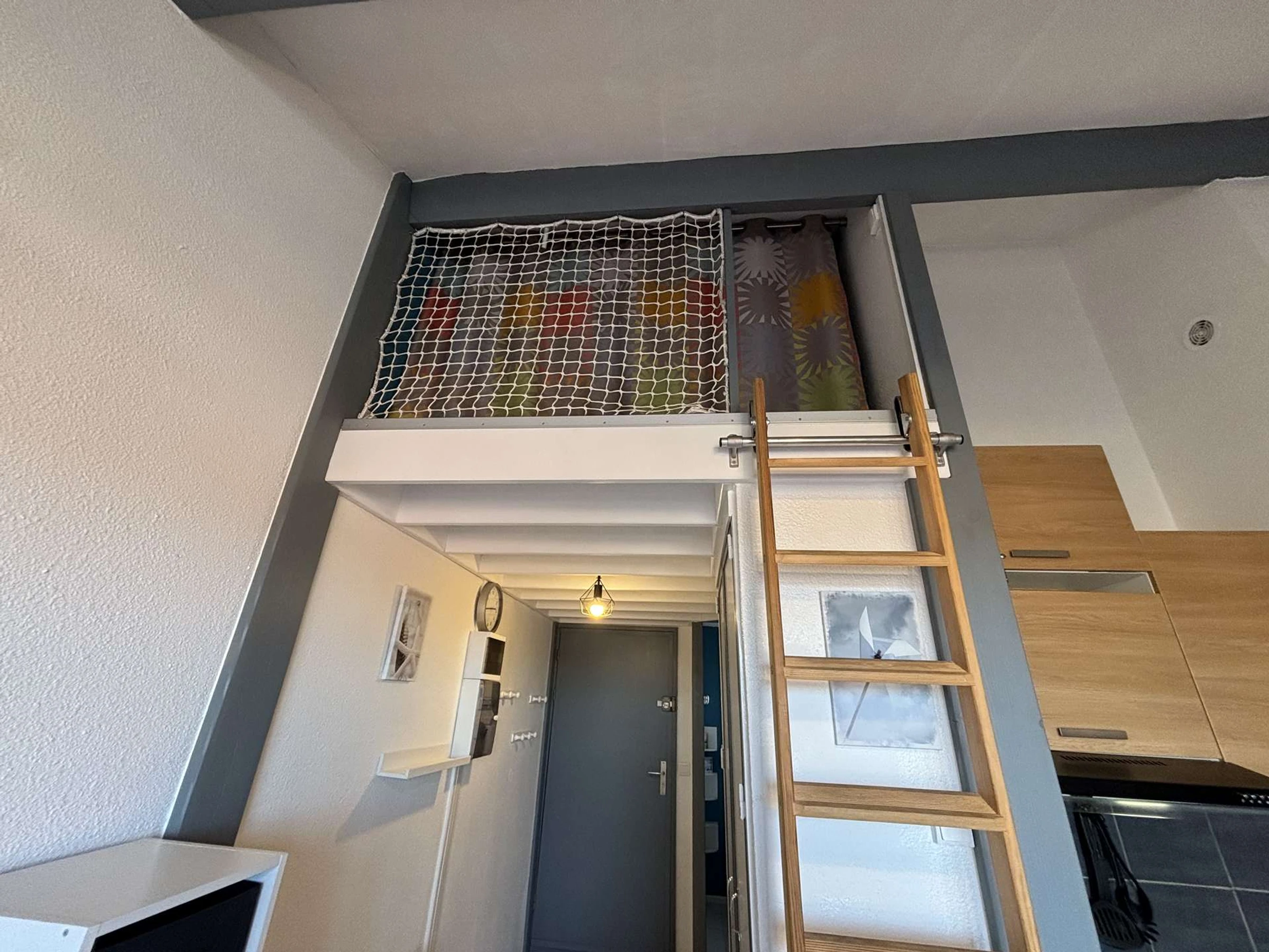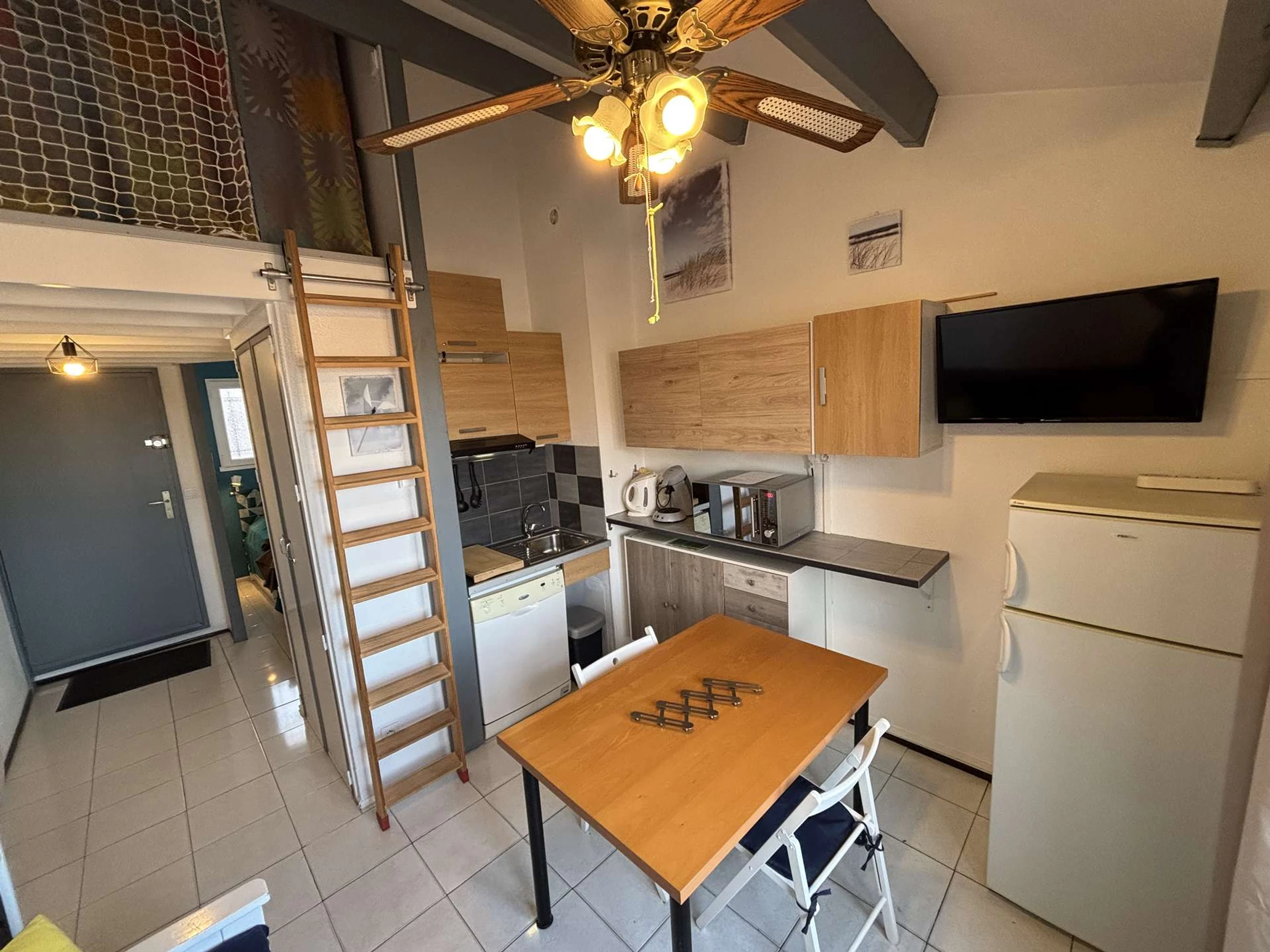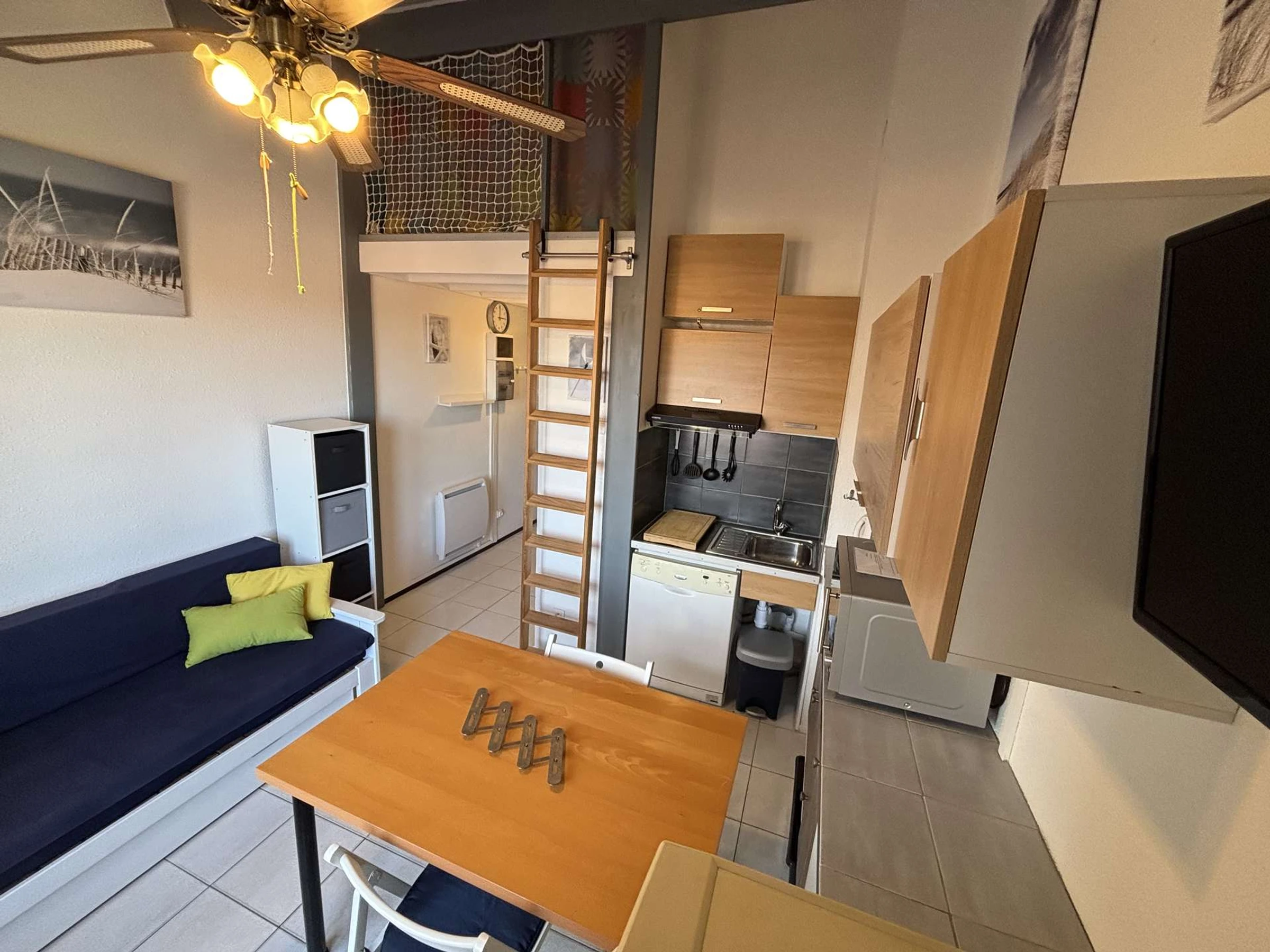 Cet hébergement de vacances rénové, situé au 3 ème étage, comprend un séjour avec télévision et canapé lit une personne (80x200), un coin cuisine équipé, une salle d'eau avec WC. Un coin nuit avec un lit double, et une mezzanine avec un second lit double. Rangements et lave linge.
