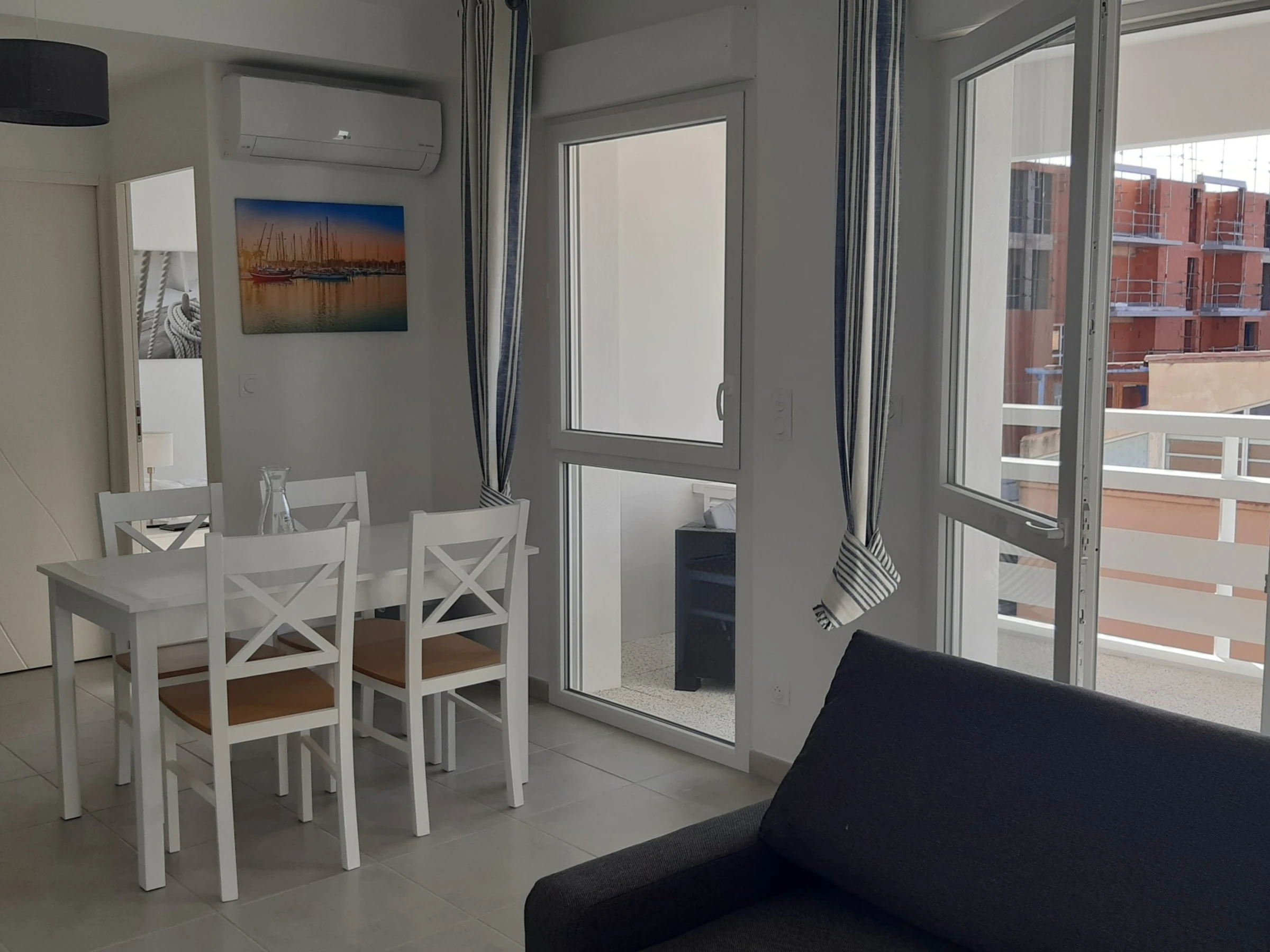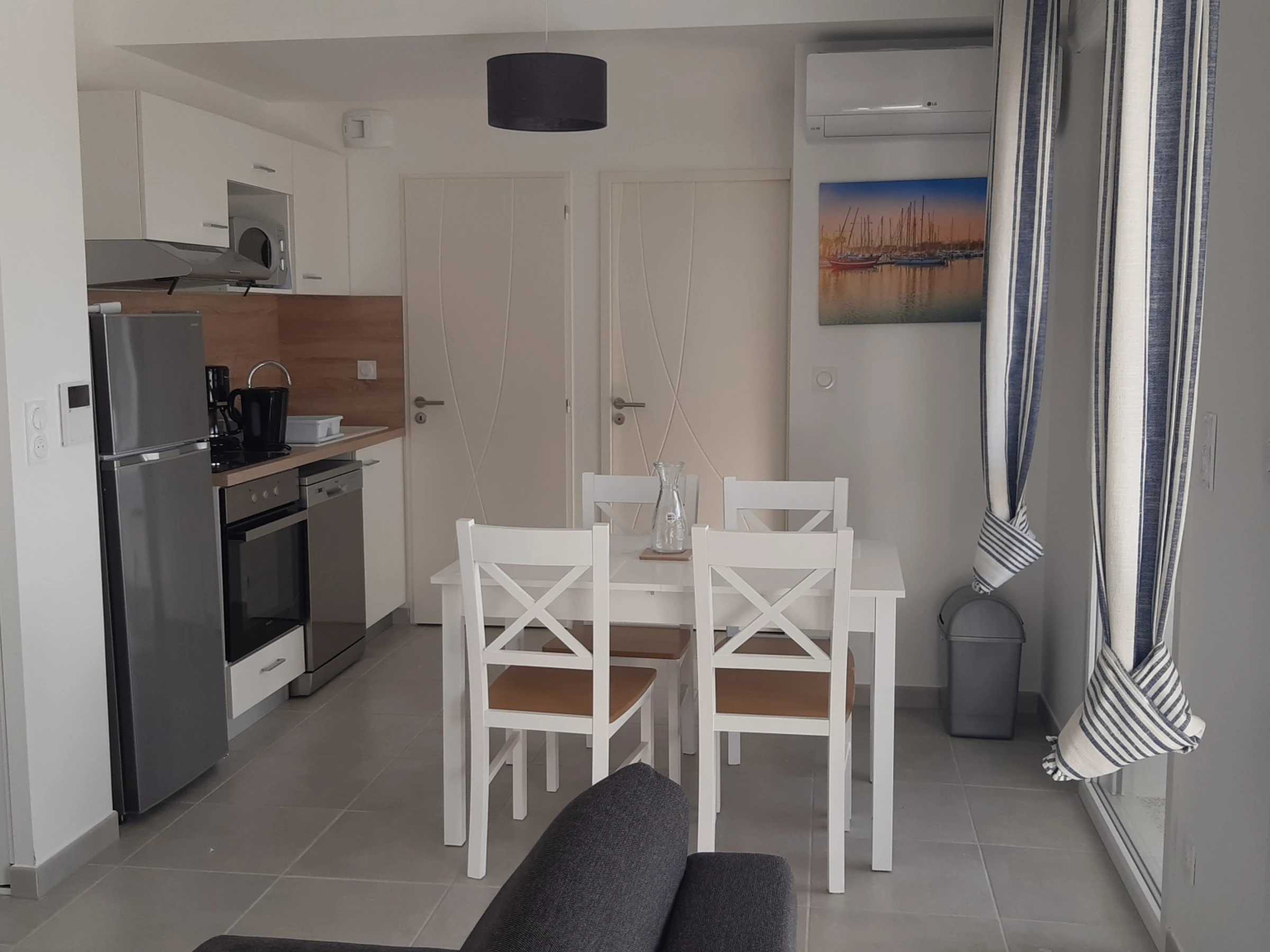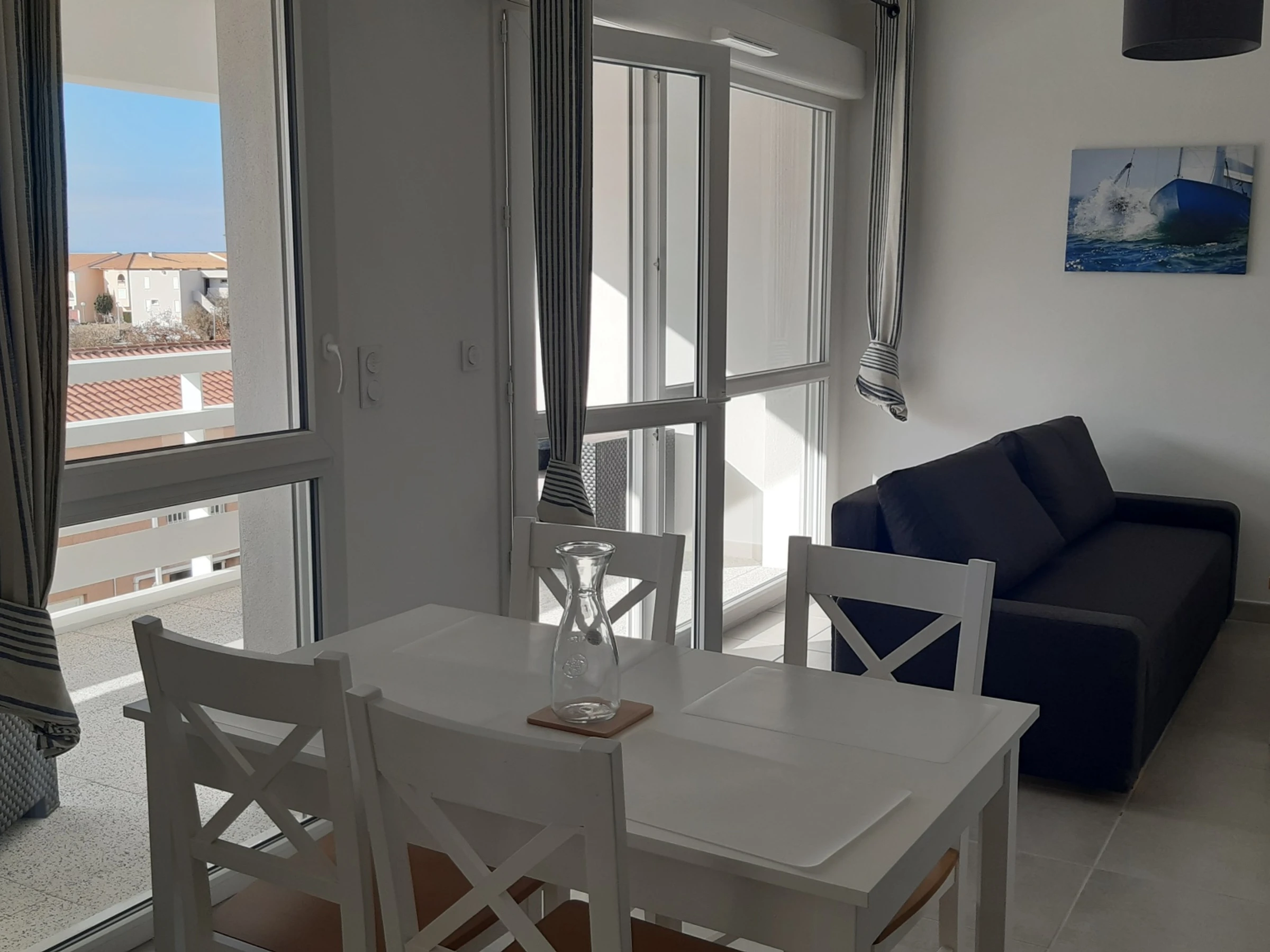 Port Leucate. Résidence Les Voiles Blanches. NOUVEAUTE... Très bel appartement T2 situé au 2ème étage avec ascenseur, exposé S/O. Idéal 4 personnes. Séjour lumineux climatisé (canapé convertible) ouvert sur le coin cuisine équipé (Grd Frigo, Lave Vaisselle, Four) donnant accès à une terrasse (banquette, fauteuils), 1 chambre (lit 140), dressing, 1 salle d'eau-wc. Linge de lit et de toilette fournis lors de votre séjour. Vous disposez d'une place de pkg privée et sécurisée dans la résidence. A 400m de la plage...