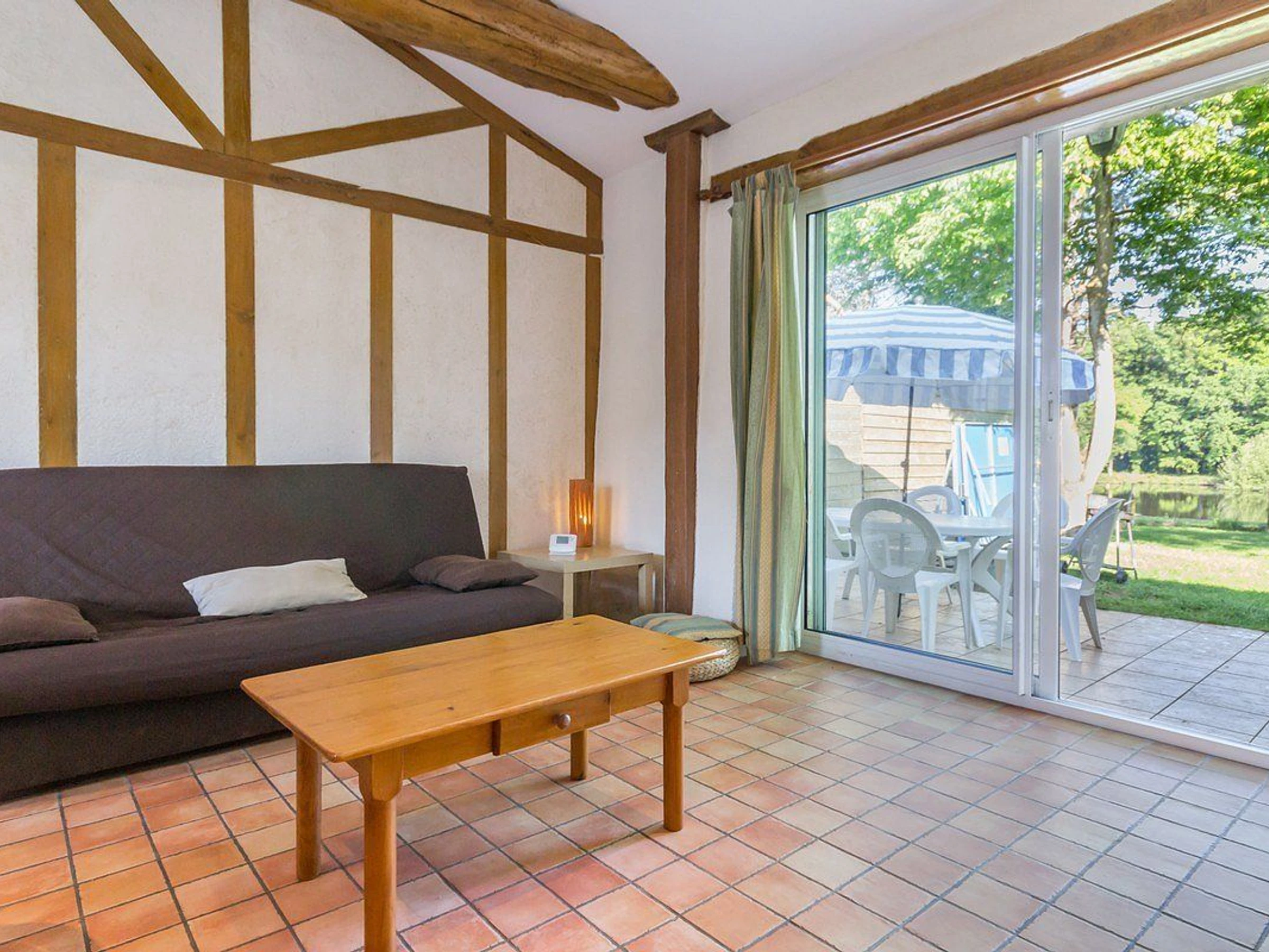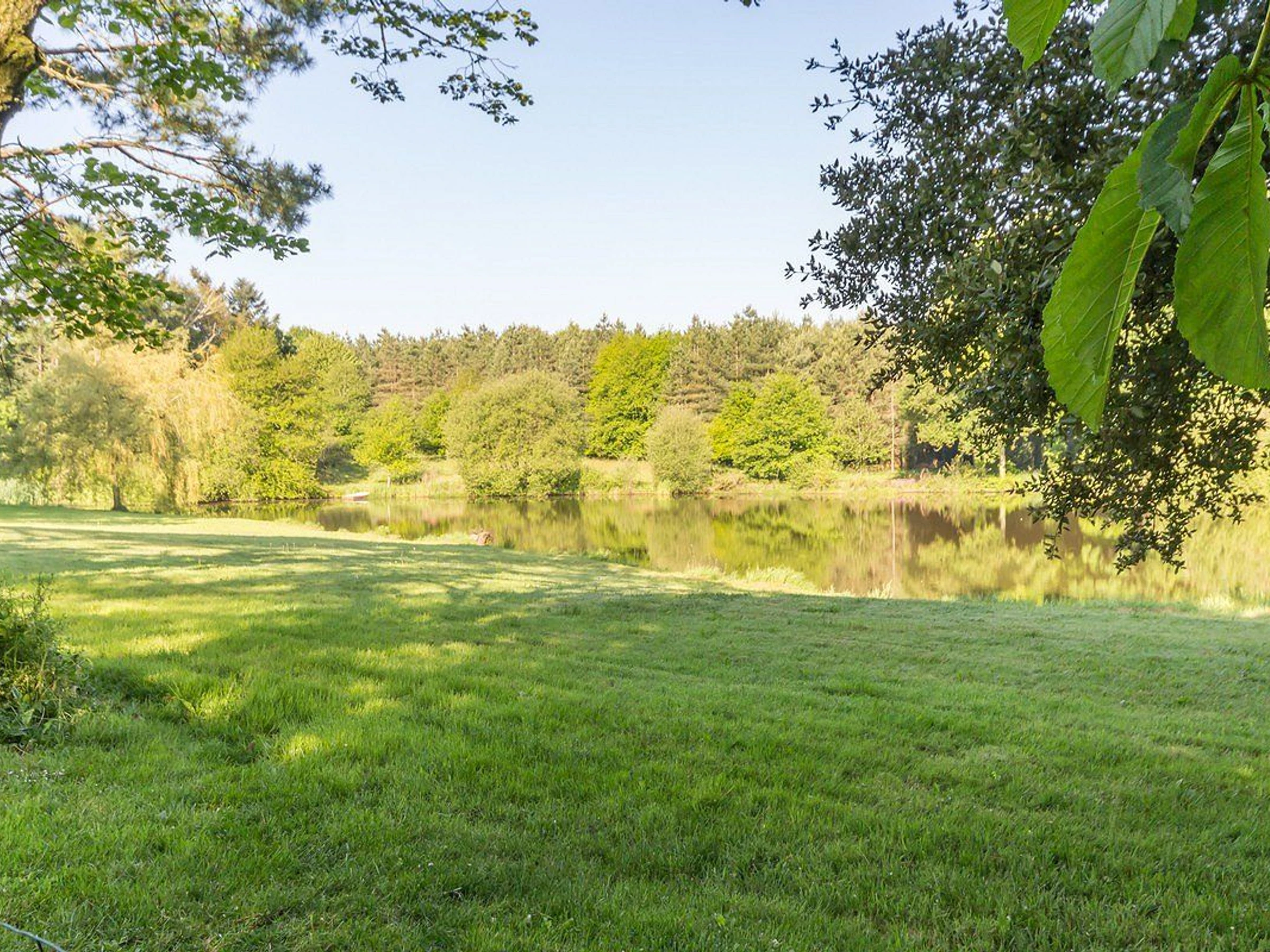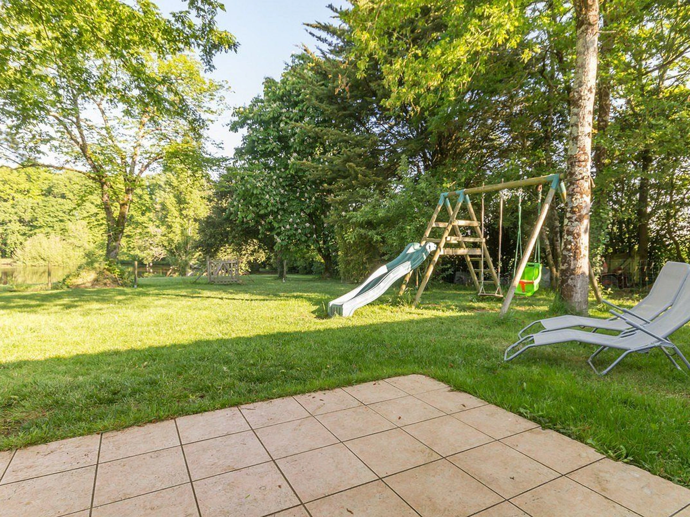 Jardin clos de 500 m² avec terrasse carrelée (orientée Ouest) et parc boisé commun de 3 ha avec étang de 1 ha (pêche possible).
