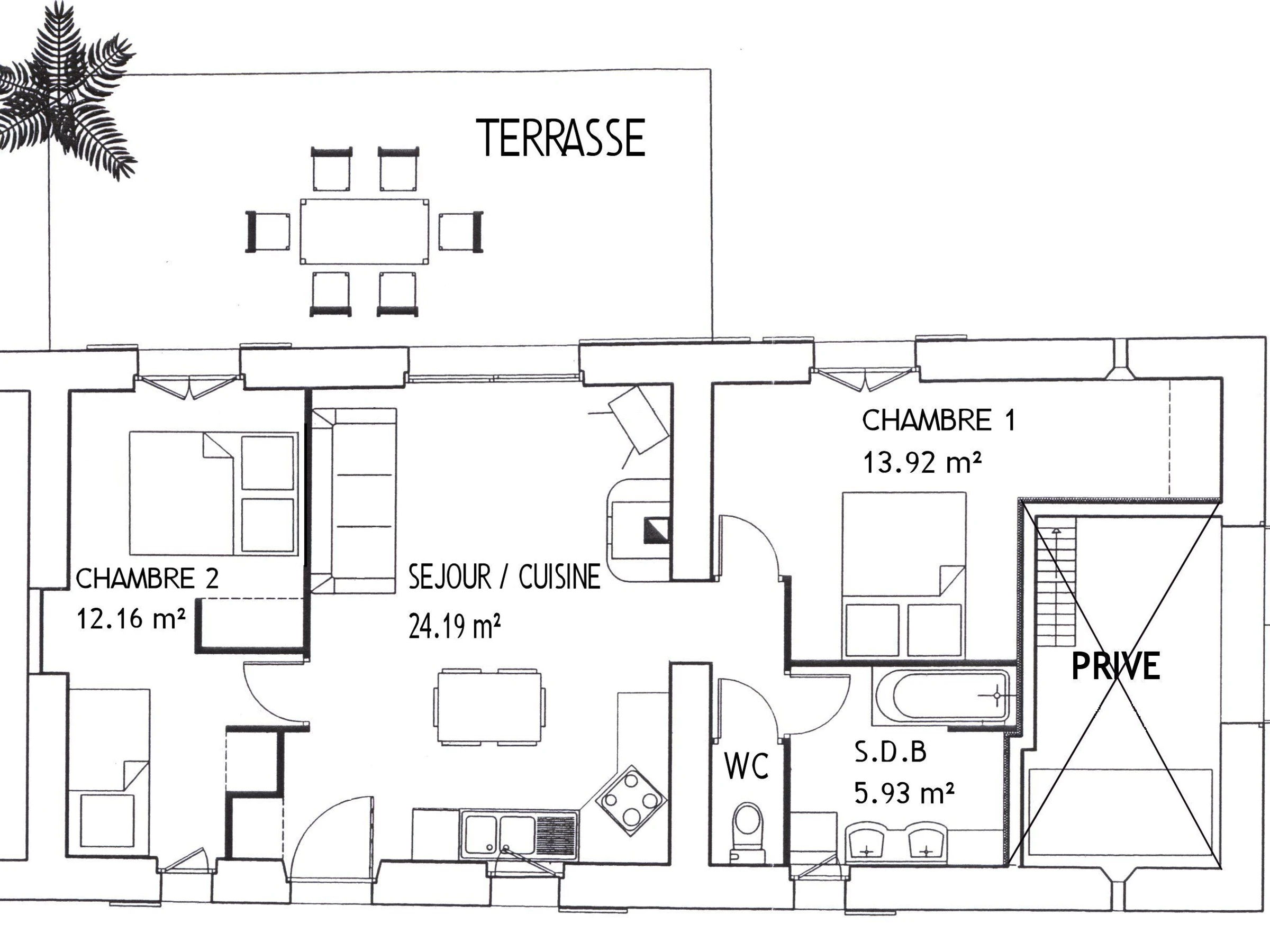 Plain-pied (1 marche à l'entrée) : Salon/séjour avec cuisine aménagée ouverte, 2 chambres (1: 1 lit 140x190, 2: 1 lit 140x190 et 1 lit 90x190), salle de bain et WC indépendant (1 marche pour accéder à la chambre 1, la salle de bain et les WC).
