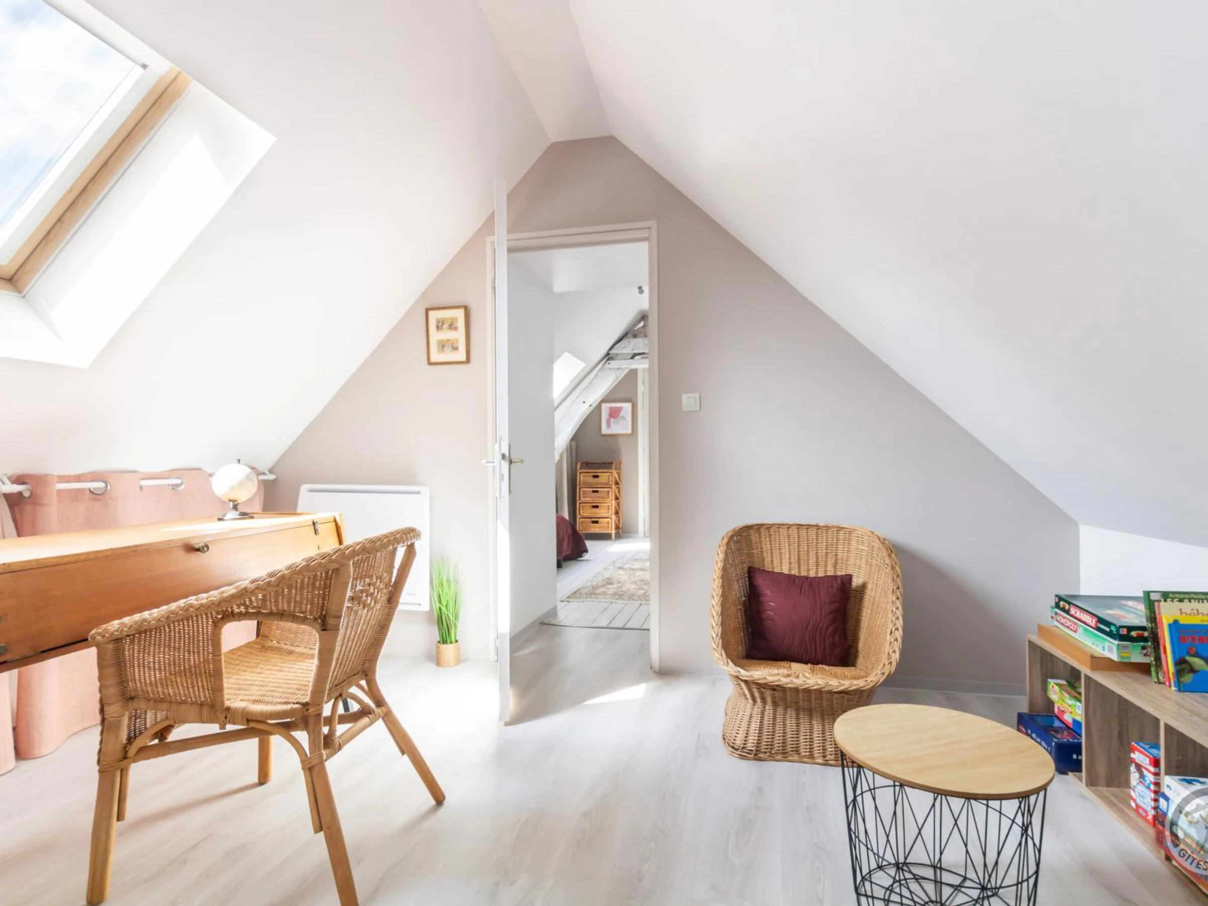 Maison indépendante. Au rez-de-chaussée : Séjour avec poêle à pellets (1er sac offert). TV avec chaînes étrangères. Internet par la Fibre. Cuisine (plaque 3 feux gaz et 1 électrique, mini four, lave-vaisselle, réfrigérateur, compartiment congélateur, micro-ondes, machine Expresso (Senséo) et cafetière classique. Accessible par une marche, chambre 1 (lit 160x200). Salle d'eau (lave-linge), WC indépendant. Vestiaire. A l'étage, palier mezzanine avec bureau et jeux. Chambre 2 (2 lits de 90X190). Chambre 3 en enfilade (lit de 140x190). Équipement bébé sur place. Linge de lit fourni et lits faits à l'arrivée. Linge de toilette en location. Service ménage en supplément. Chauffage électrique en supplément. Jardin clos privé. Terrasse. Salon de jardin. Barbecue. Transats. Abri de jardin (local vélos). Parking. Boulangerie à 800m. Il était une fois un rêve de maison de vacances qui devenait réalité dans un petit coin tranquille du Cotentin. Avec un séjour chaleureux autour du poêle à pellets, la petite cuisine à l'arrière et son accès à la terrasse, ses chambres mansardées douillettes et la mezzanine pour s'isoler ou jouer, voilà une adresse qui permet de couler des jours heureux. Cette propriété est à proximité des grandes plages de sable de la côte Ouest du Cotentin. La ruelle qui passe devant la maison vous mènera jusqu'à la voie verte 2km plus loin et le village pittoresque de Portbail. Dotée d'un large terrain bien clos, elle ravira les familles en quête de quiétude !