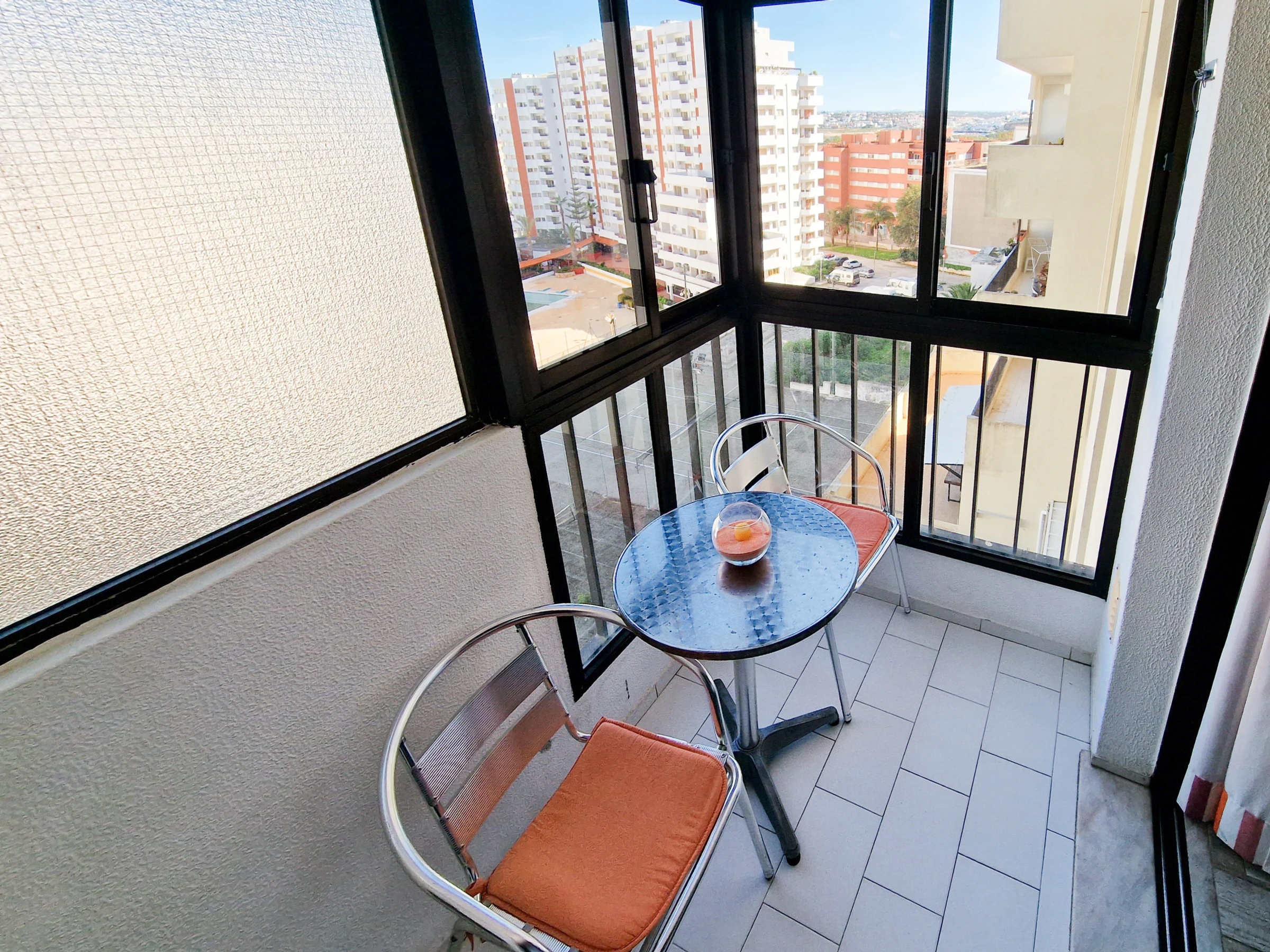 Le balcon avec table et chaises permet de profiter de l'extérieur, tandis que la piscine de la copropriété (disponible de mai à septembre) offre une excellente option pendant les mois d'été.