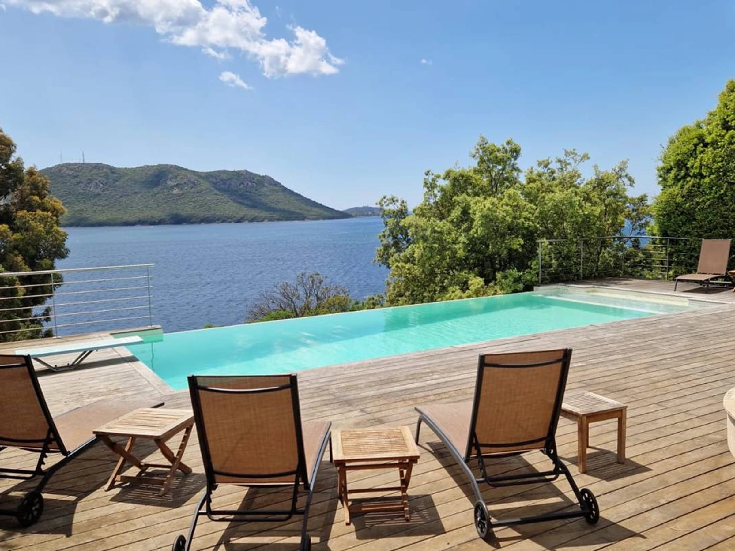 Une terrasse en Ipé exposée plein sud avec table et chaises de jardin , salon de jardin avec une belle vue mer et une piscine a débordement de 10x4 sécurisée par un volet roulant, 10 transats de piscine et une douche extérieure.