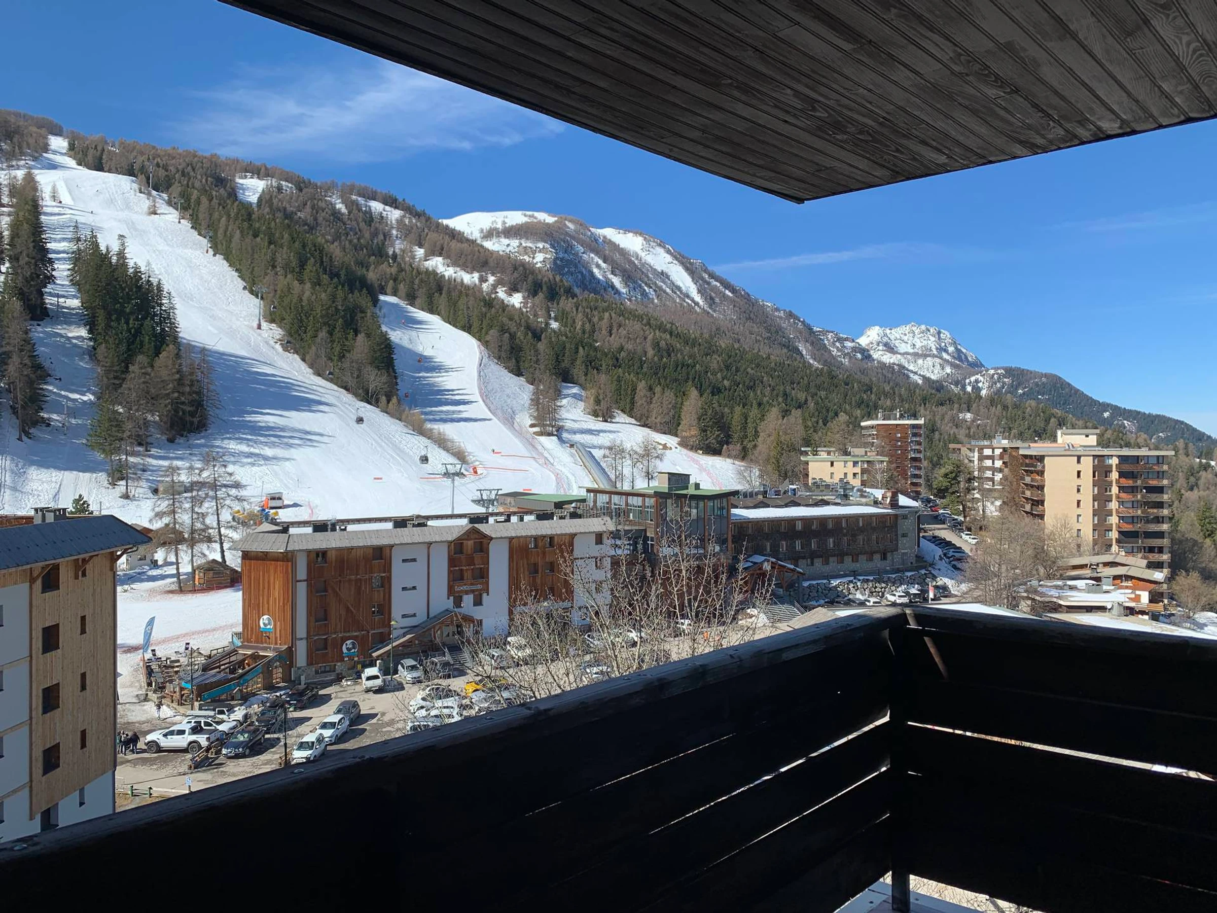 Appartement 3 pièces pour 6 personnes, d'environ 45 m². Situé au 5ème étage, avec ascenseur. Exposition Sud/Ouest avec un petit balcon et une jolie vue sur la station et les pistes.