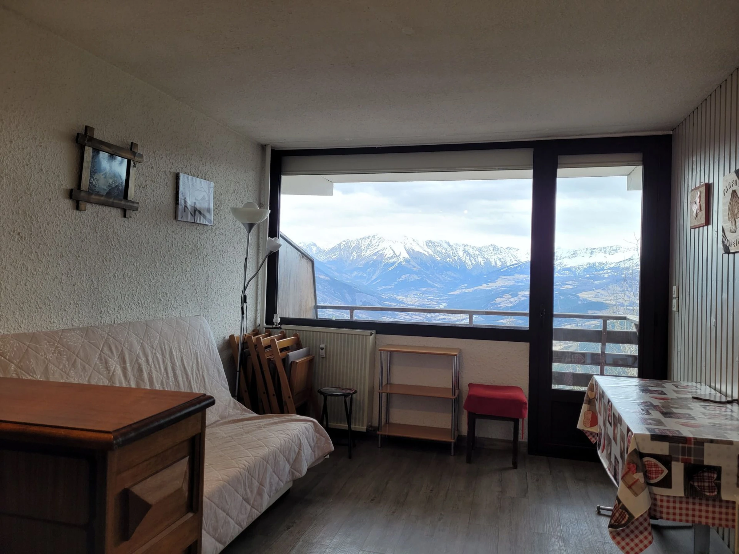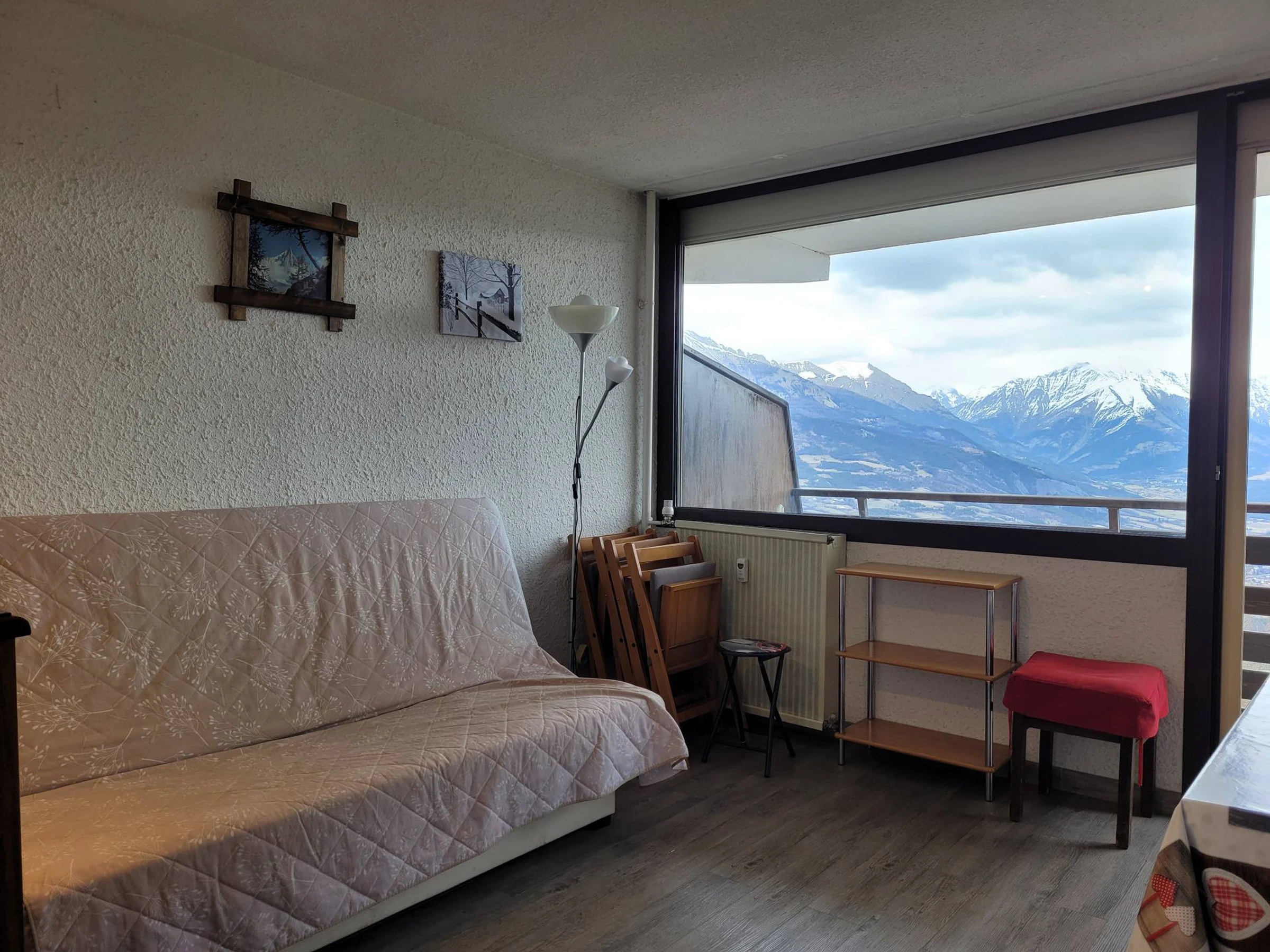 COMMENTAIRES : Agréable studio avec un panorama magnifique sur les montagnes environnantes et la vallée. Couettes et couvertures. Parquet au sol. Chauffage et eau chaude collectifs. Box à skis Obligatoire. Proximité des pistes.