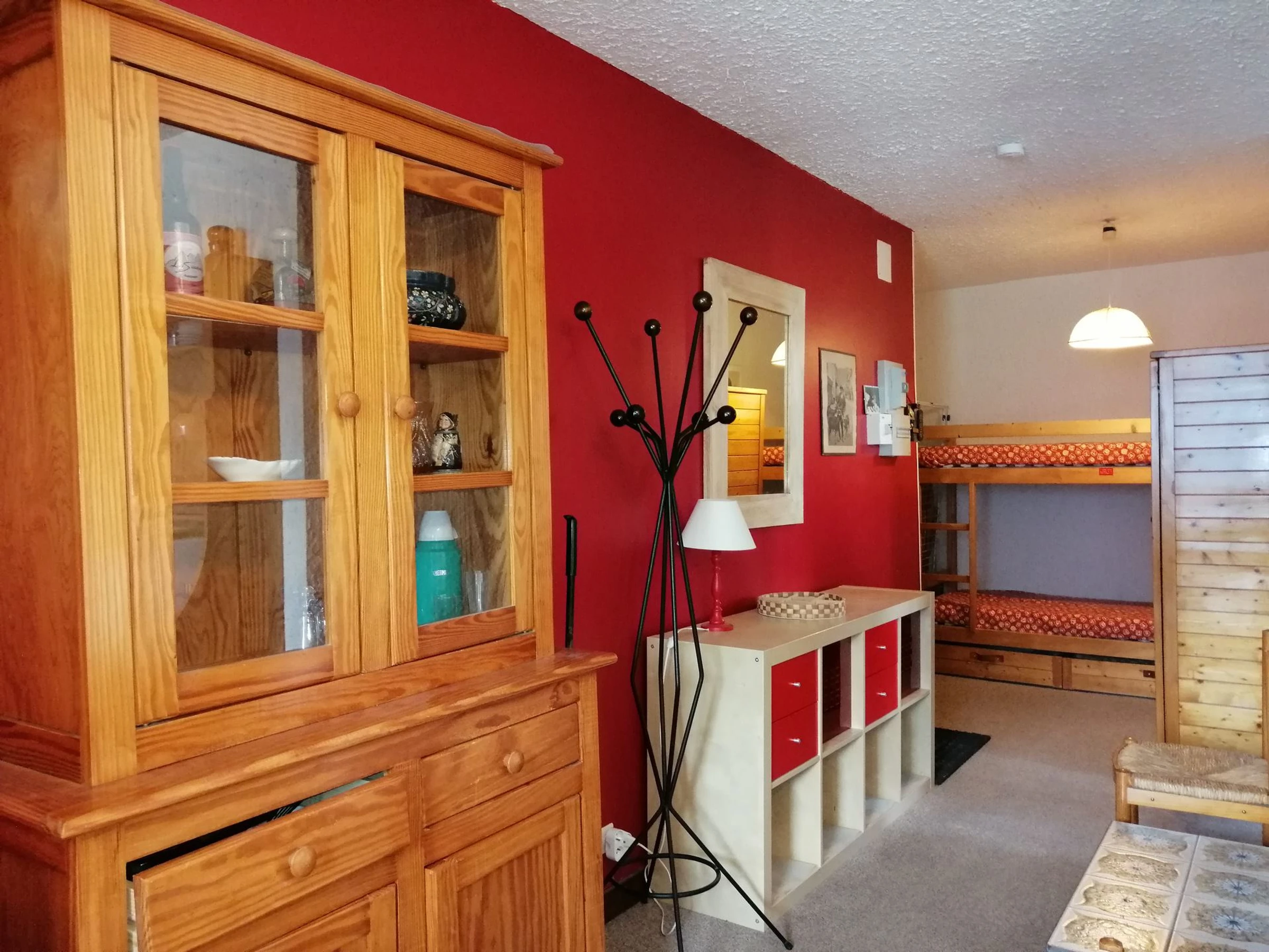* Entrée / Coin Montagne : 2 lits superposés avec couettes, armoire ;
