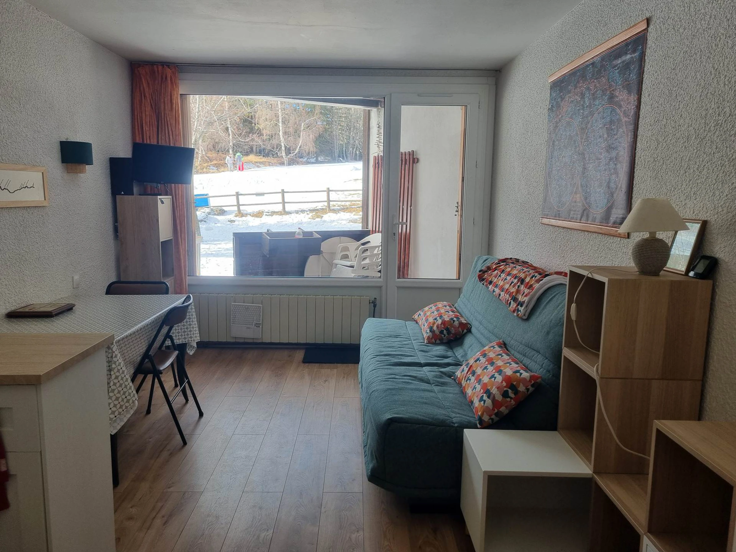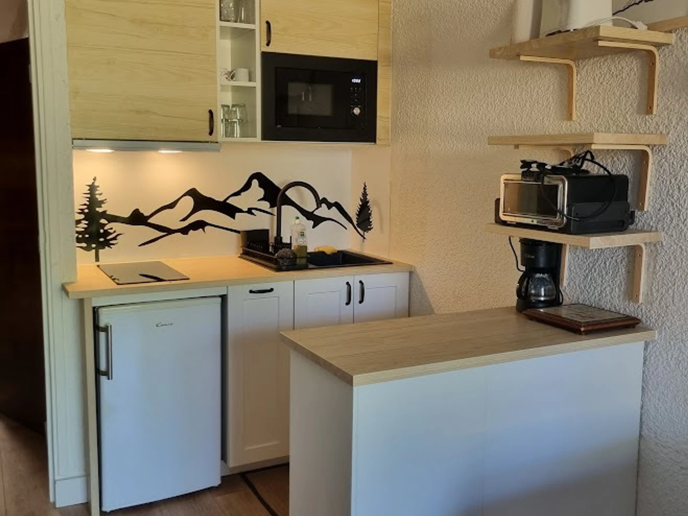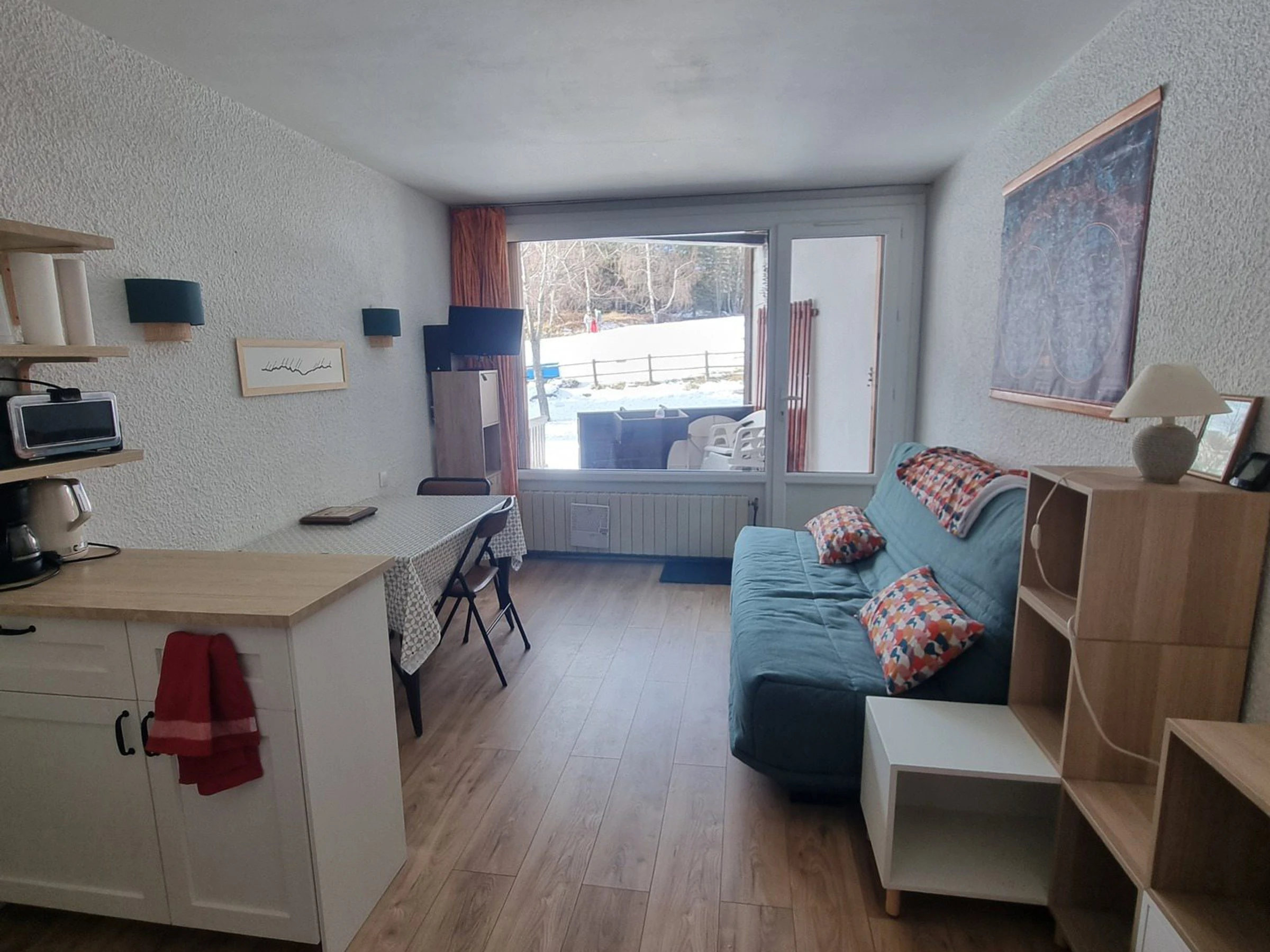Le studio de 25 m2 comprend un coin montagne avec 2 lits superposés (70x190), une salle de bain, un WC séparé , une pièce à vivre avec un coin cuisine enèrement équipé (plaques électriques, frigo avec compartiment congélation, mini four, micro-ondes, cafetière à filtre, cafetière nespresso, grille-pain, appareil à raclette, mixeur, fouet électrique), un espace repas et un canapé lit (clic clac de 140x198) donnant sur une terrasse privative et le jardin de la copropriété.