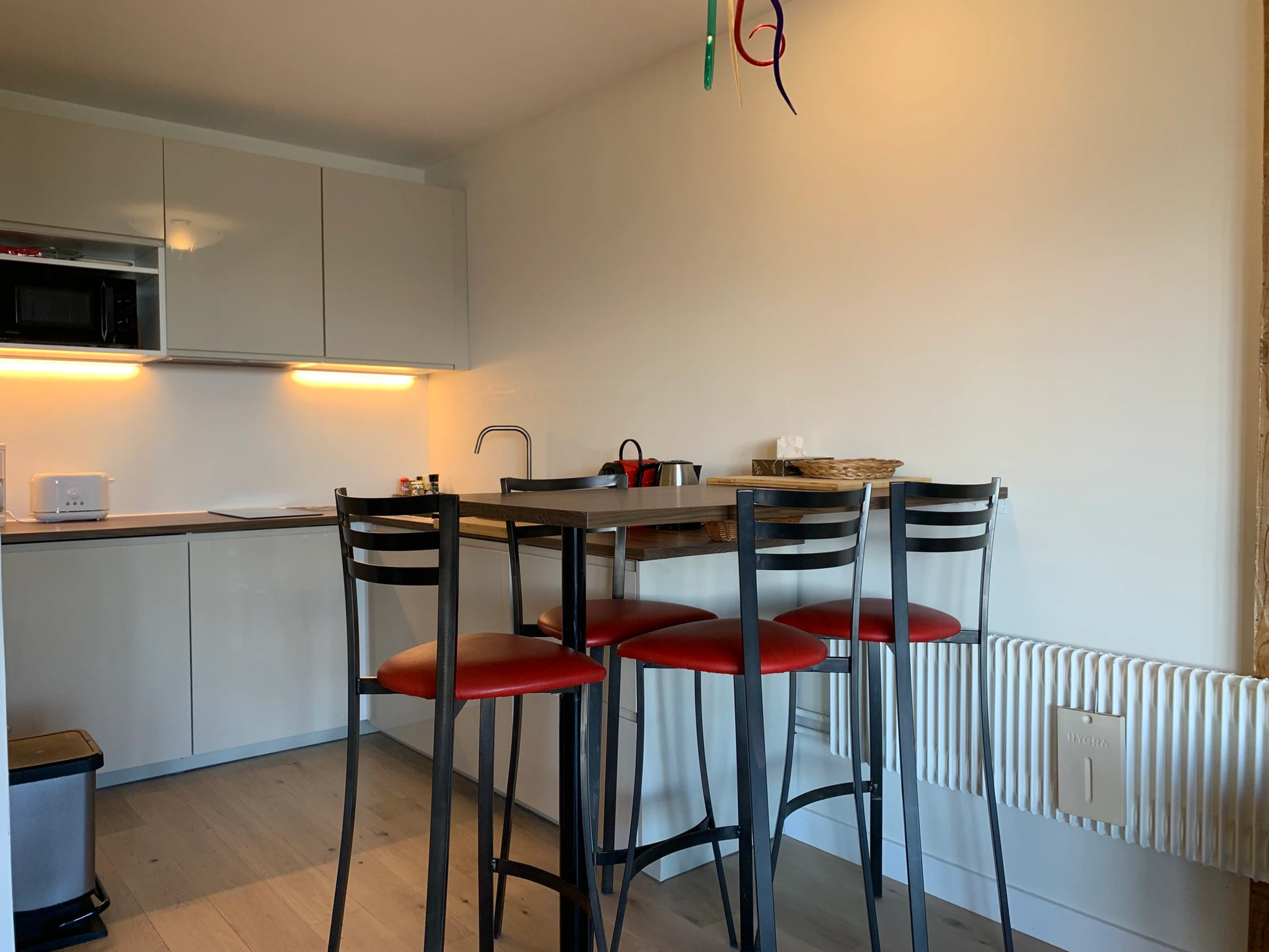 * Cuisine moderne avec table îlot/bar, 4 tabourets, plaques induction, micro-ondes, lave-vaisselle, frigo, café filtre et café Nespresso, grille pain, bouilloire.