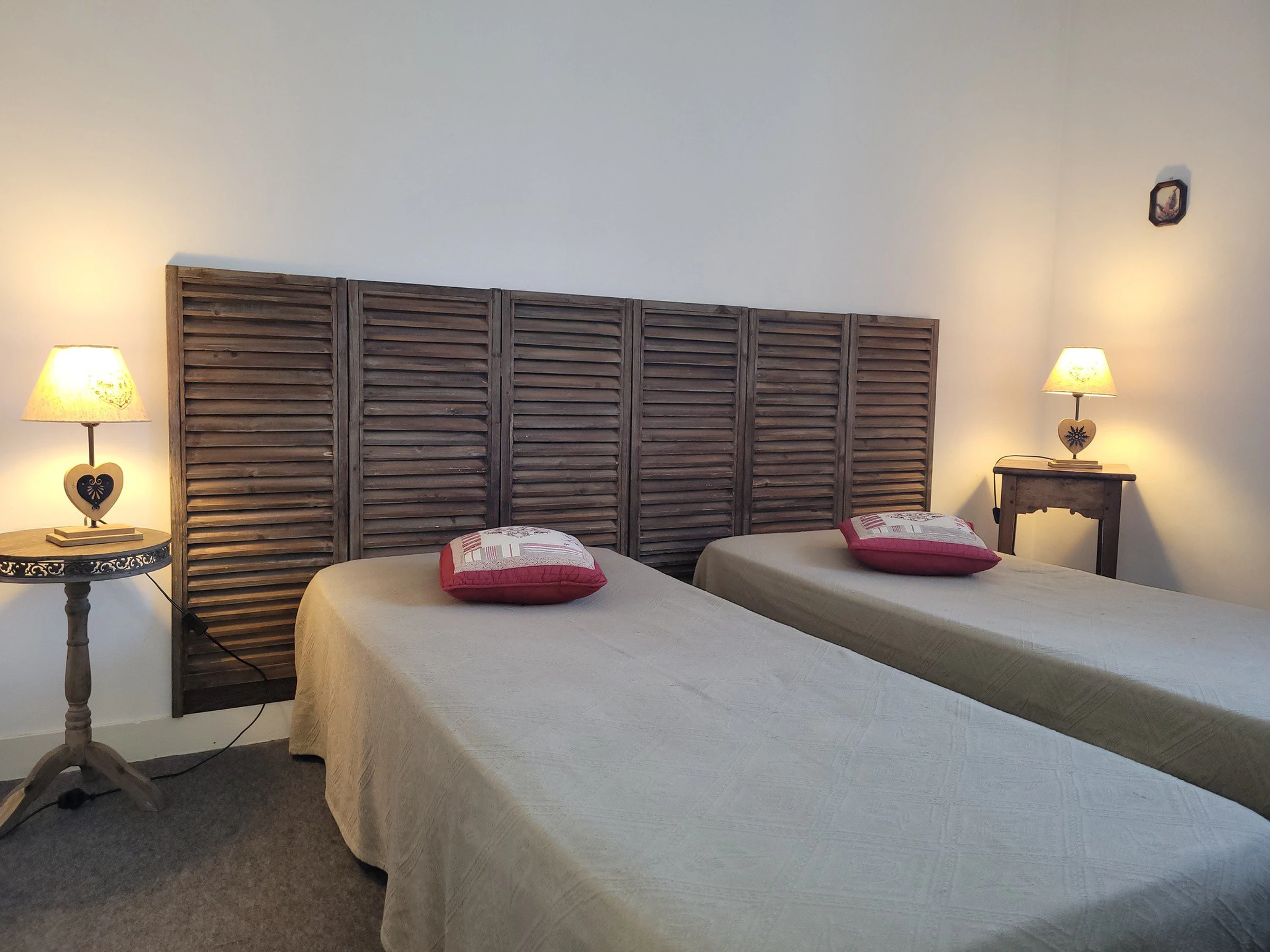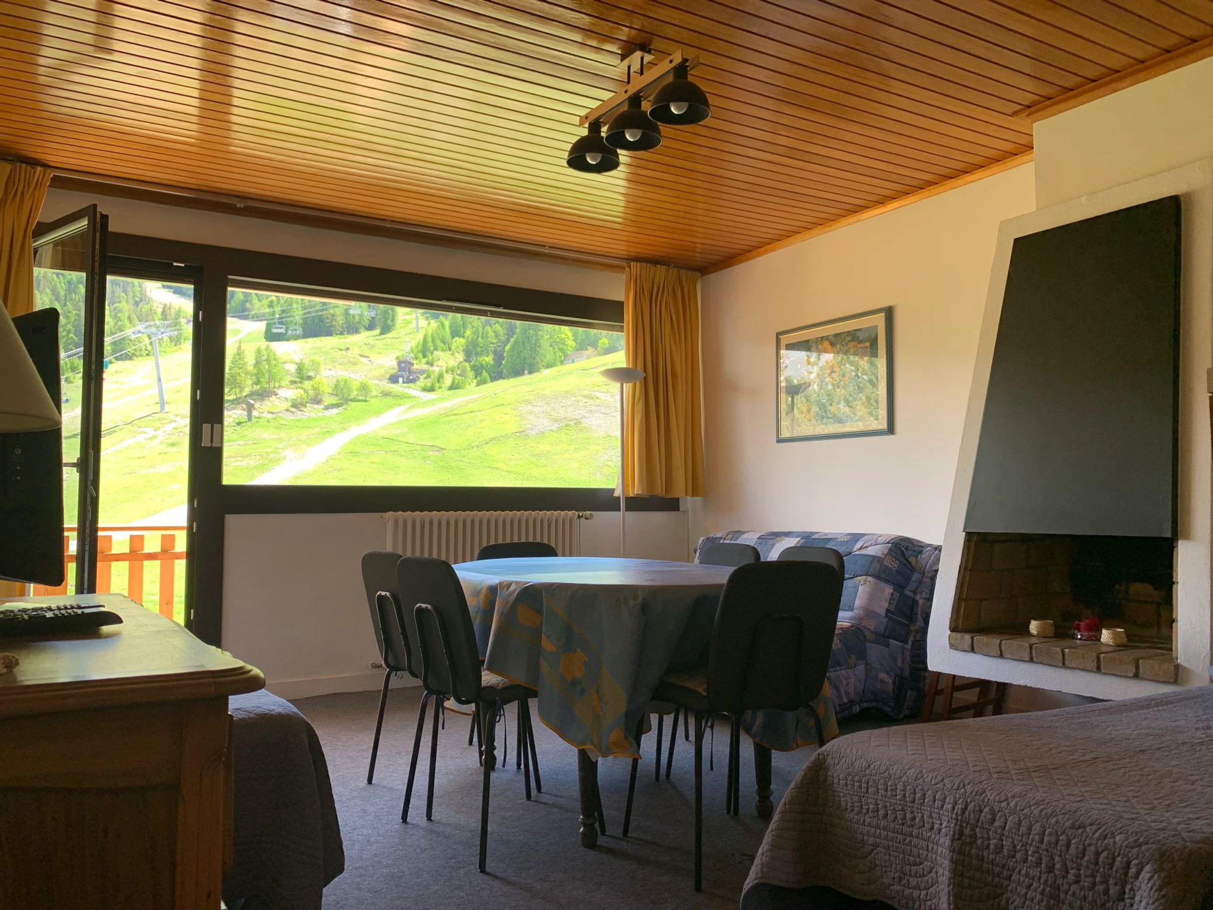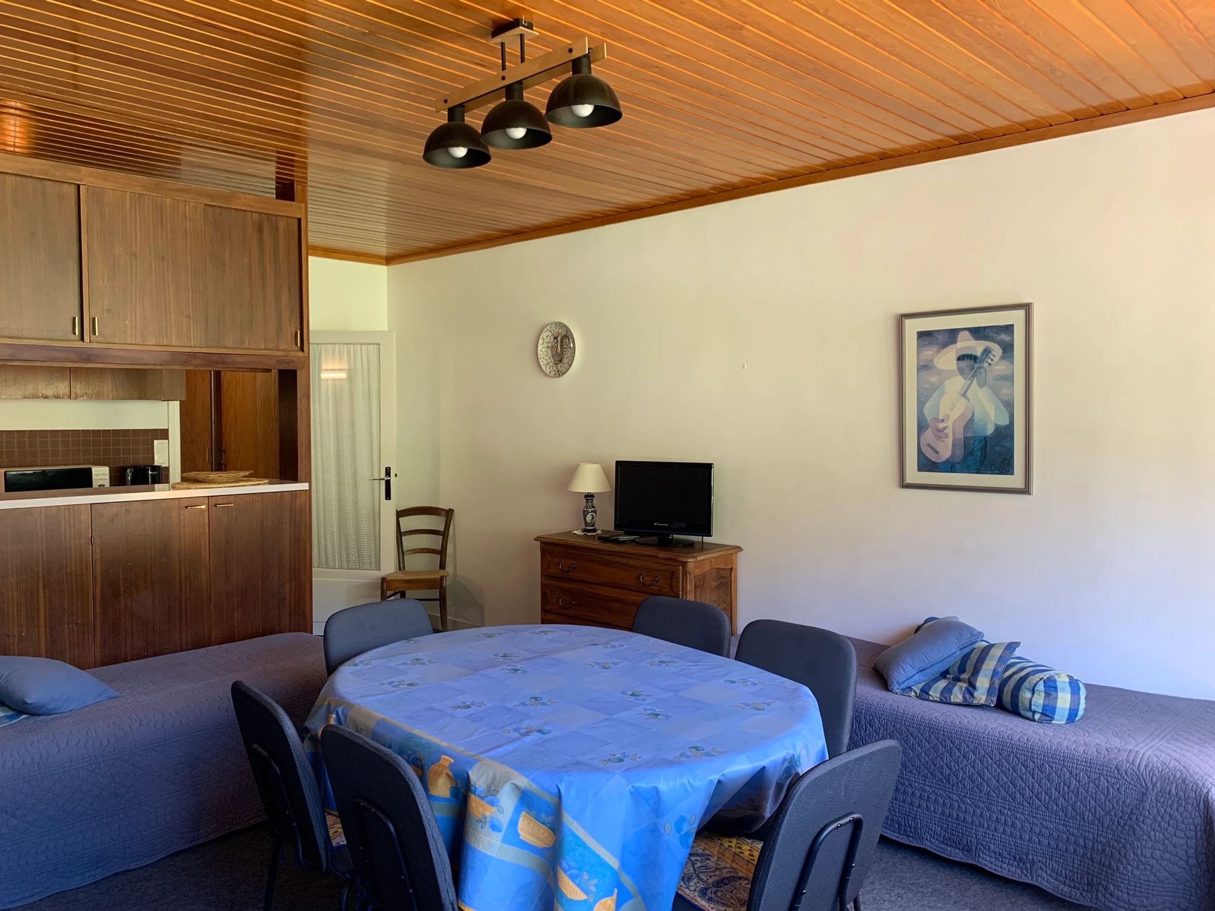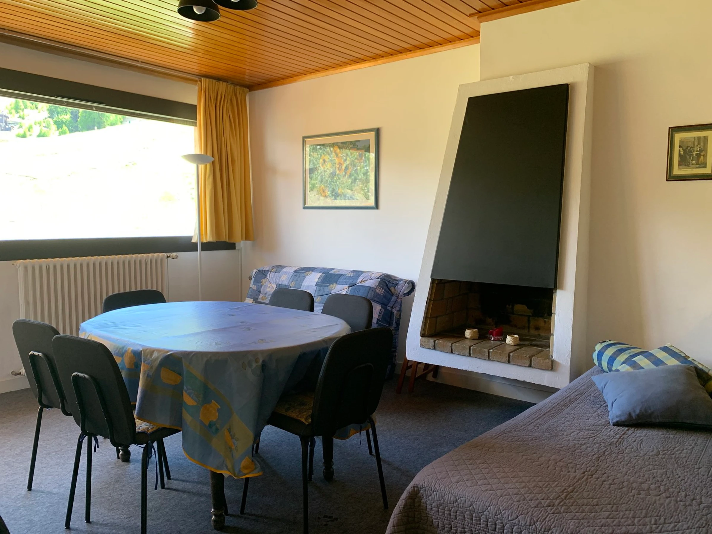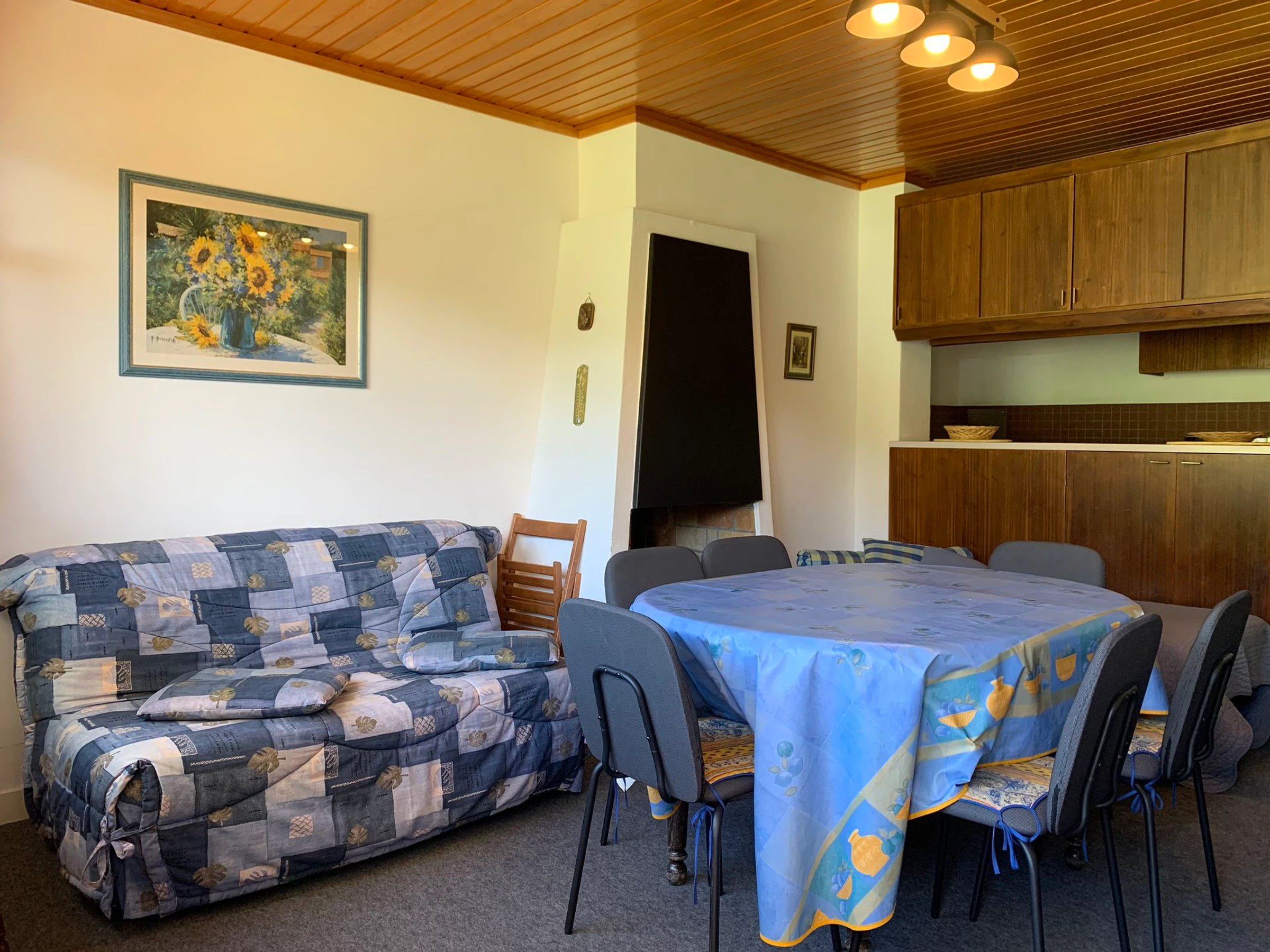 * Séjour : 1 canapé clic clac 2 places, 2 banquettes (lit simple) TV, accès balcon plein Sud, coin repas avec table à manger, moquette au sol, cheminée décorative;