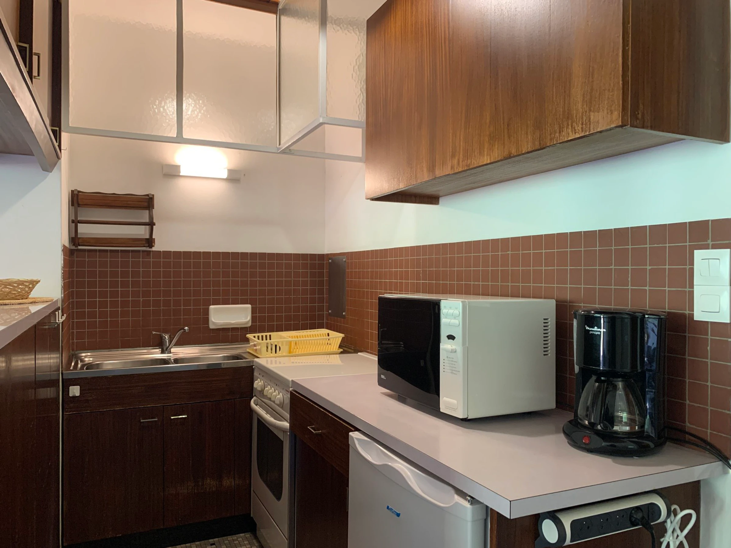 * Cuisine ouverte : frigo, cuisinière, micro-ondes et cafetière filtre ;