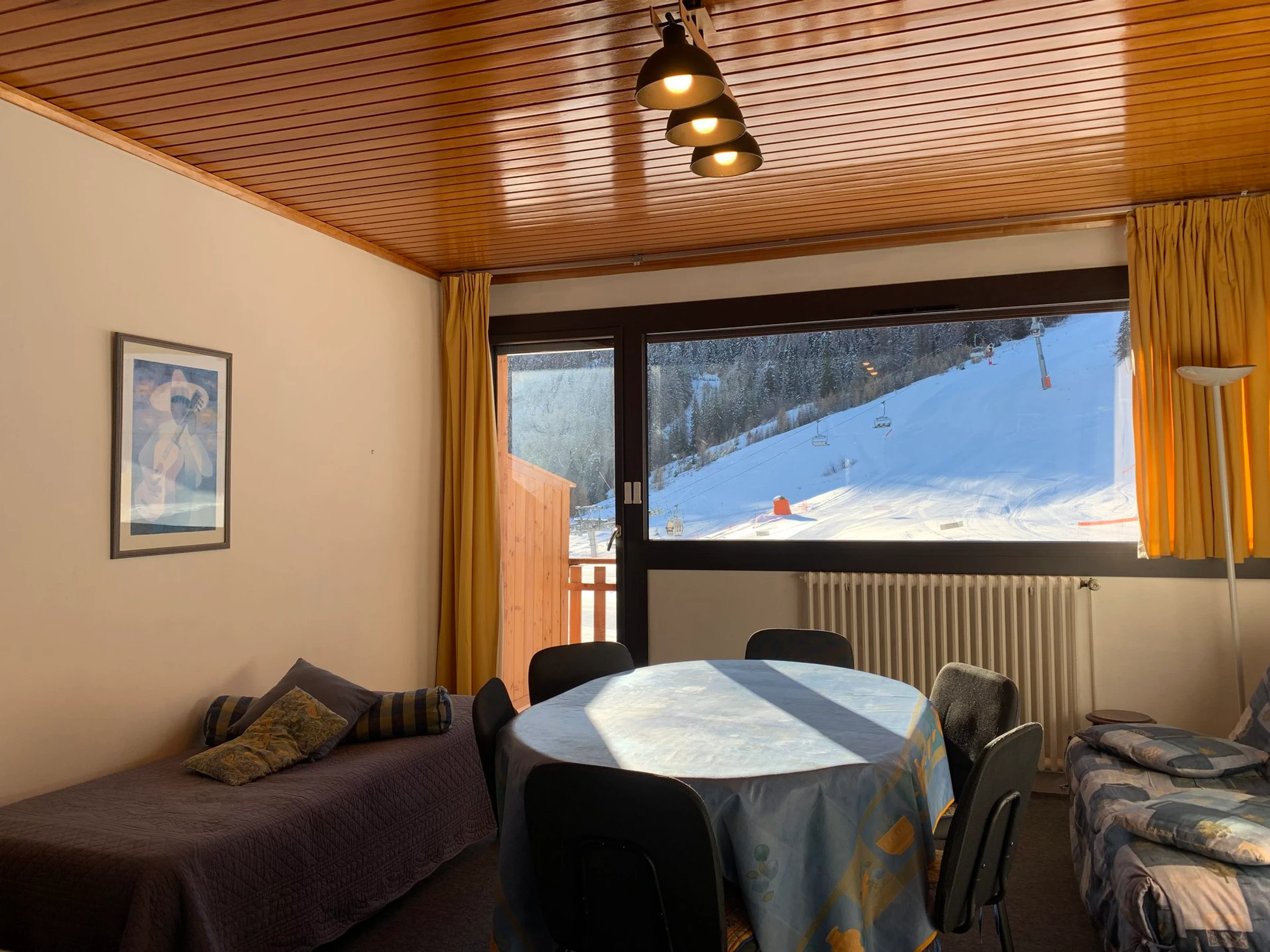 COMMENTAIRES : Appartement avec vue sur les pistes. Salle de bain vieillisante. Très bien situé en front de pistes, devant le point rendez-vous des écoles de ski. Box à skis individuel. Parking réservé à la résidence.