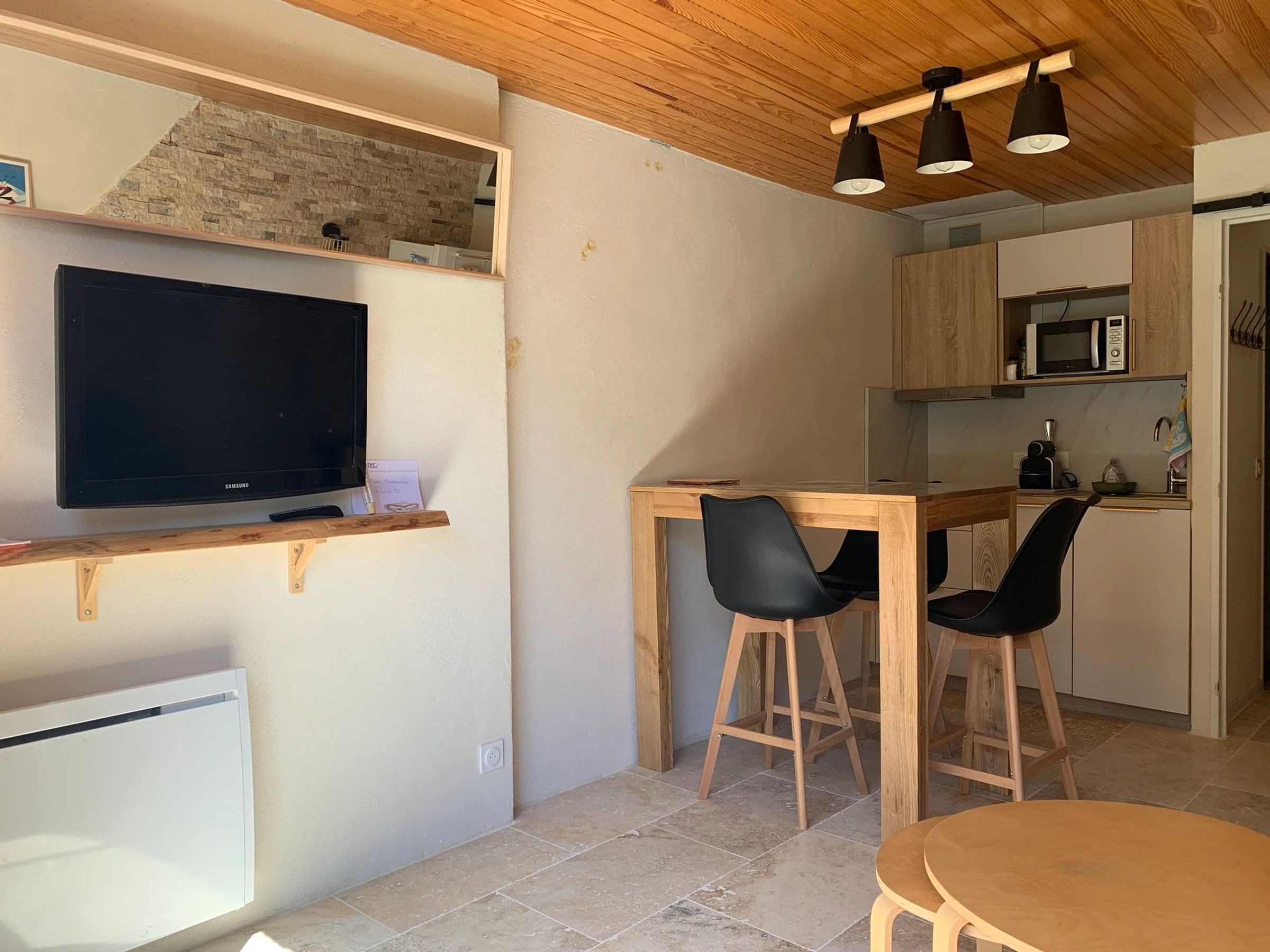 * Séjour : 1 canapé convertible type rapido, TV avec décodeur, meubles de rangement, coin repas, accès balcon, volets électriques ;