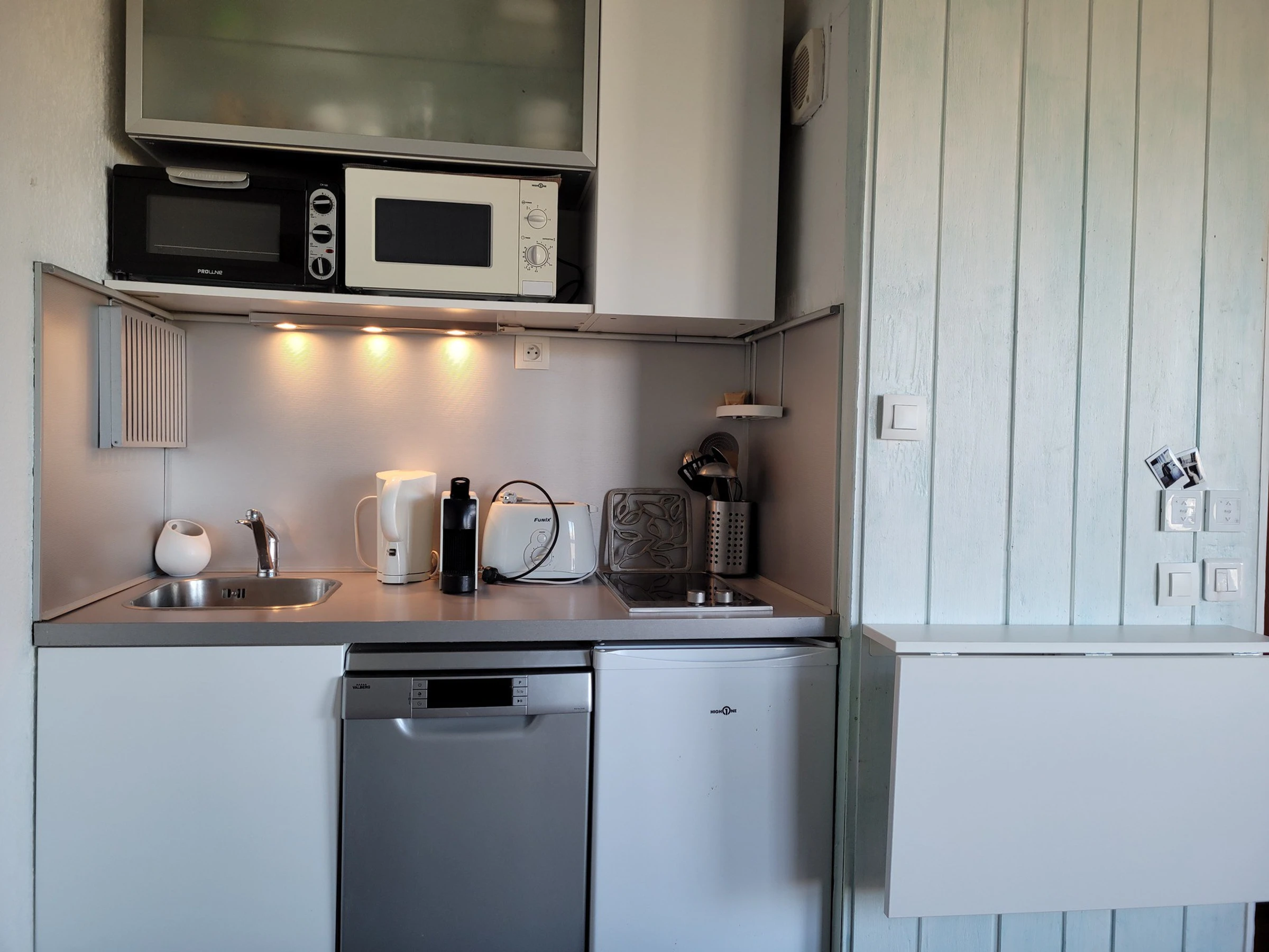 * Coin cuisine : un mini four, un micro-ondes, réfrigérateur top, 2 plaques vitro-céramiques, lave-vaisselle, 1 cafetière nespresso, bouilloire, grille pain;
