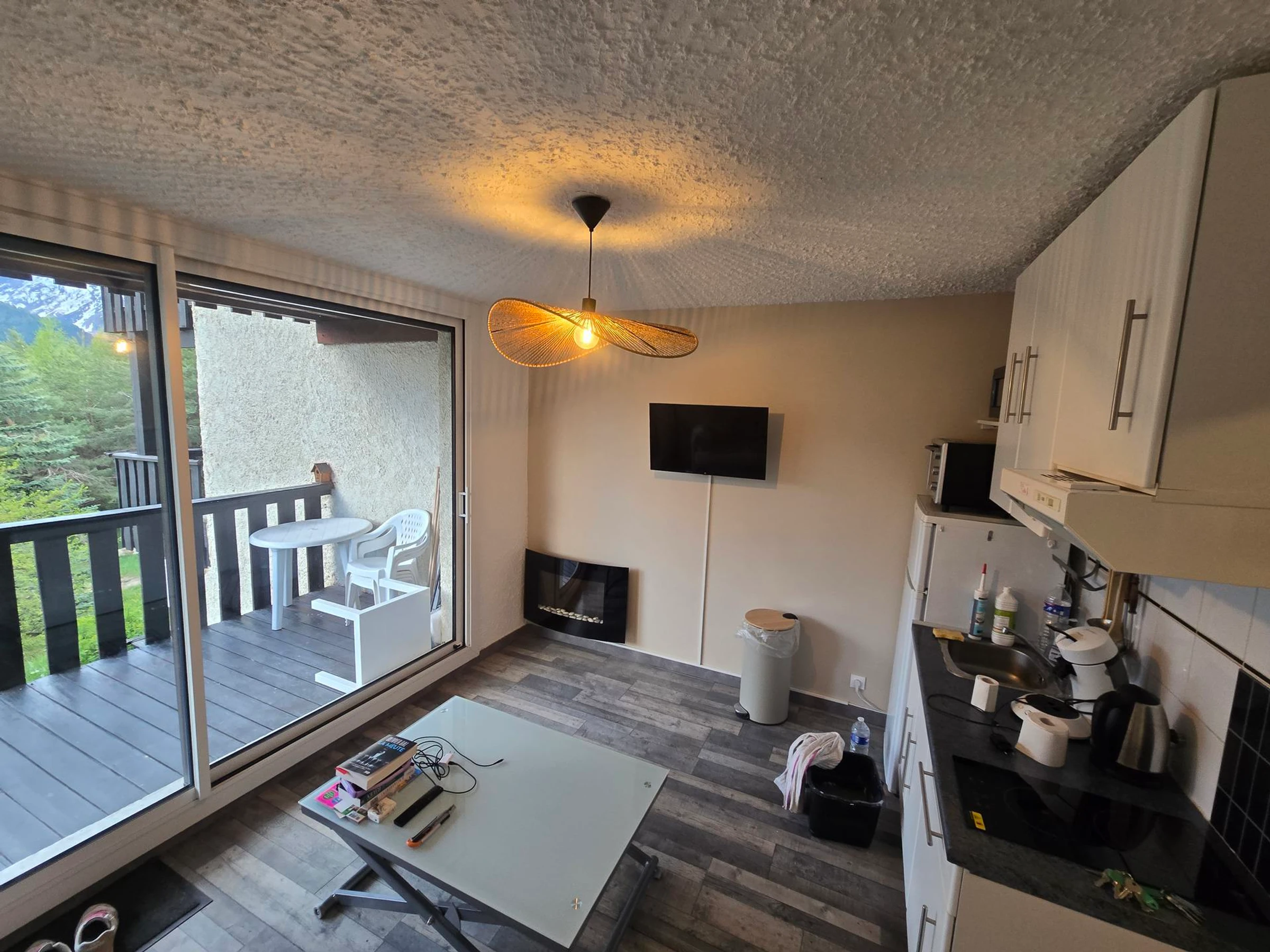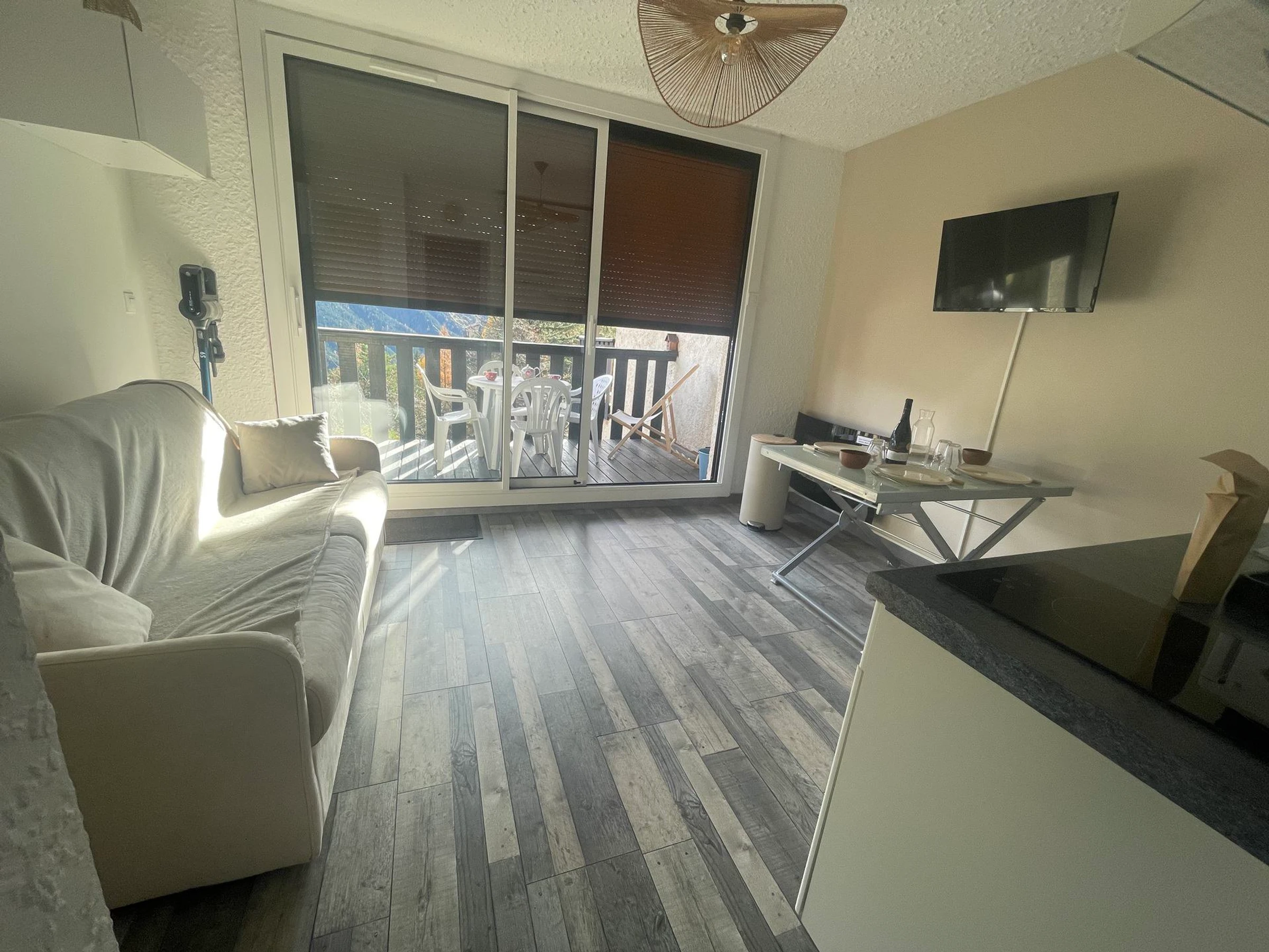 Le séjour : un joli canapé convertible, une table en métal et verre qui se relève, 4 chaises pliantes, une table basse, une télévision, des rangements. Le séjour donne sur un balcon disposant d'une table, des chaises et une chaise longue. La baie vitrée est neuve avec un volet roulant électrique. Il y a un chauffage 'style cheminée'.